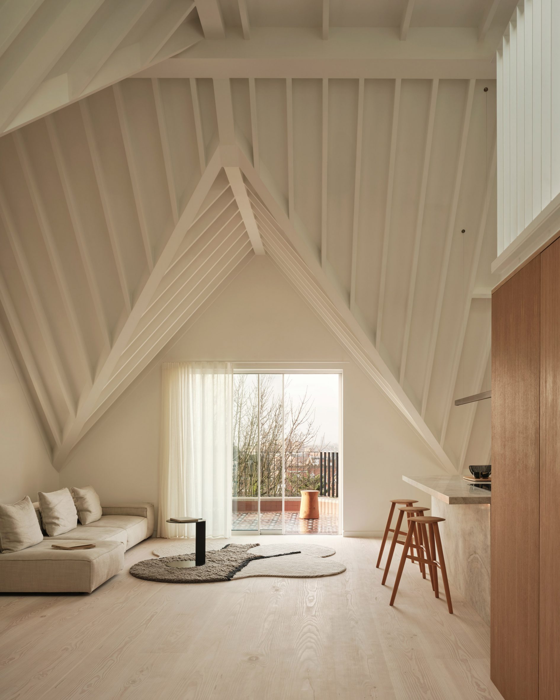 Salon, jadalnia i kuchnia tworzą jednoprzestrzenną, wysoką przestrzeń, której rytm wyznacza linia dachu. Przesuwne, przeszklone drzwi prowadzą na balkon, a ich łukowate obramowanie powtarza kształt połaci dachowej, wzmacniając spójność kompozycyjną. Dzięki temu projekt mieszkania w Londynie łączy funkcjonalność z wyrazistą, konsekwentną narracją architektoniczną.