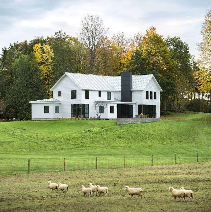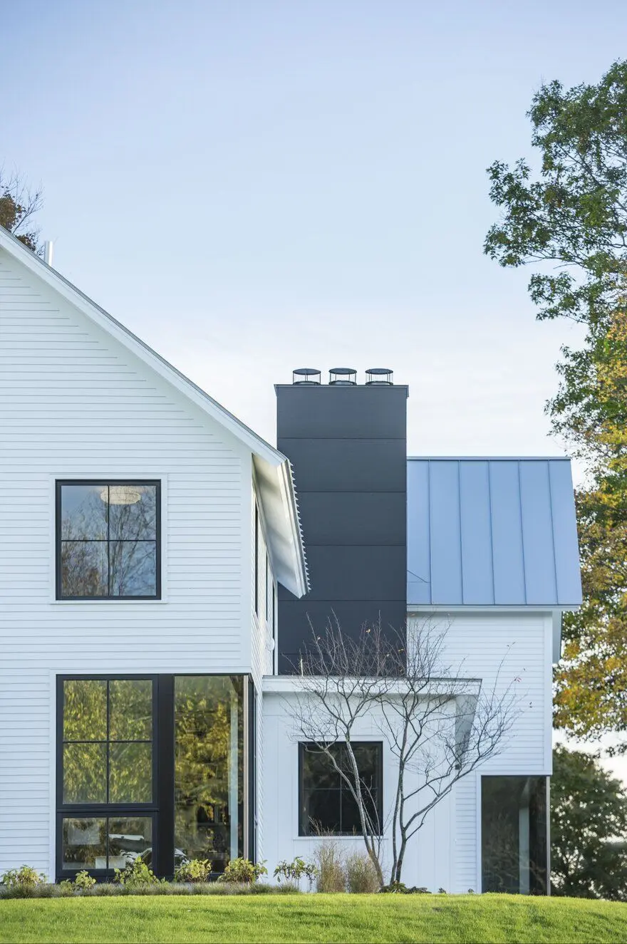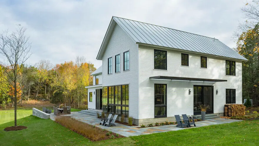 Vermont Modern Farmhosue to dwa w jednym. Projekt firmy Joan Heaton Architects obejmuje bowiem formę dwóch domów z dwuspadowym dachem, których krawędzie są do siebie ułożone prostopadle. Łączy je niski element z dużym przeszkleniem.