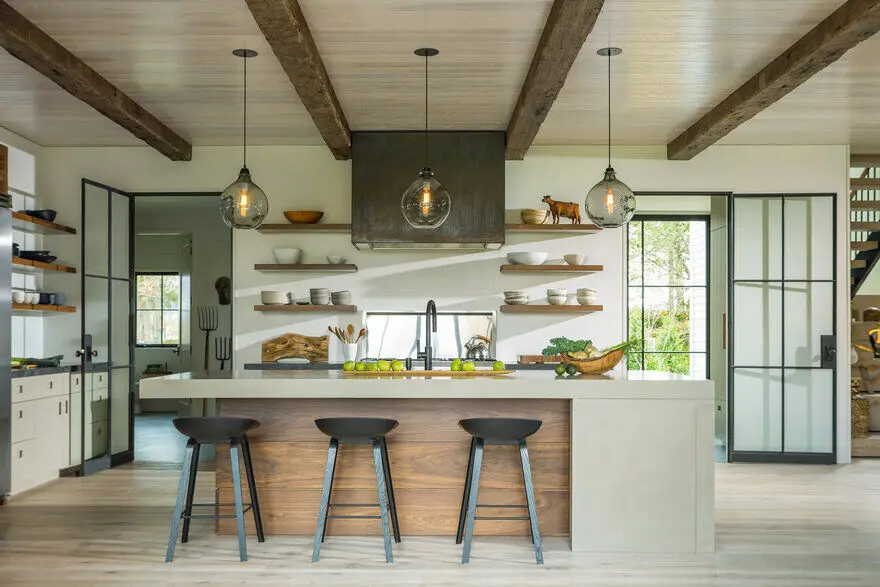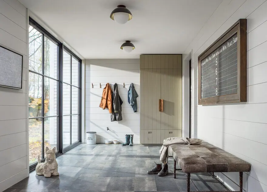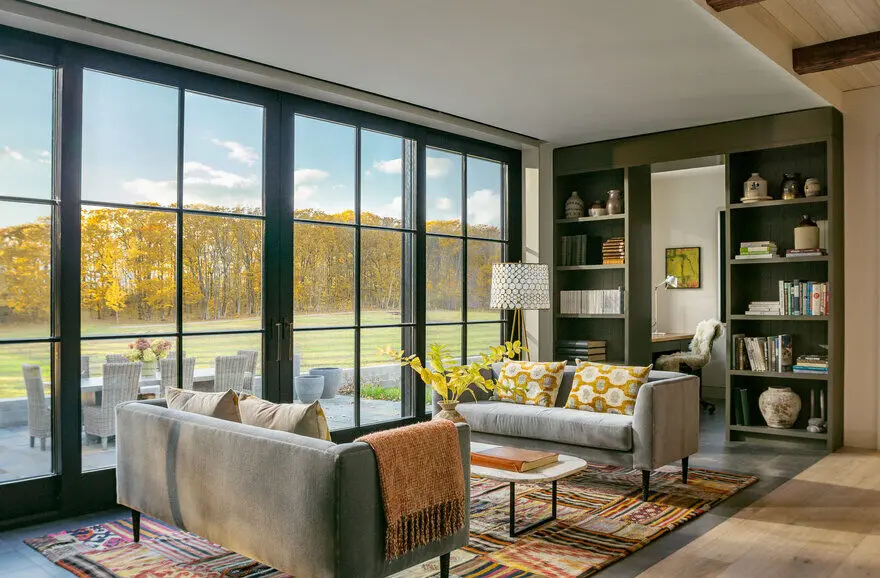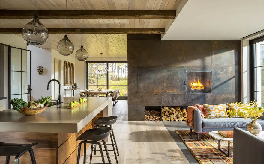 Elegancki, ale farmerski wygląd zewnętrzny domu kontrastuje z jego wnętrzem, które wprowadza materiały bogate w tekstury i różne odcienie patyny. Pojawiają się więc drewniane sufity, drzwi ze stali i szkła, podłogi z białego dębu oraz oryginalna ściana z kominkiem.Ostateczny efekt jest wynikiem uważnego słuchania potrzeb klienta i doskonałej współpracy z projektantką, która w tym przypadku jest też właścicielką domu.