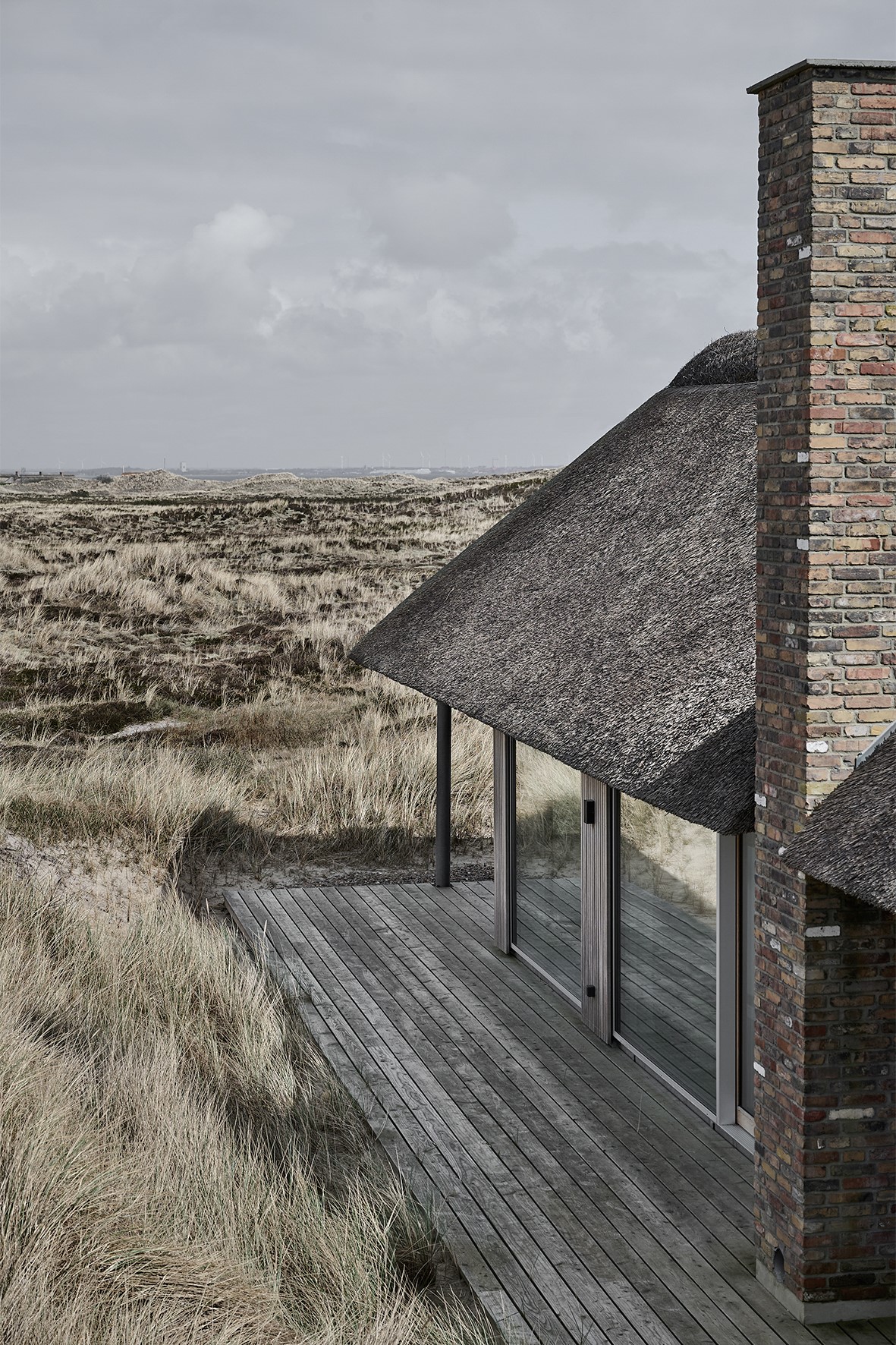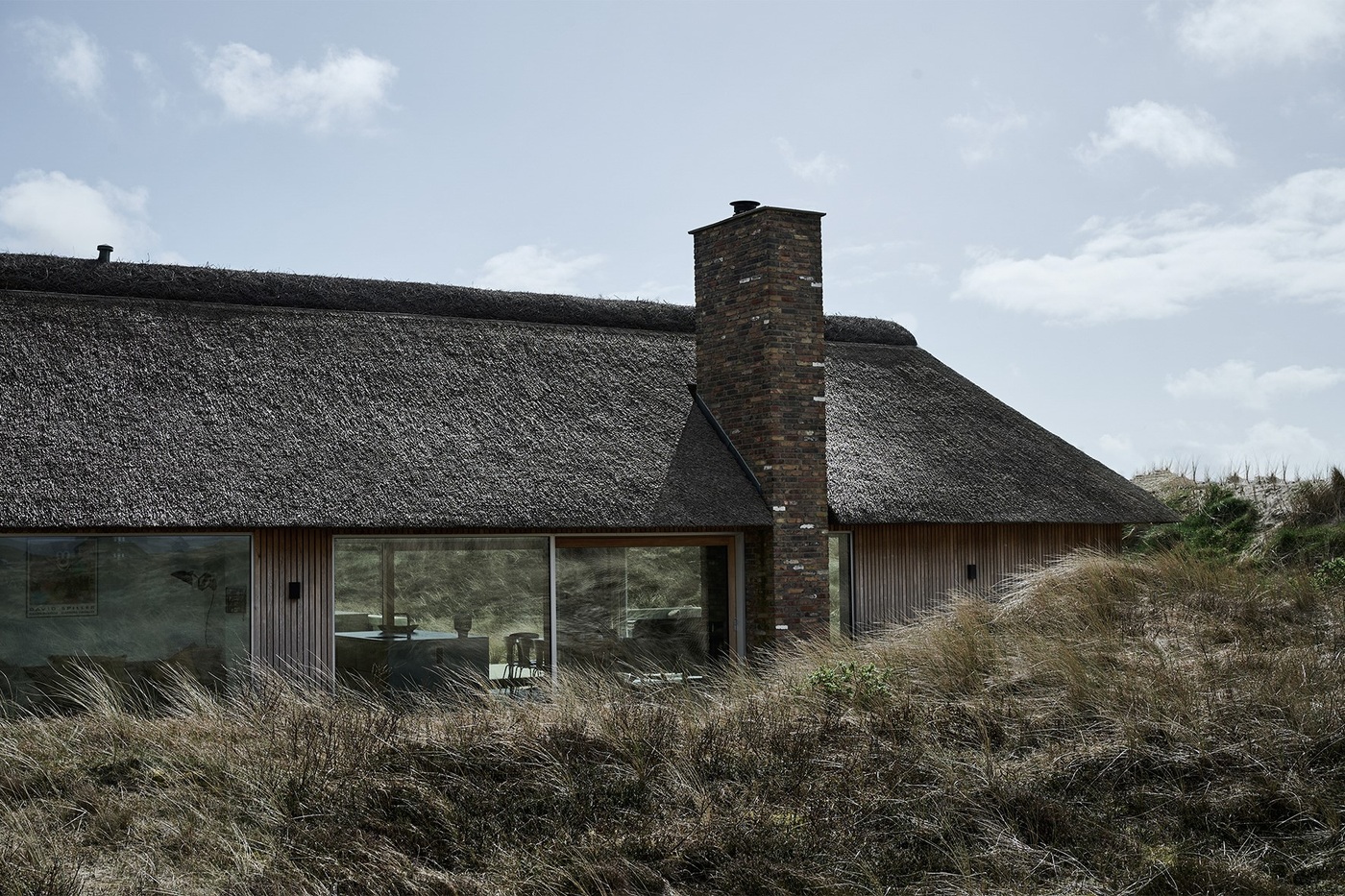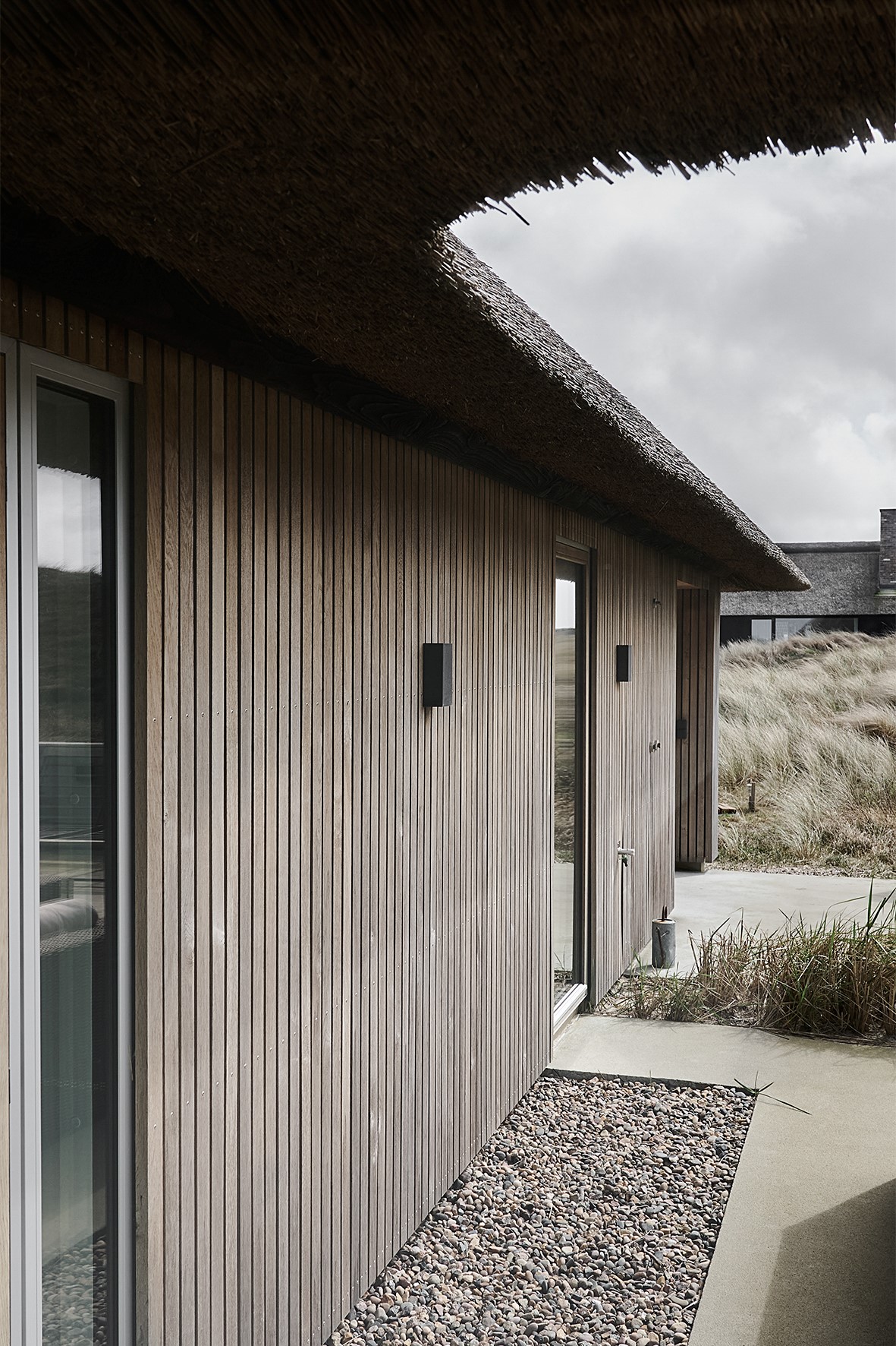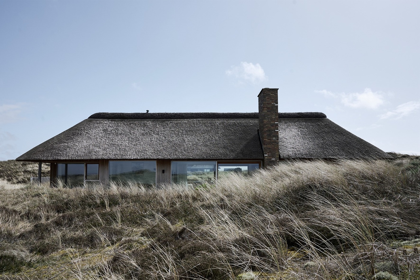 Otoczony wydmami i roślinnością nadmorską dom wtapia się w pejzaż, tworząc spójną całość z naturą. Jego subtelna forma i paleta materiałów sprawiają, że architektura jest tu nie tyle obiektem, ile elementem żywego krajobrazu – zmieniającego się wraz z rytmem dnia, wiatru i światła.