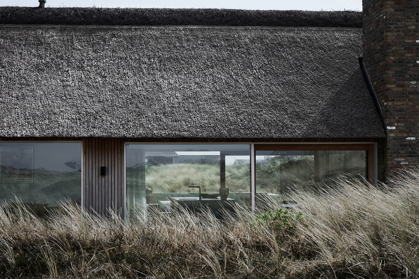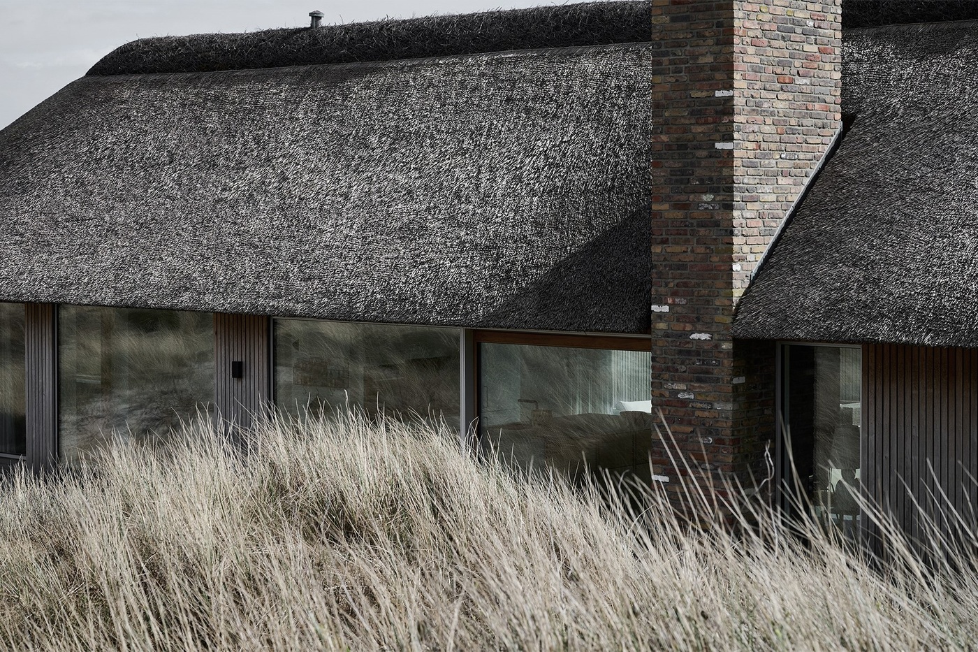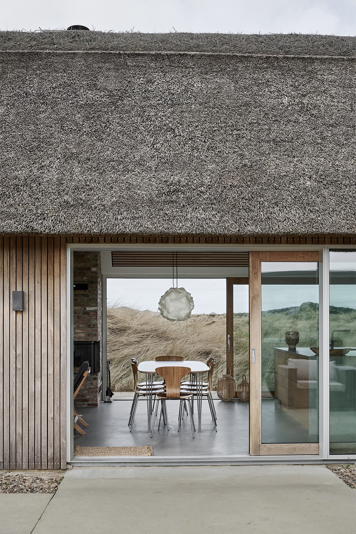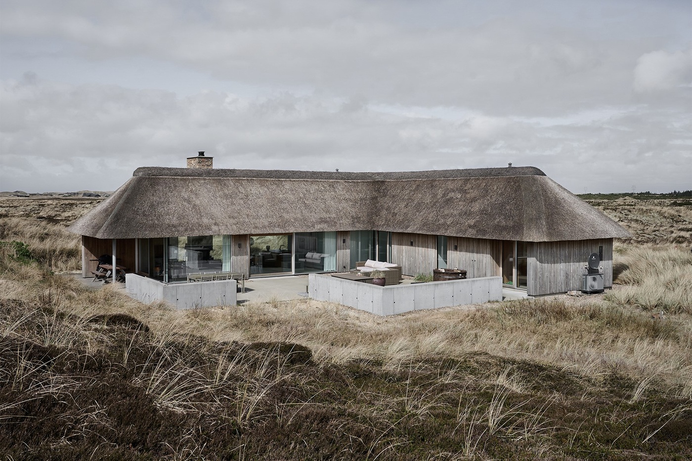 Tekst FB + IG: Letni dom nad Vesterhavet łączy tradycyjną strzechę z nowoczesną geometrią. Beton, dąb i naturalne materiały tworzą architekturę, która elegancko wpisuje się w krajobraz wydm.