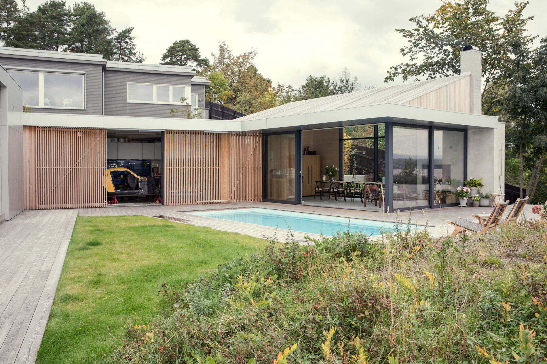 Istniejący tu wcześniej dom zbudowano w oparciu o modułowy system stworzony przez norweską firmę Moelven. Projekt Skapa miał natomiast podkreślić jego pozytywne cechy. Studio skupiło się więc na odświeżeniu i podkreśleniu typowej, dwuspadowej formy domu. Usunięto okapy dachu i wymieniono deski na cedrowe. Dzięki temu osiągnięto bardziej prostą i współczesną estetykę. „Ukryte rynny i drobne zmiany stworzyły bardziej określony kształt, który reprezentuje architekturę naszych czasów” mówią przedstawiciele firmy.