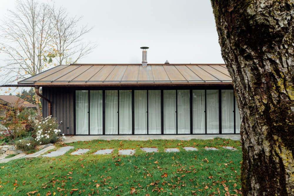 Konstrukcja dobudowy bazuje na drewnianych słupach, osadzonych na betonowym fundamencie piwnicznym, co zapewnia stabilność i trwałość. Elewacja została wykończona drewnianą okładziną, zgodnie z lokalnym stylem architektonicznym, podkreślając naturalny charakter budynku. Z kolei niski dach z szerokimi okapami, pokryty naturalnie patynowaną miedzią, dodaje budynkowi elegancji i trwałości, podkreślając jego historyczno-nowoczesny charakter.
