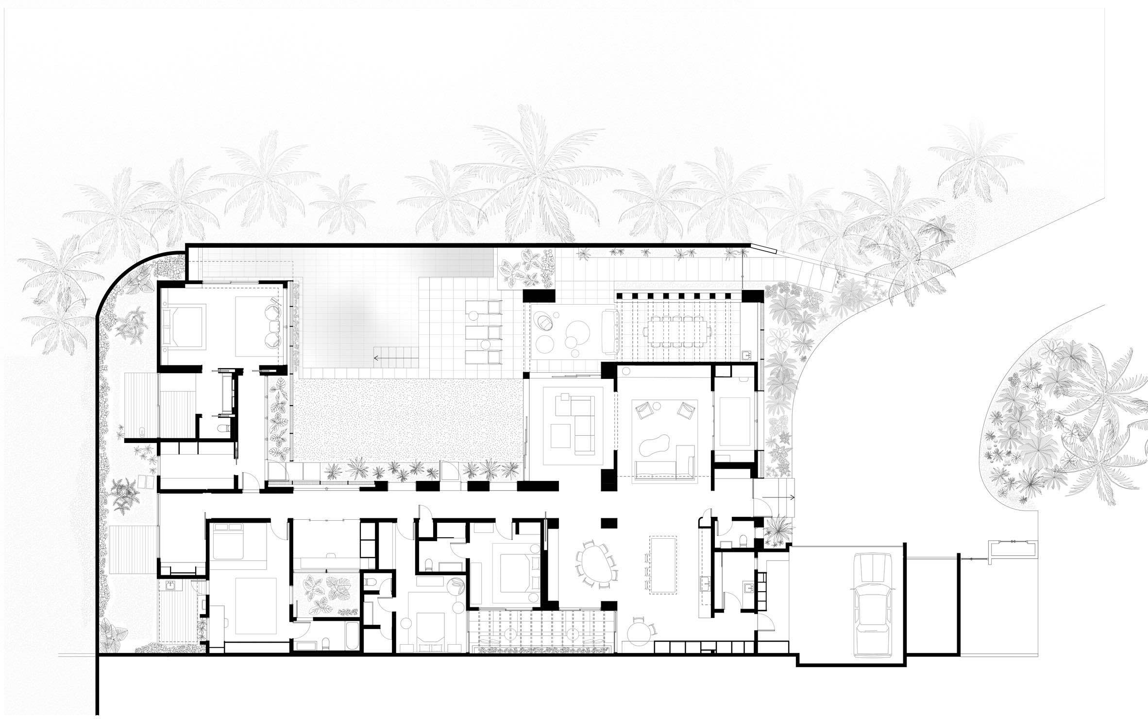Projekt zakłada maksymalne otwarcie na zieleń. W budynku zaprojektowano aż jedenaście wyjść na zewnątrz, dzięki czemu kontakt z ogrodem jest niemal nieprzerwany. Między ekranami z terakoty a elewacjami umieszczono bujne nasadzenia, a w ogrodzie zaplanowano basen biegnący wzdłuż sypialni głównej. Wnętrza płynnie przechodzą w tarasy i dziedzińce, tworząc jednolitą przestrzeń życia.