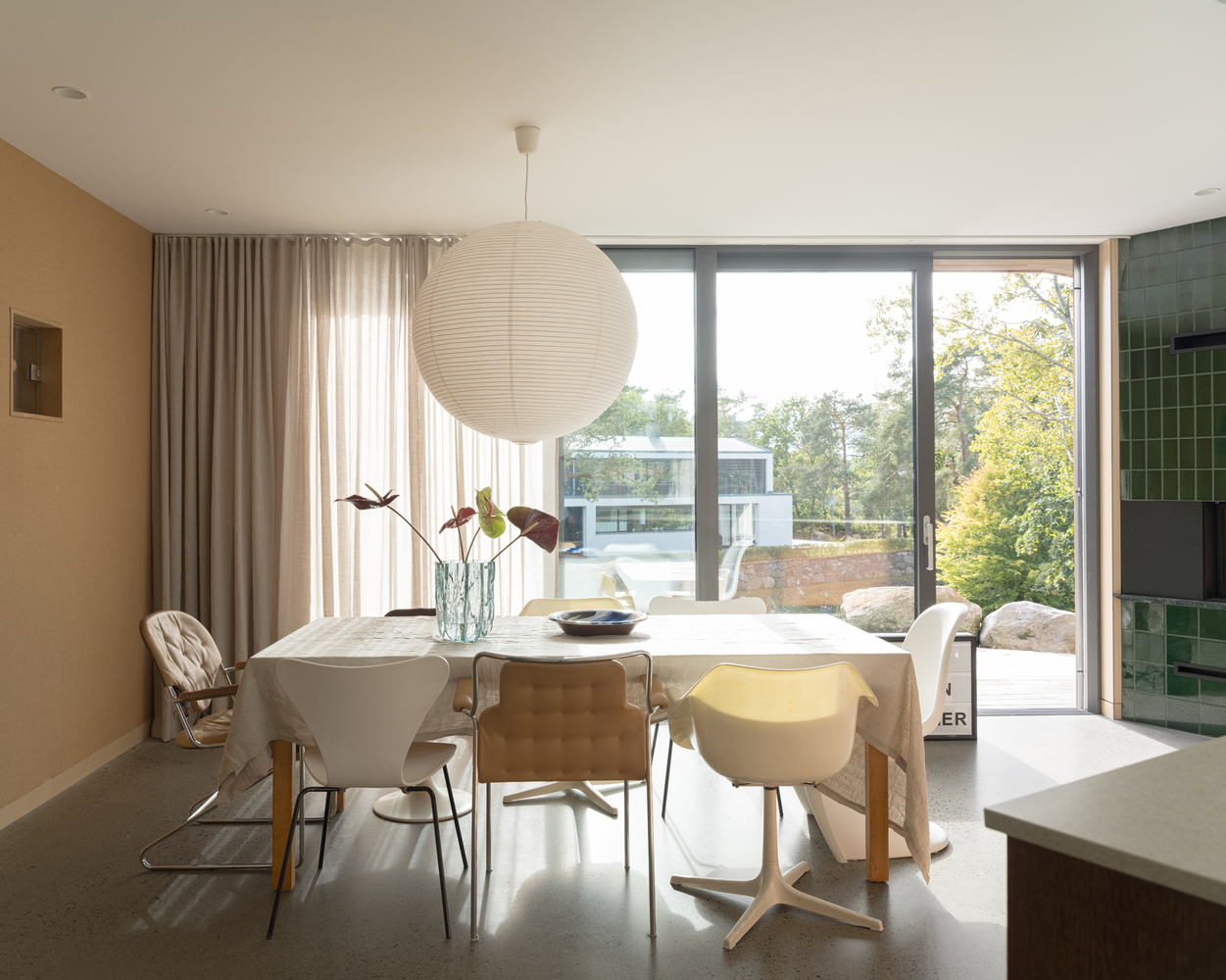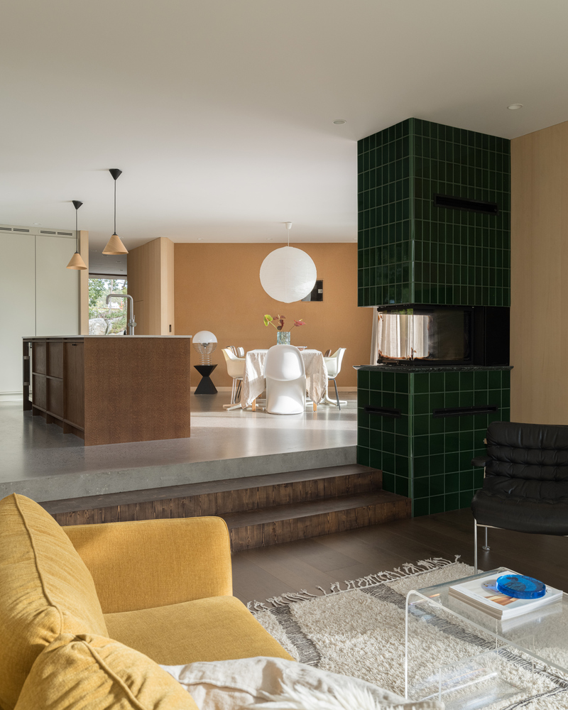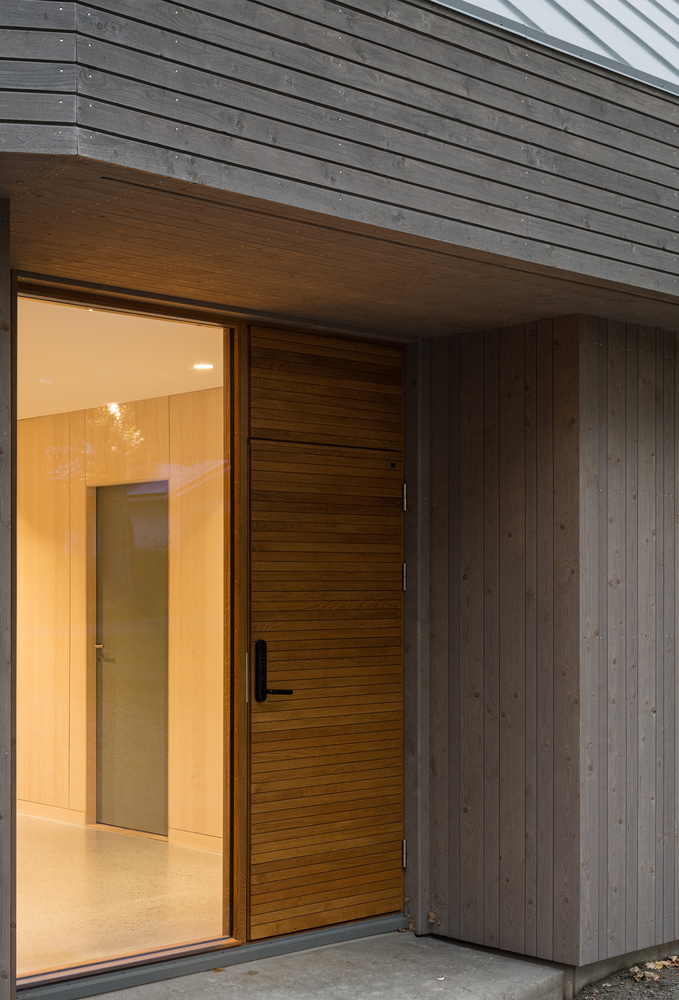 Wnętrza zdobią ręcznie wykonane panele z forniru brzozy, które nadają przytulności i nawiązują do naturalnych krajobrazów. Polerowana betonowa podłoga, wzbogacona lokalnym kruszywem, nawiązuje do przybrzeżnego pejzażu. Architektoniczne detale, takie jak horyzontalne panele drewniane otaczające dom i duże panoramiczne okno w salonie, nadają willi wyjątkowy charakter.