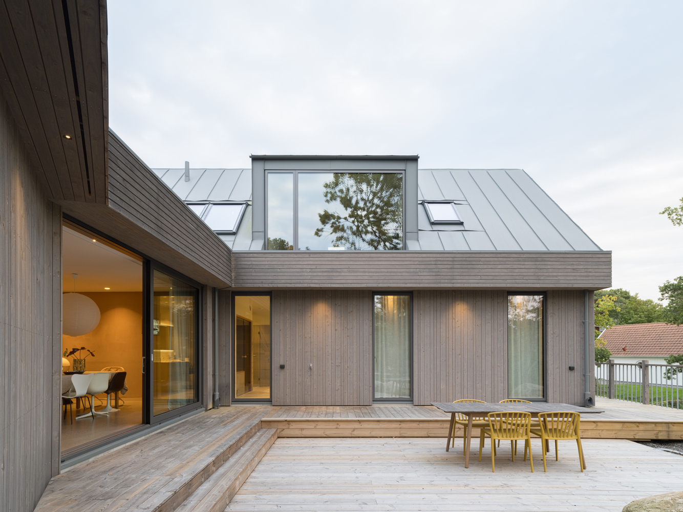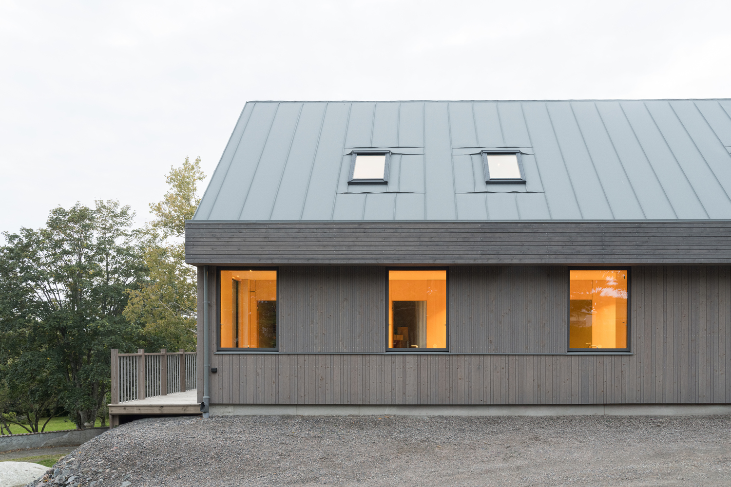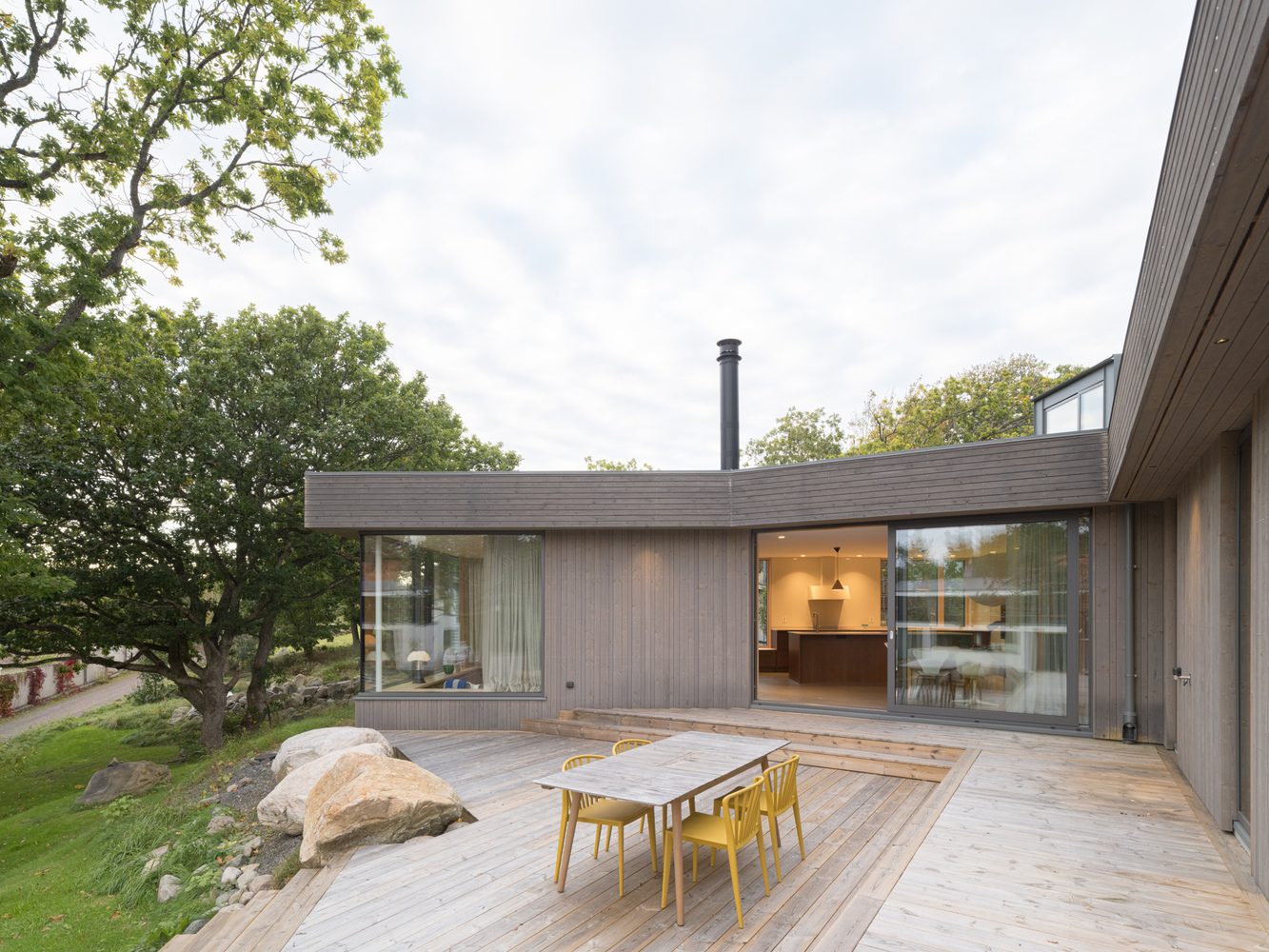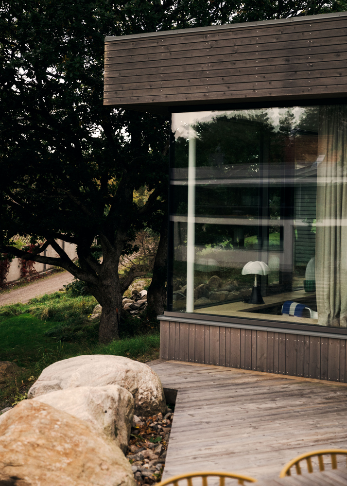 Wybór materiałów odzwierciedla charakter miejsca – parter obłożony jest surowym drewnem świerkowym, które z czasem nabierze srebrzystej patyny, komponując się z typowym dla zachodniego wybrzeża Szwecji szarym granitem. Piętro pokryte szarym aluminium nie tylko współgra estetycznie z otoczeniem, ale również jest trwałe i odporne na wilgotny, słony klimat nadmorski.
