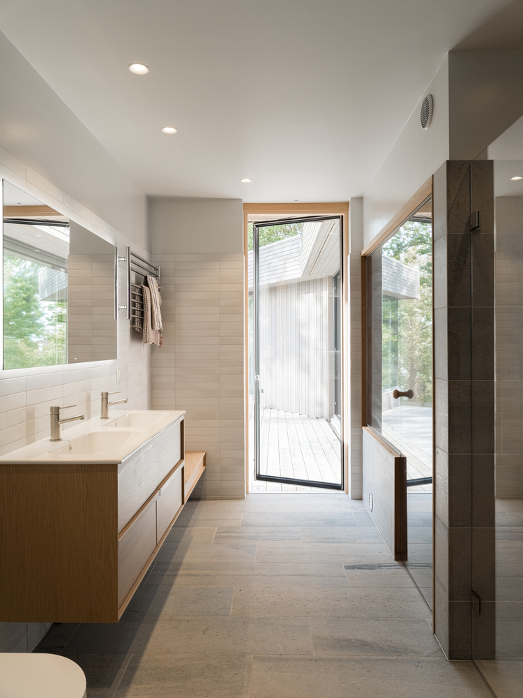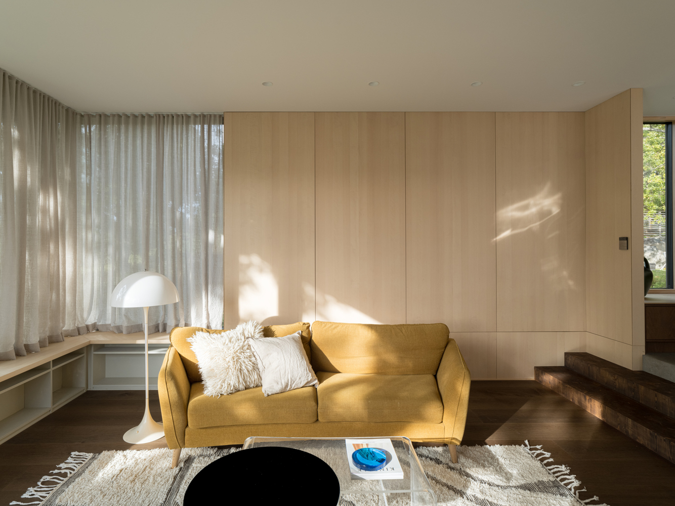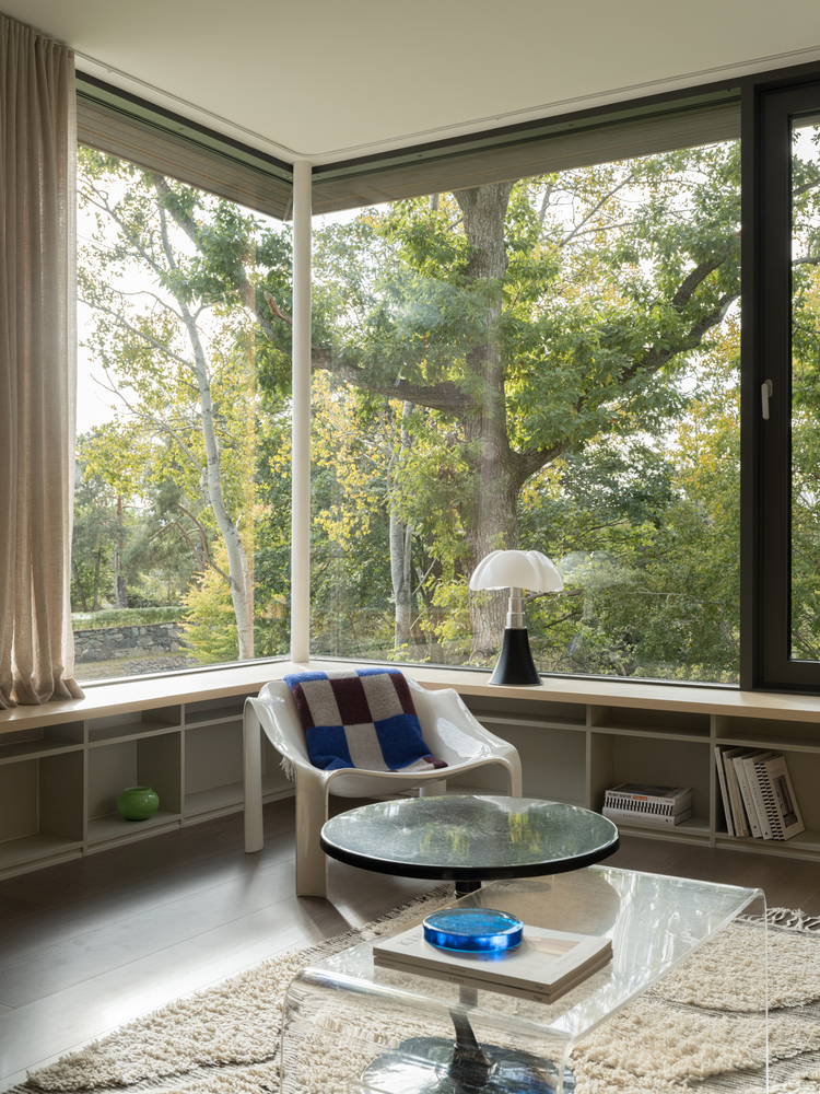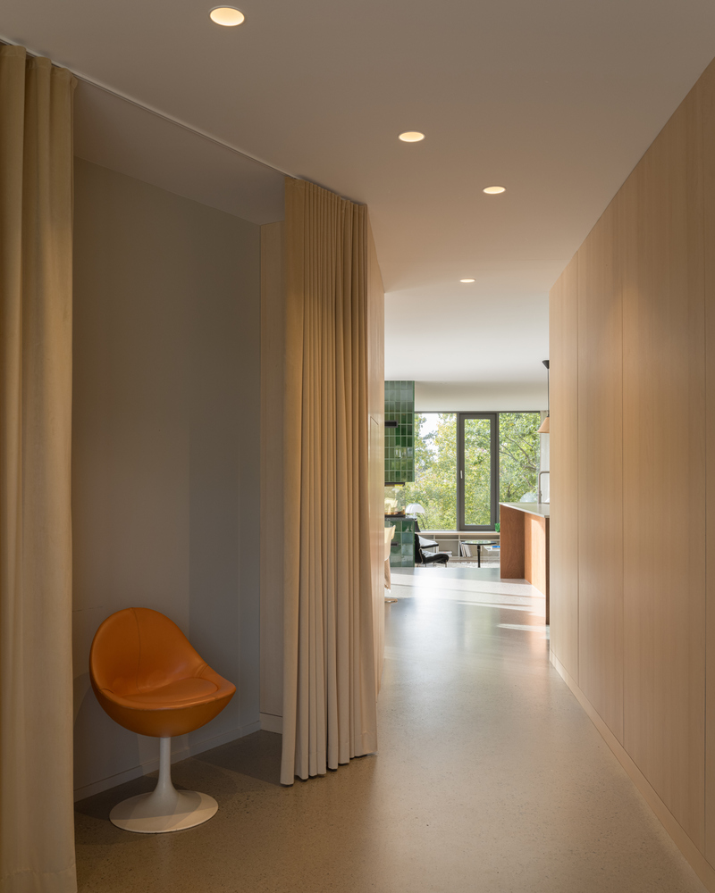 Szklane ściany salonu zapewniają obfitość naturalnego światła i bliskość do starych dębów w dolnej części ogrodu. Korytarz pełni nie tylko funkcję komunikacyjną, ale także oferuje przestrzeń do czytania i integruje strefy prywatne i publiczne. Każdy pokój ma wyjście na taras lub do ogrodu, zachęcając domowników do rozszerzenia przestrzeni życiowej na zewnątrz.