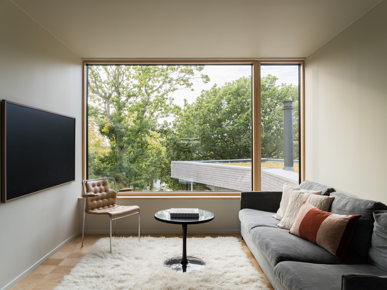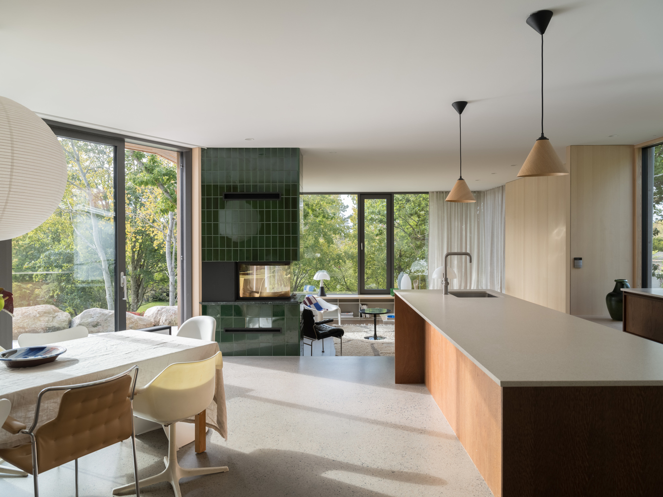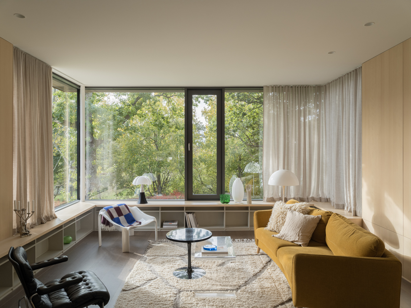 Szklane ściany salonu zapewniają obfitość naturalnego światła i bliskość do starych dębów w dolnej części ogrodu. Korytarz pełni nie tylko funkcję komunikacyjną, ale także oferuje przestrzeń do czytania i integruje strefy prywatne i publiczne. Każdy pokój ma wyjście na taras lub do ogrodu, zachęcając domowników do rozszerzenia przestrzeni życiowej na zewnątrz.
