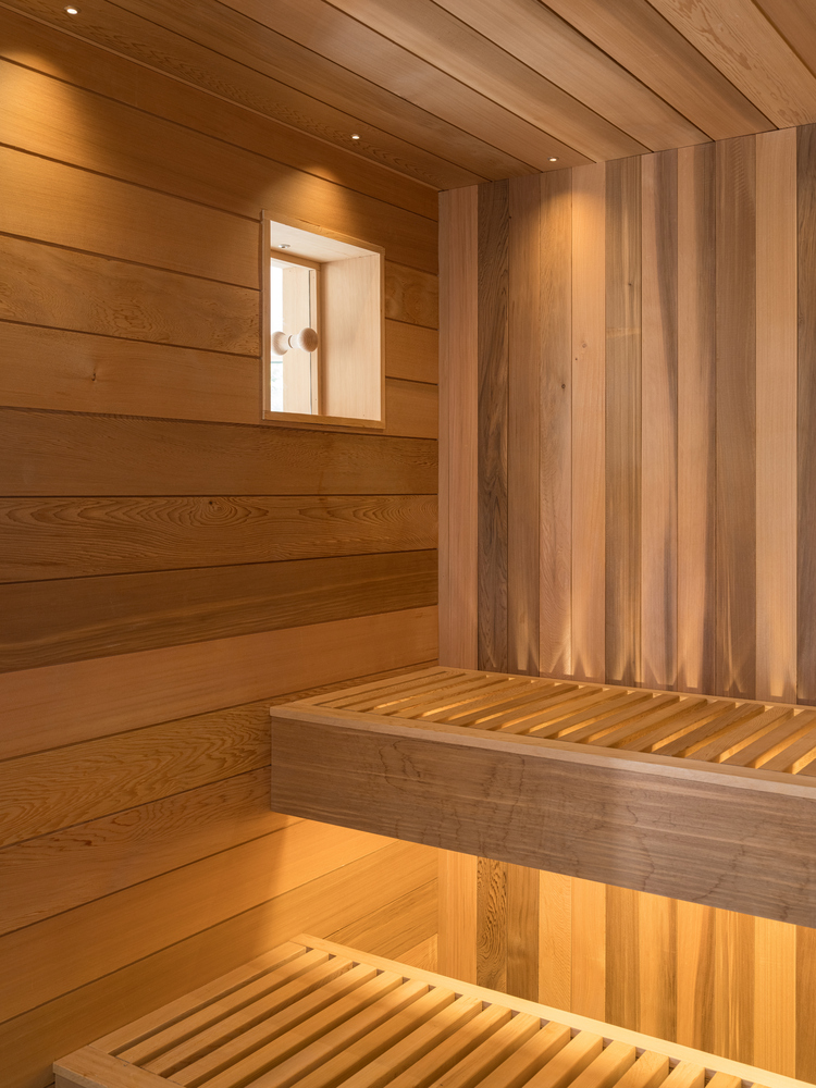 Mały, ale istotny element to okno między sauną a jadalnią, które nie tylko jest funkcjonalne, ale dodaje przestrzeni subtelny, zabawny akcent.