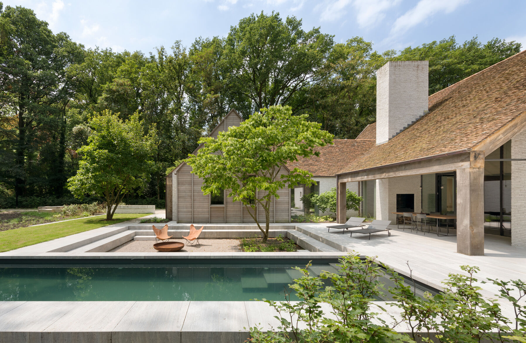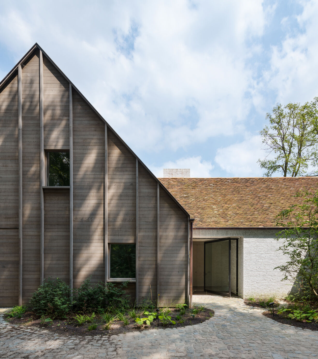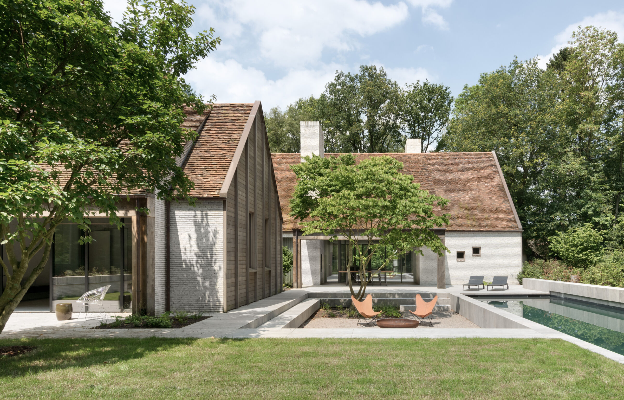 Klienci tego projektu nie chcieli sztywnych brył z płaskimi dachami i wyraźnie poprosili architektów o stworzenie czarującego projektu. Pod względem projektowym zaowocowało to wyborem klasycznego dachu dwuspadowego. Konsekwencją było również zastosowanie tradycyjnych materiałów, takich jak lite dębowe belki i bordowe dachówki. Położenie różnych brył i ich połączenia pomyślano w czysty i minimalistyczny sposób, zapewniając w ten sposób współczesną interpretację klasycznego tematu.