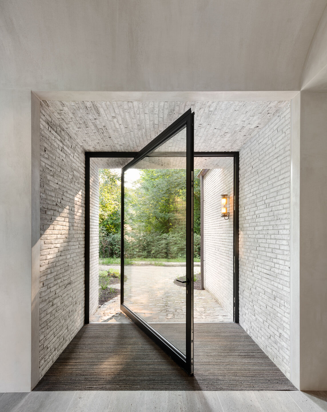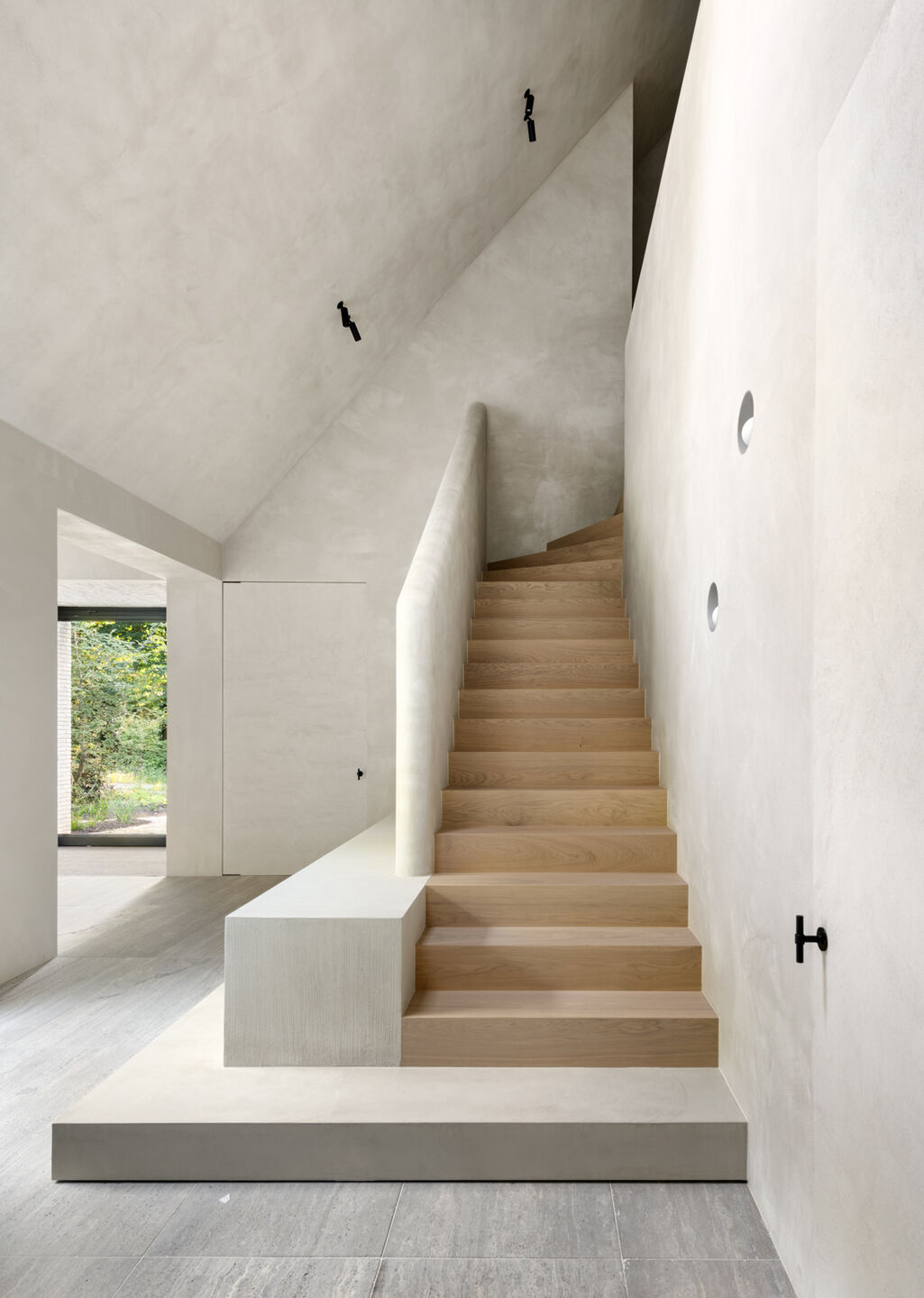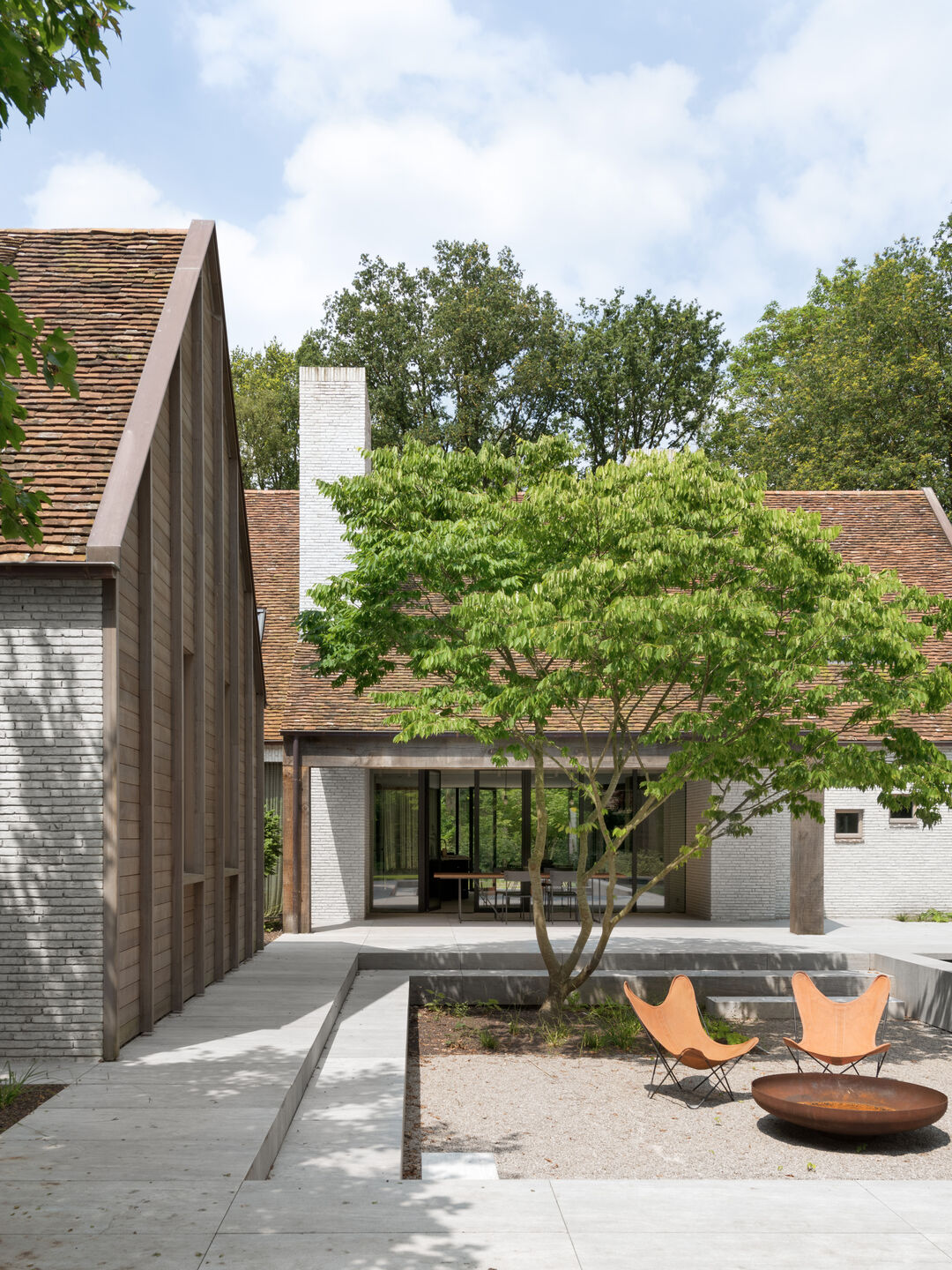 Klienci tego projektu nie chcieli sztywnych brył z płaskimi dachami i wyraźnie poprosili architektów o stworzenie czarującego projektu. Pod względem projektowym zaowocowało to wyborem klasycznego dachu dwuspadowego. Konsekwencją było również zastosowanie tradycyjnych materiałów, takich jak lite dębowe belki i bordowe dachówki. Położenie różnych brył i ich połączenia pomyślano w czysty i minimalistyczny sposób, zapewniając w ten sposób współczesną interpretację klasycznego tematu.