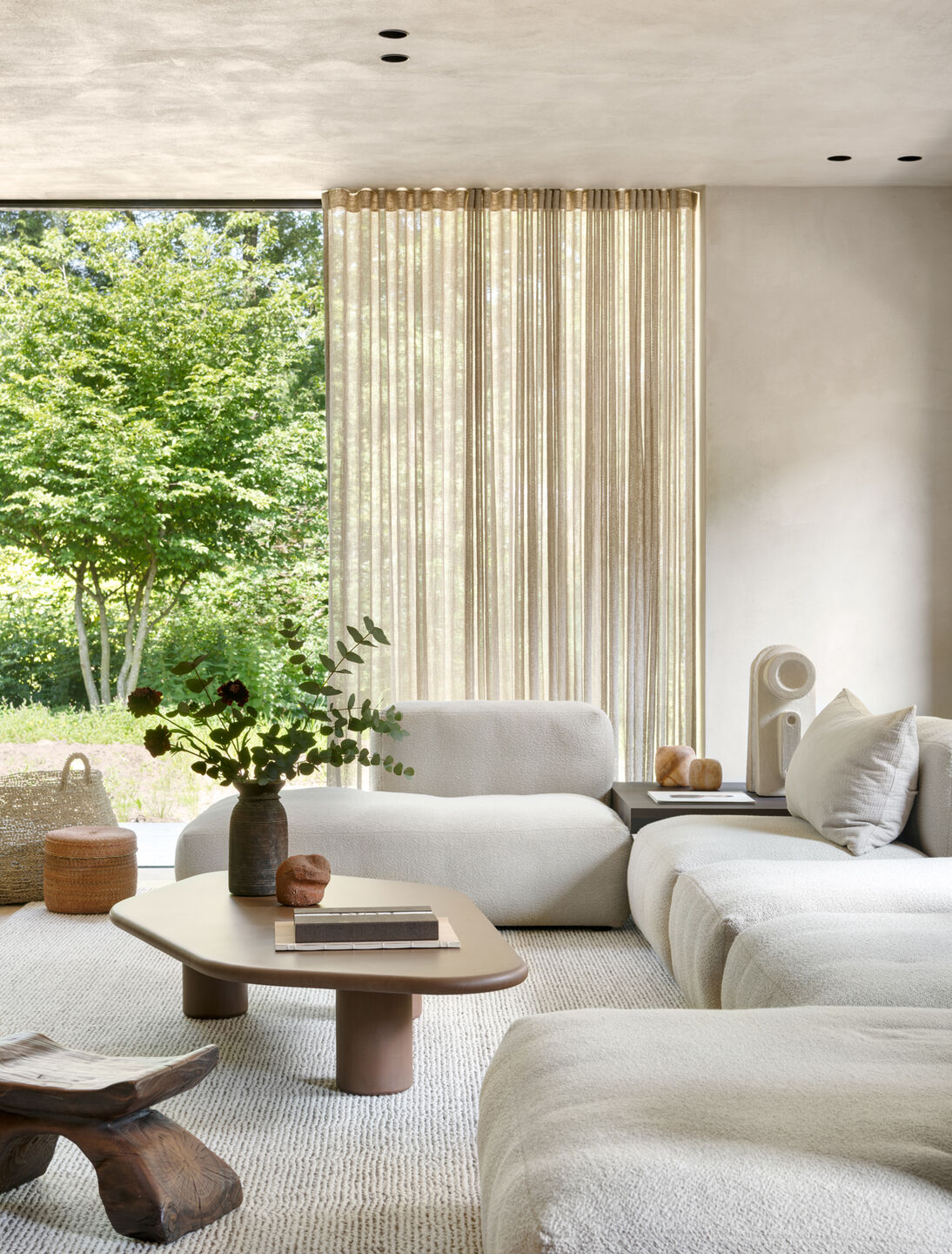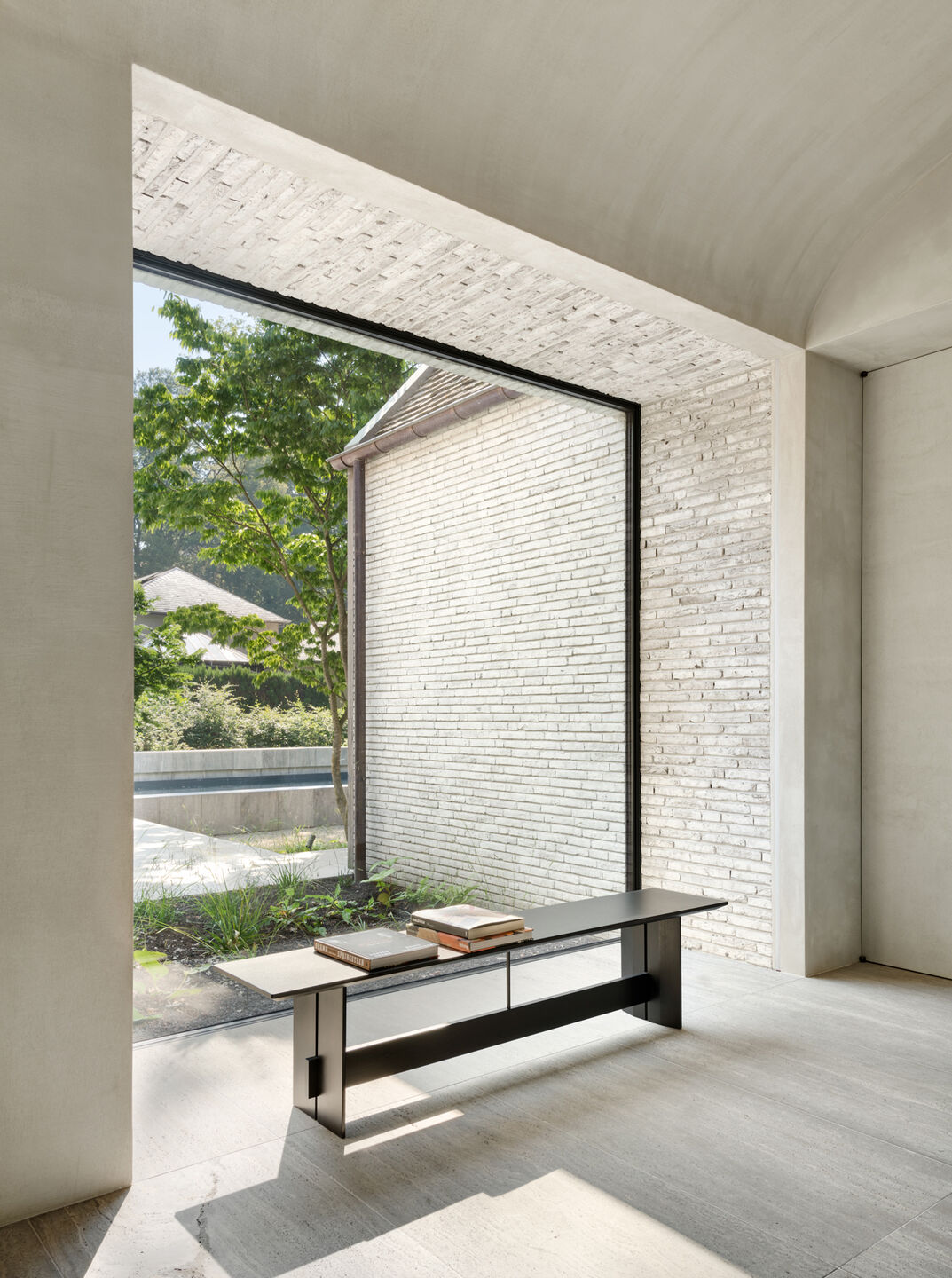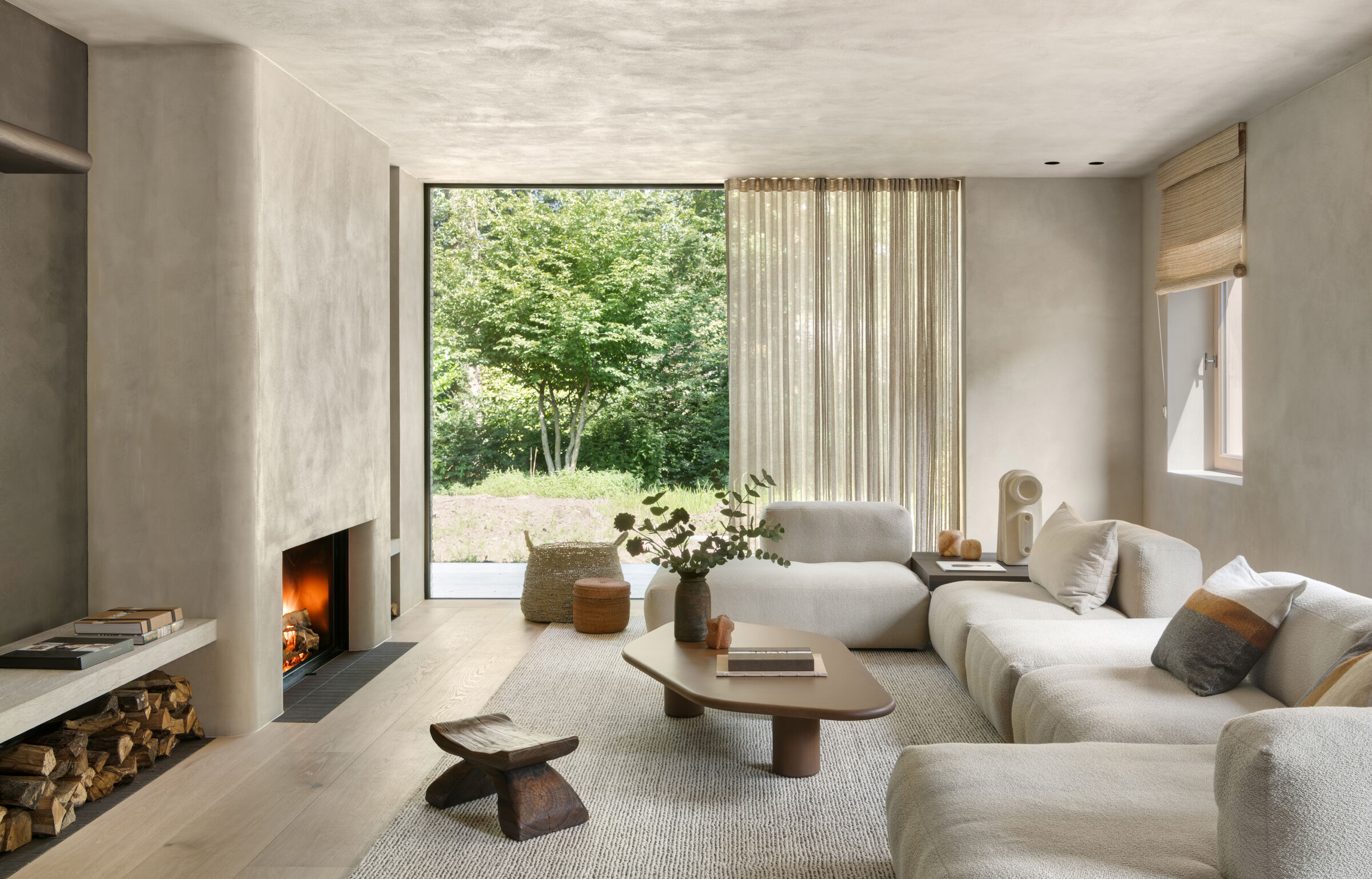 Meble wykonano głównie z dębu. Niuanse odcieni brązu, które sprawiają, że ten materiał jest tak bogaty, tworzą ciepły i ziemisty klimat. Jego naturalny charakter idealnie pasuje do podłóg z trawertynu, które z kolei przechodzą od wewnątrz na zewnątrz. Kuchnia i jadalnia, z widokiem na ogród zarówno z przodu, jak i z tyłu, stanowią dynamiczne serce projektu. Część wypoczynkową zaprojektowano jako miejsce odpoczynku. Monumentalny loft, znajdujący się obok kuchni, płynnie łączy się z zadaszonym tarasem z drewnianym sufitem. Na pewno nie mogło tam zabraknąć zewnętrznego kominka, który wykonano na zamówienie, dzięki czemu można go używać również jako grilla.