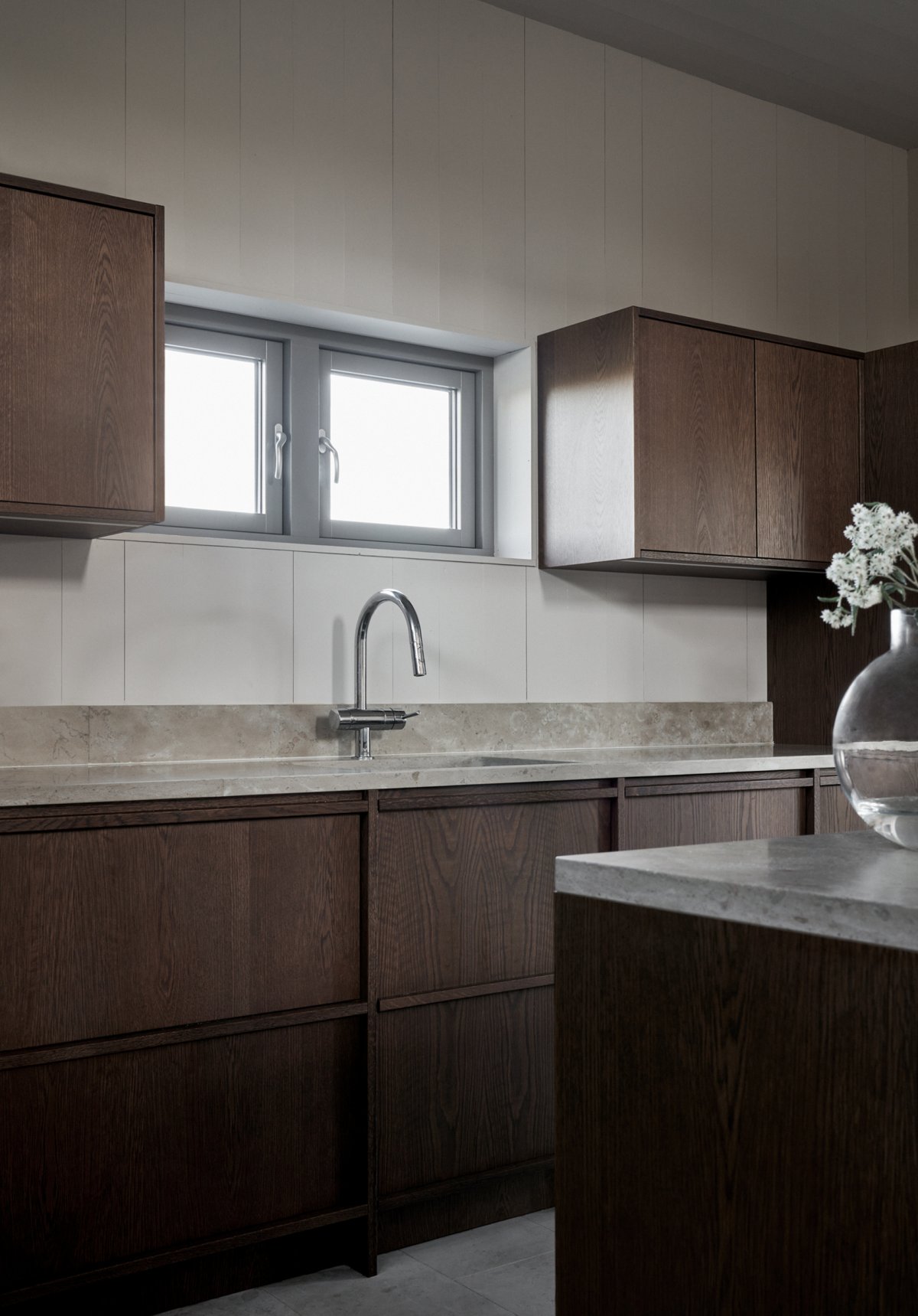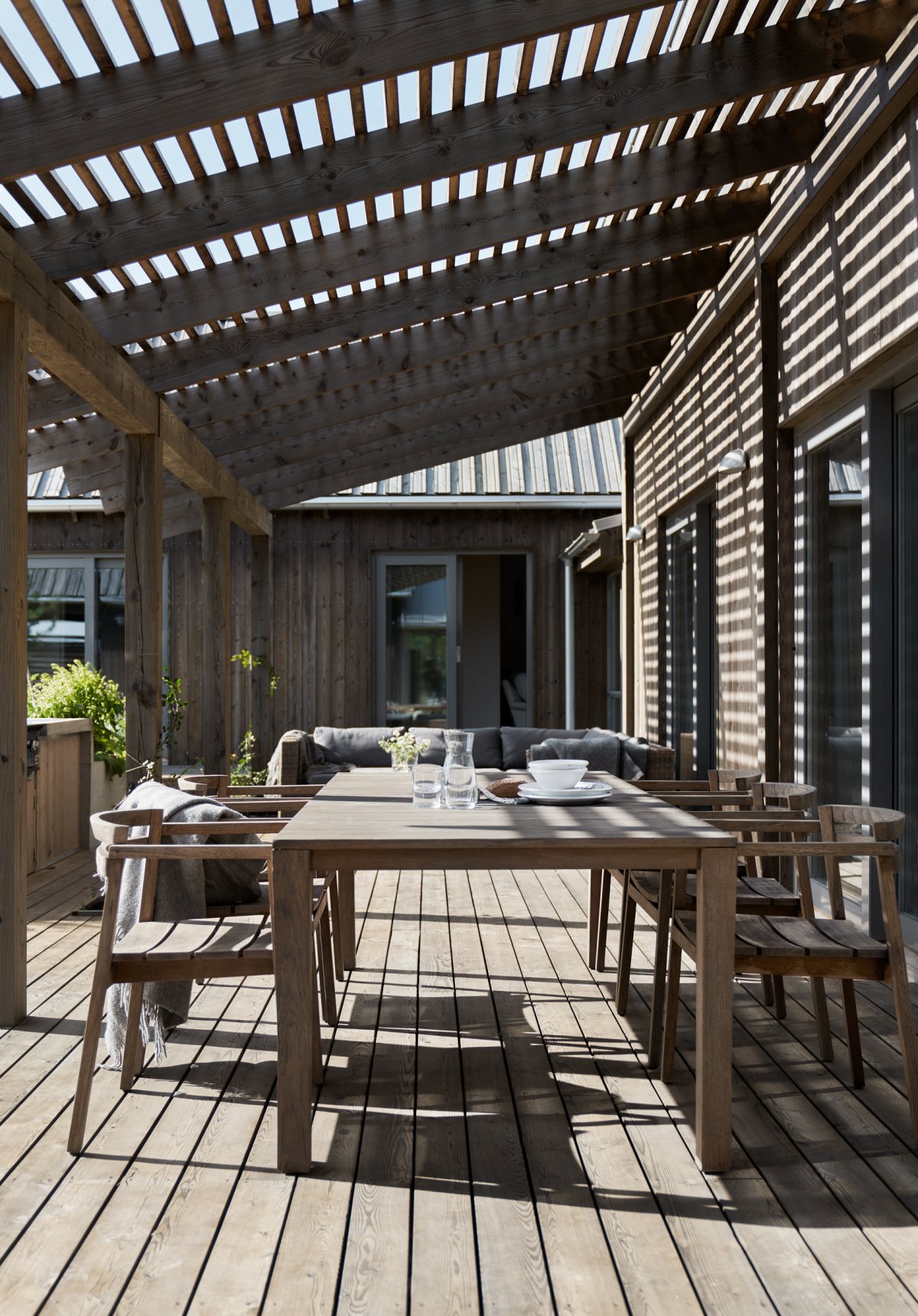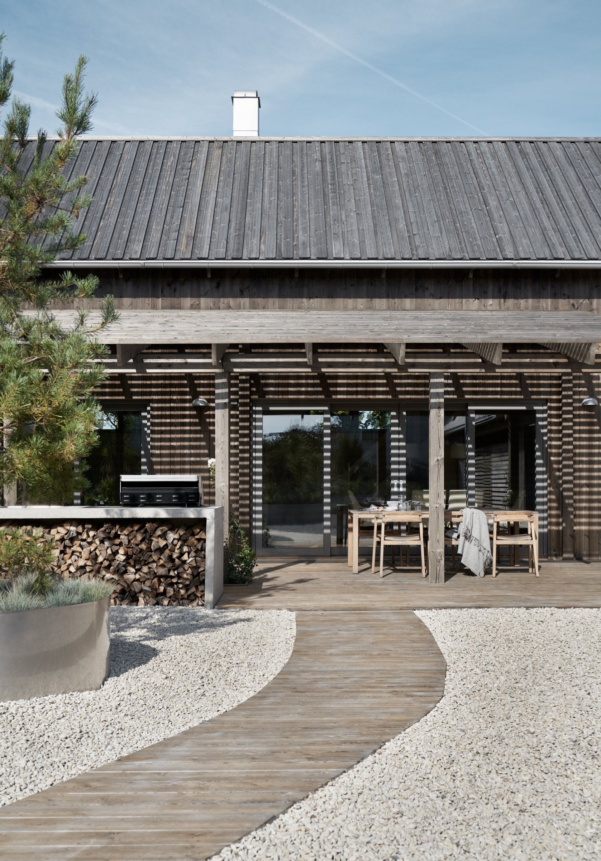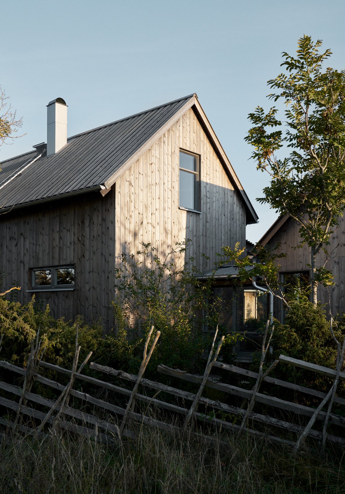 Villa Magnergard, położona na malowniczym Fårö, łączy w sobie elementy tradycyjnej architektury z nowoczesnymi rozwiązaniami. Budynek składa się z trzech połączonych ze sobą brył, tworząc charakterystyczny kształt litery "U". Jego naturalna szara elewacja wykonana z drewna sosnowego oraz drewna stropowego na dachu nadaje mu wyjątkowy, ponadczasowy wygląd. Drewno, odpowiednio obrobione, w ciągu kilku tygodni przybiera naturalny, szary kolor, co idealnie wpisuje się w filozofię projektowania z szacunkiem do przyrody.