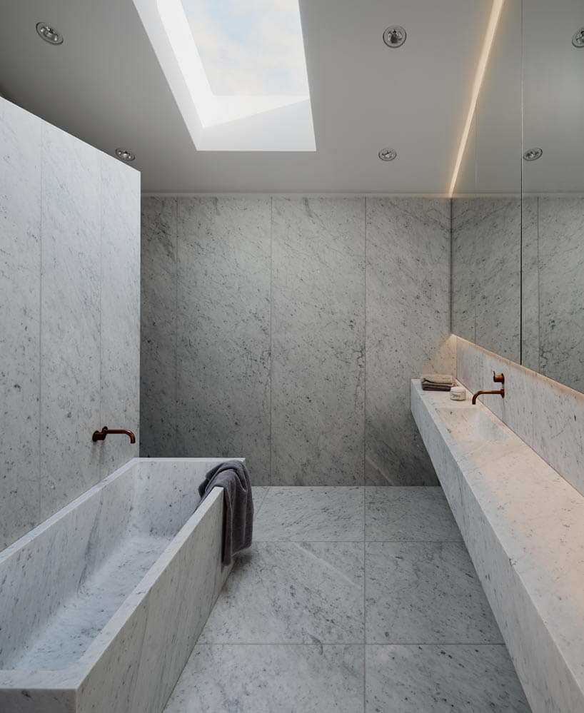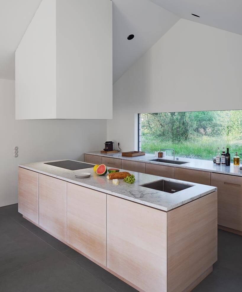 W centralnej części kompleksu znajduje się otwarta, jasna przestrzeń dzienna, która funkcjonalnie dzieli dom na strefę prywatną właścicieli oraz część przeznaczoną dla dzieci. Wnętrza charakteryzują się lekkimi liniami, prostotą form i wysoką jakością materiałów. Kuchnia oraz łazienki zaprojektowane zostały w minimalistycznym stylu, z wykorzystaniem naturalnych surowców, takich jak marmur i jasny kamień, które podkreślają spokojny, ponadczasowy charakter tej nowoczesnej interpretacji wiejskiej architektury.