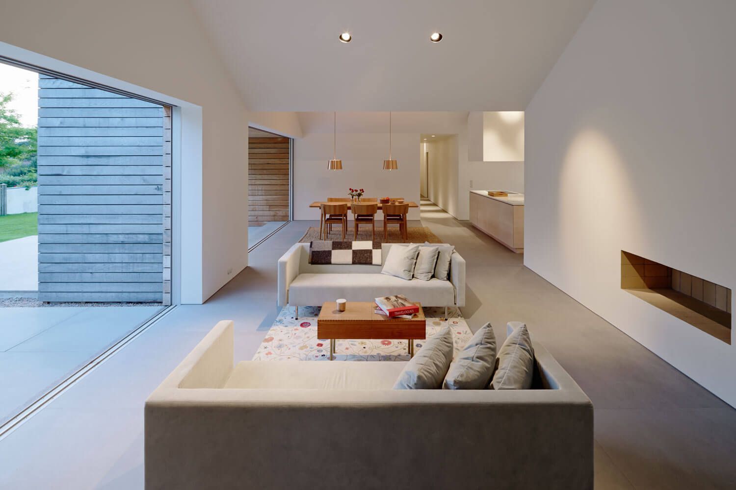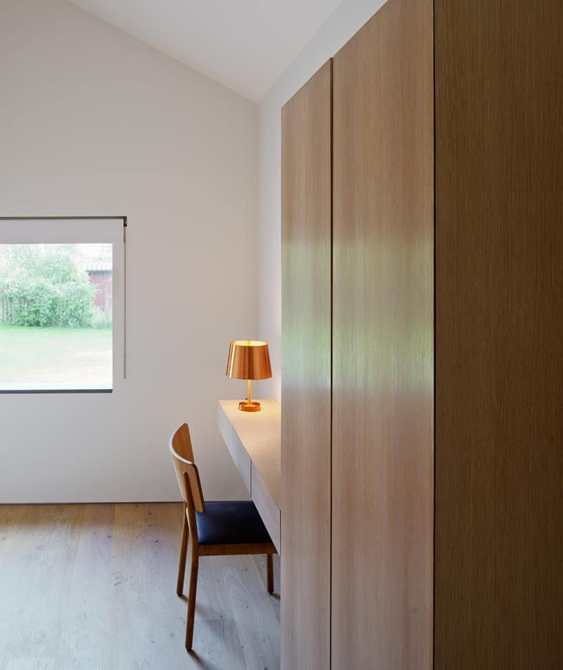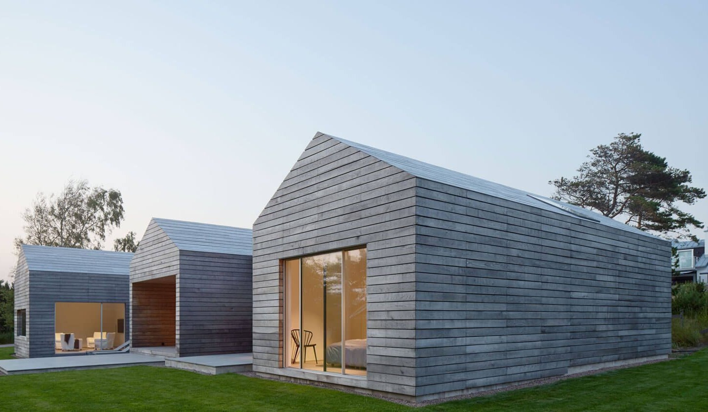 Jedna ze stron domu została całkowicie otwarta na krajobraz, tworząc płynne przejście pomiędzy wnętrzem a serią zewnętrznych tarasów. Takie rozwiązanie pozwala na naturalne przenikanie się przestrzeni wewnętrznych i zewnętrznych w obrębie głównej strefy dziennej oraz ułatwia komunikację między poszczególnymi częściami domu. Całość składa się z pięciu połączonych ze sobą pawilonów, z których każdy posiada dwuspadowy dach inspirowany formą tradycyjnych szwedzkich stodół — to podejście bliskie idei, jaką reprezentuje nowoczesna stodoła w skandynawskim wydaniu.