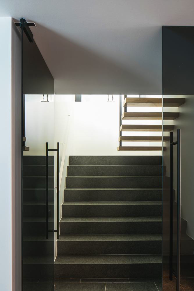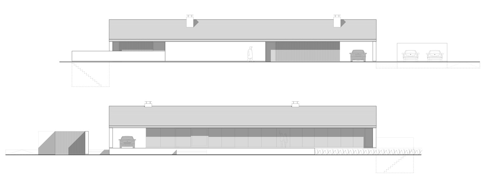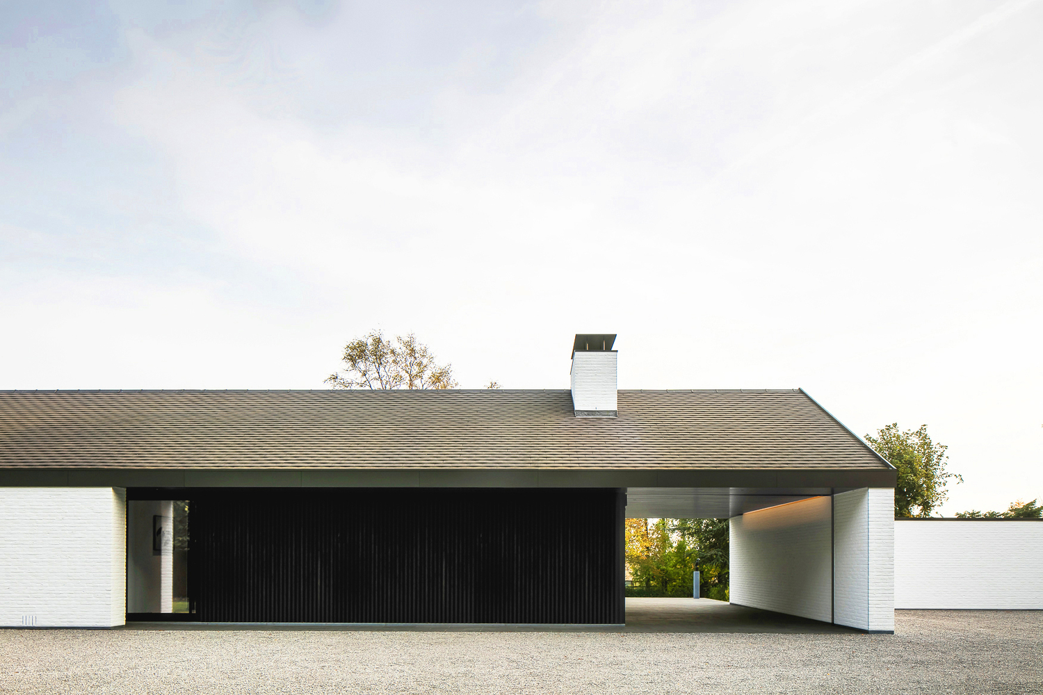 Fasada budynku jest zamknięta, prowadząc do zadaszonego wejścia. Po wejściu do środka, długi szklany front i rozmieszczenie okien przypominają galerię. Zewnętrzny stół tarasowy łączy przestrzeń z ogrodem, a baldachim chroni przed nadmiernym nasłonecznieniem.