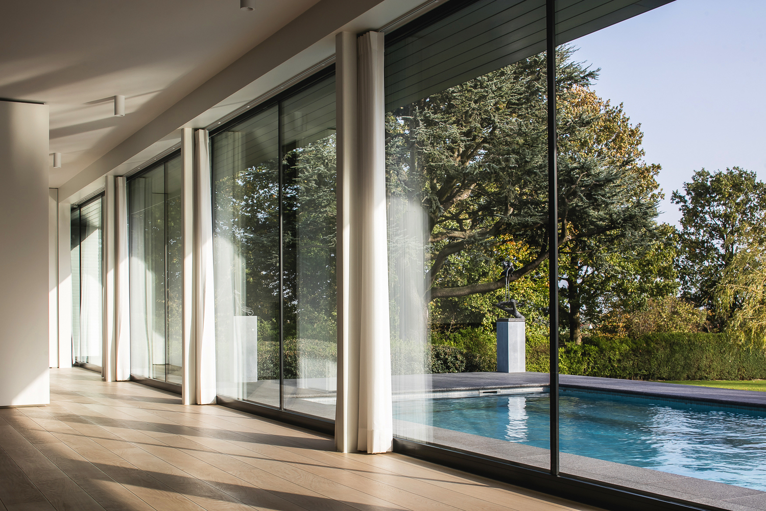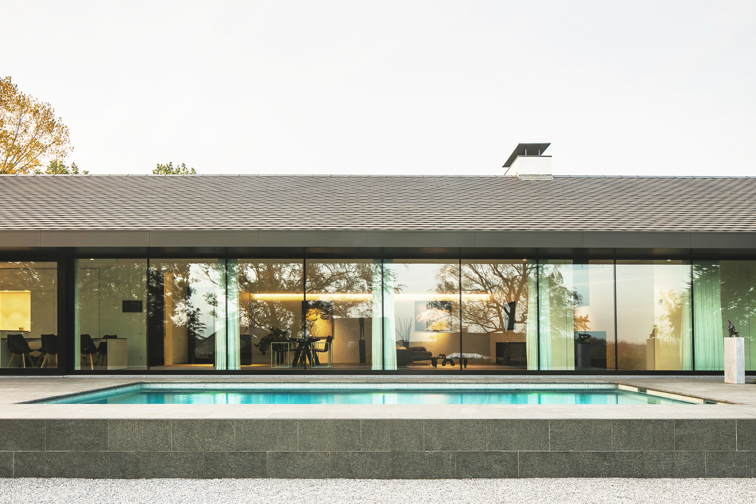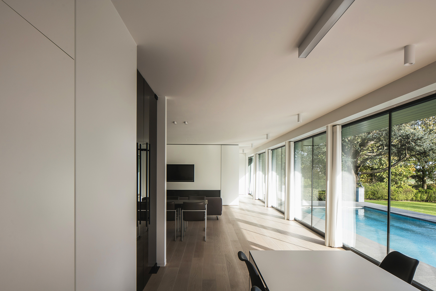 Villa NTT to wyjątkowy projekt, który łączy nowoczesną architekturę z otoczeniem natury. Położona w centrum miasta, w otoczeniu prywatnego parku, zapewnia poczucie intymności i spokoju. Krótka aleja prowadzi do głębszej części posesji, z widokiem na Poelberg, a nachylenie terenu potęguje wrażenie otwartości.