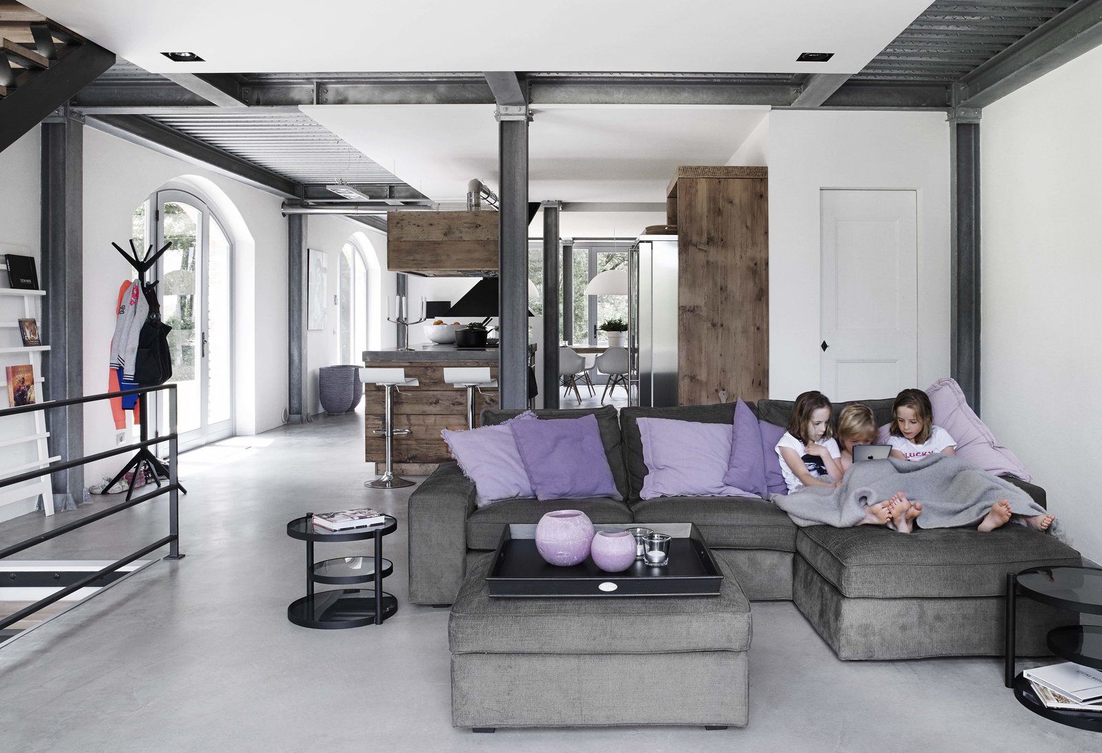 Na dużej, otwartej powierzchni na parterze, o wielkości blisko 100 m2, znajduje się przestronny salon z betonowymi podłogami, odsłoniętymi stalowymi filarami i dużymi oknami. Ciemnoszara sofa pozwala stworzyć atmosferę, która przypomina bardziej industrialny loft. Salon przechodzi w otwartą kuchnię z wyspą zrobioną z drewna i stali, stołem i dużym, otwartym kominkiem.