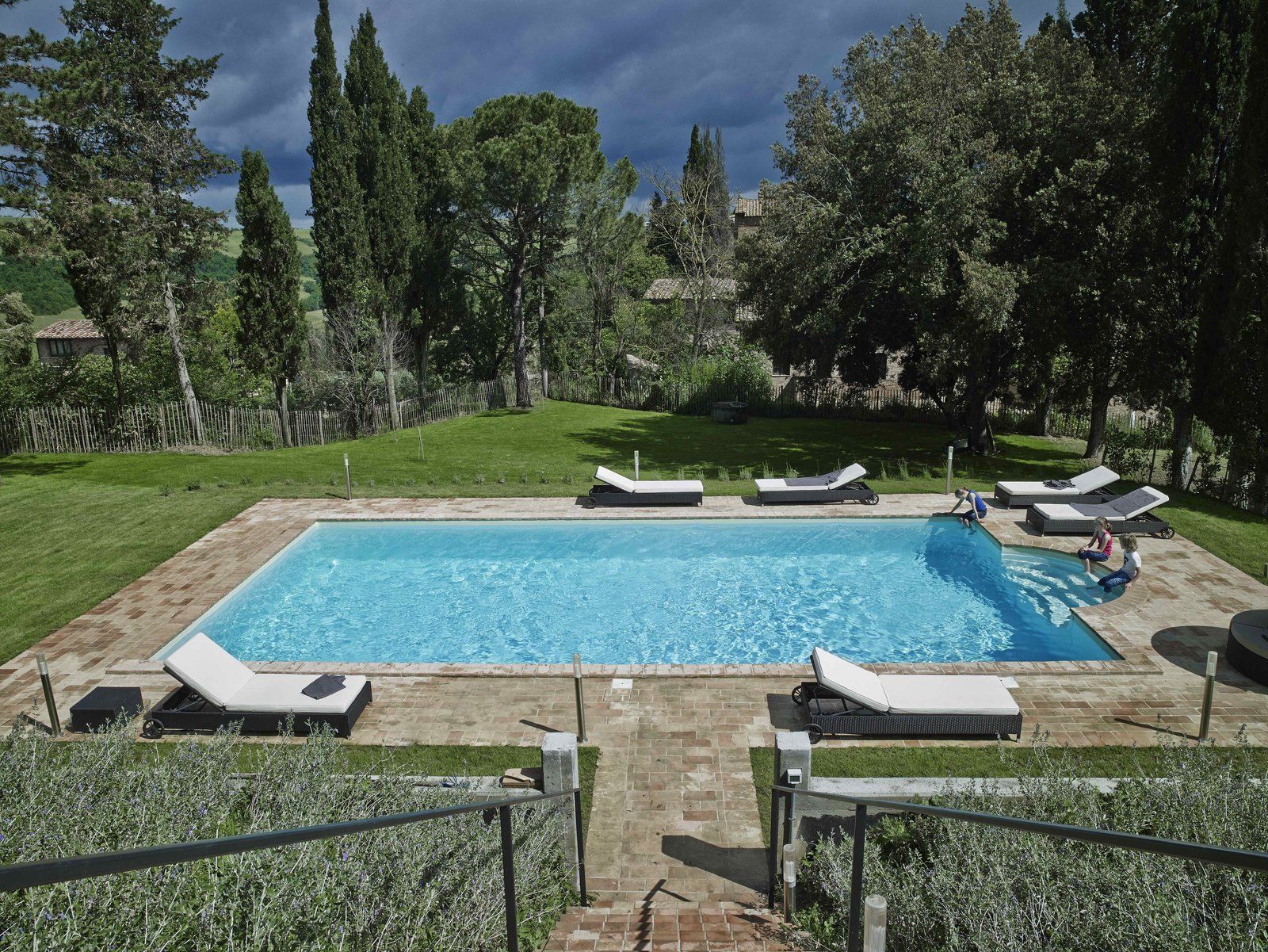 Z zewnątrz luksusowa willa, który stoi na sporej działce w dolinie Val d’Orcia w środkowej części Włoch, wygląda jak wiele innych tradycyjnych willi, które można znaleźć na pełnych wzgórz rolniczych terenach Toskanii. Jednak za tymi ścianami, wnętrza Willi Vergelle zaskakują swym wyszukanym połączeniem nowoczesnego i industrialnego chłodu z maleńką nutą Skandynawii.Willa stoi na pochyłej działce otoczonej cyprysami, dębami i sosnami. Ma duży ogród i prywatny basen, otoczony nowoczesnymi leżakami. Schody przy basenie prowadzą jeszcze na spory taras z zacienionymi krzesłami i stołem. Goście mogą tam w spokoju wypocząć po pływaniu, jedząc lekki posiłek.
