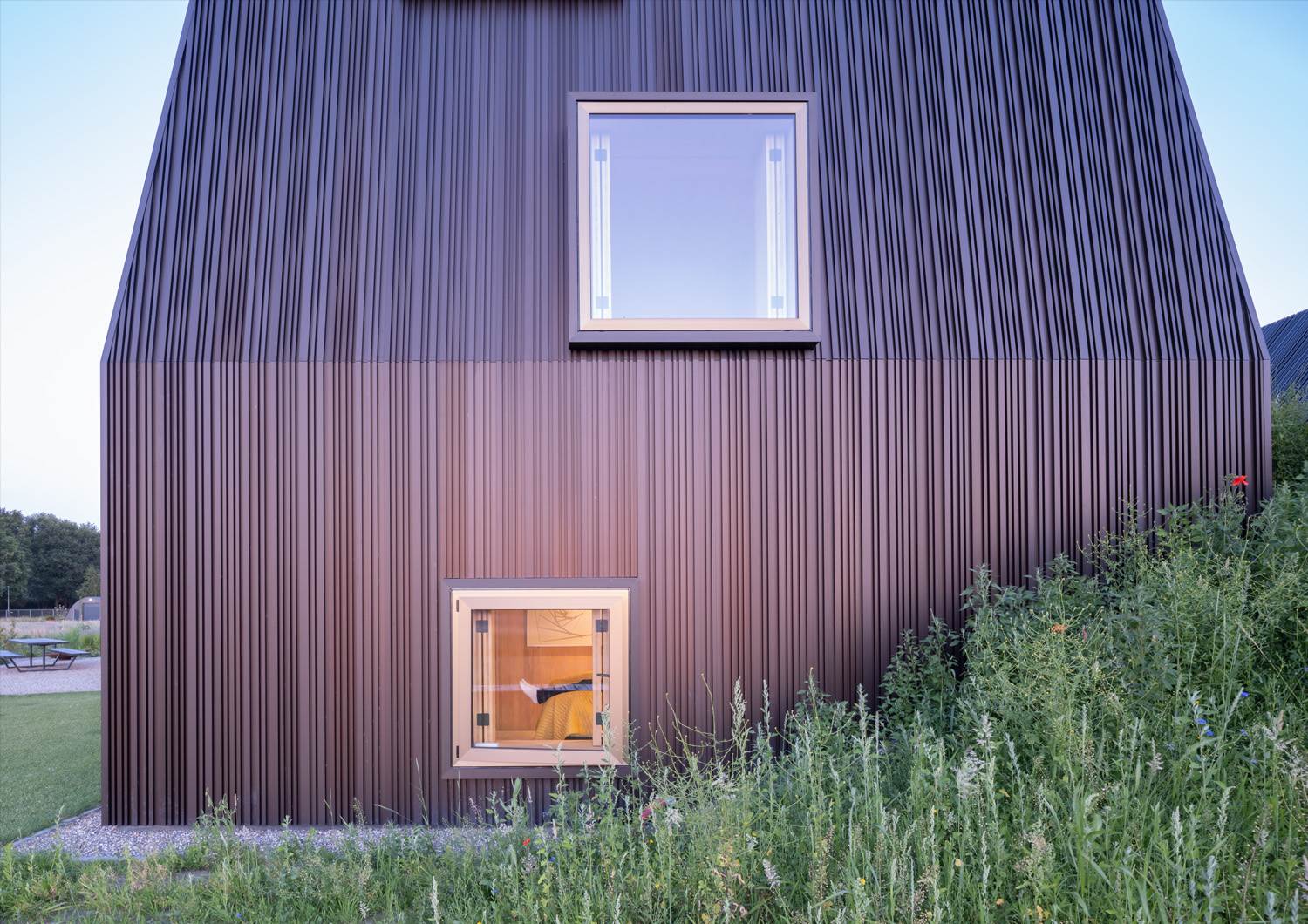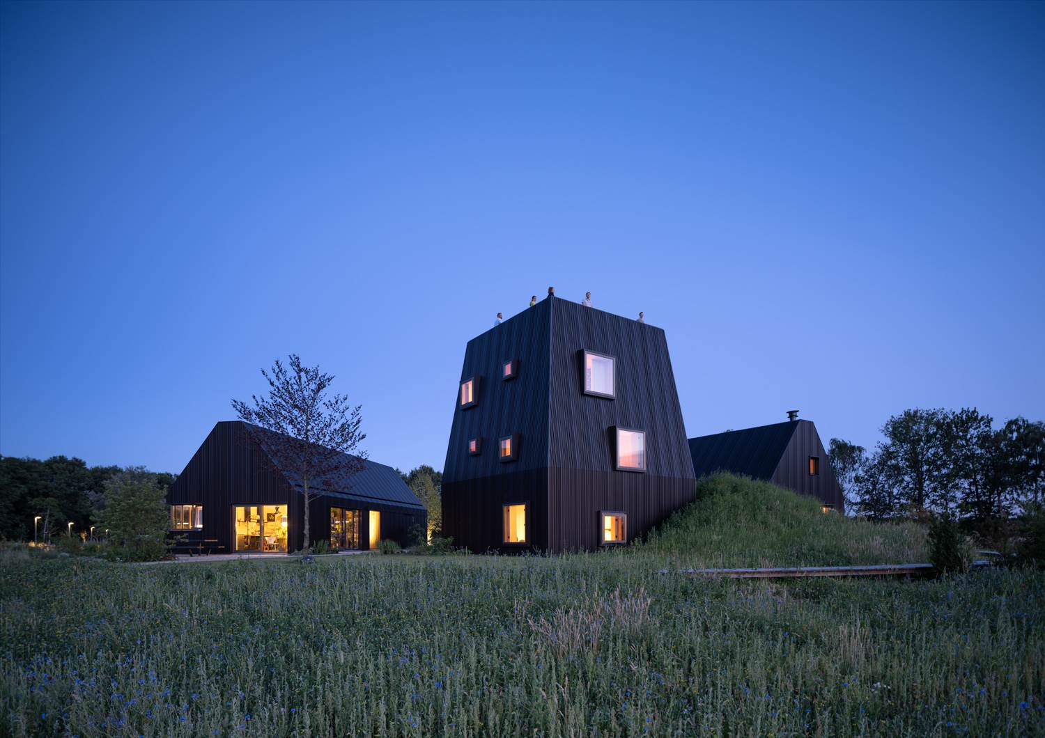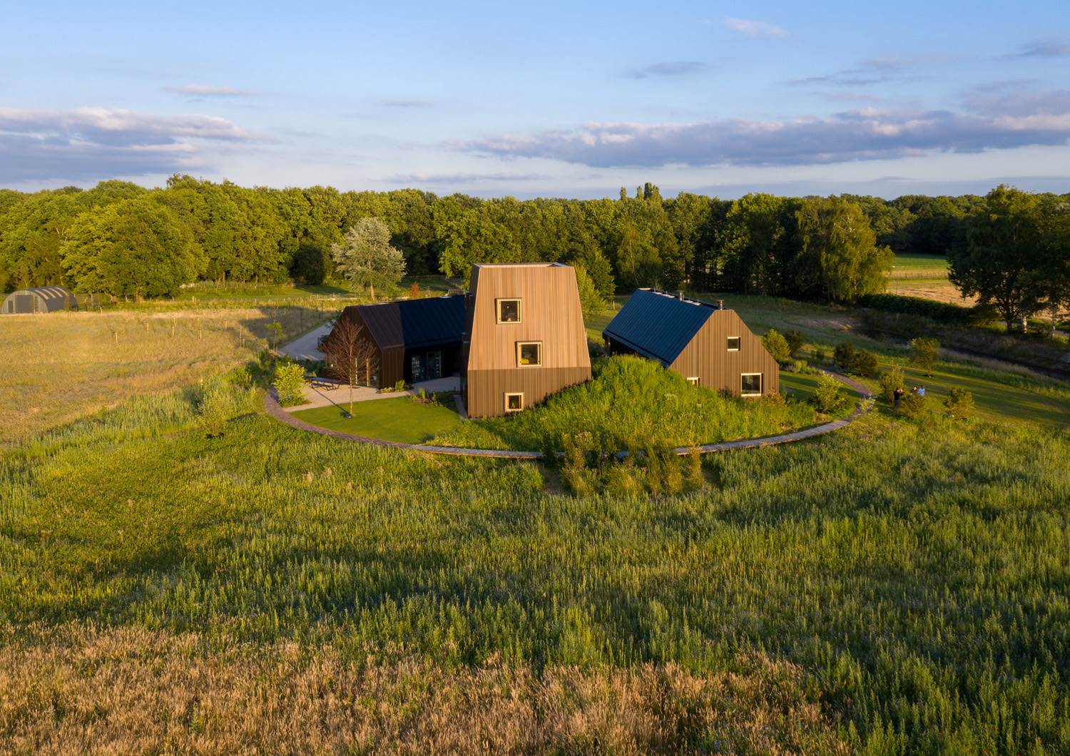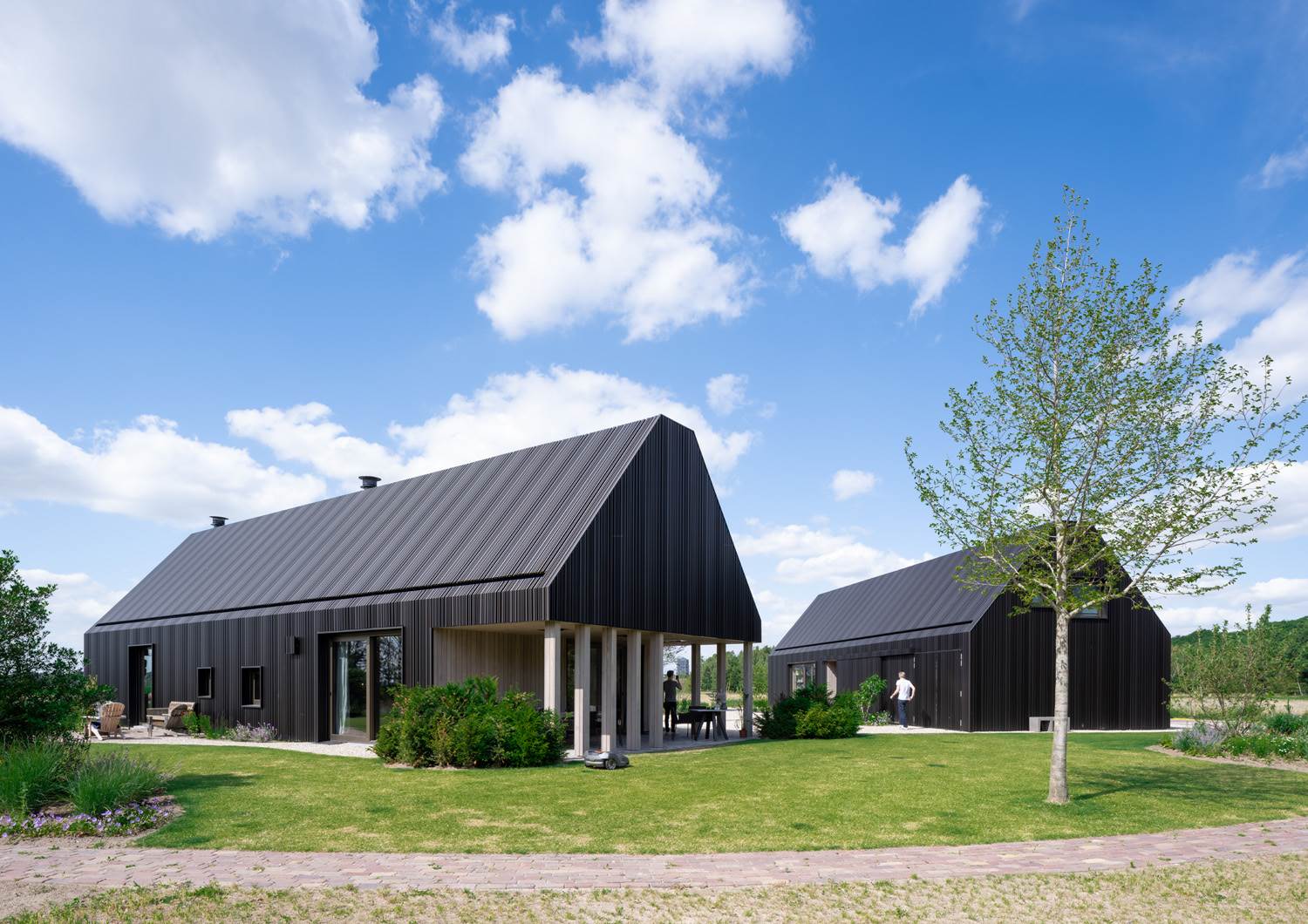 Funkcje domu rozmieszczono w trzech osobnych budynkach, co pozwoliło zachować poczucie skali i przestrzeni. Dwie niższe bryły przyjmują formę nowoczesnych stodół z dwuspadowymi dachami, silnie zintegrowanych z otaczającym ogrodem. Trzecia, wyższa część domu pełni rolę dominanty – z główną sypialnią, pokojami dziecięcymi i tarasem na dachu, oferuje panoramiczne widoki na rozległy holenderski krajobraz.