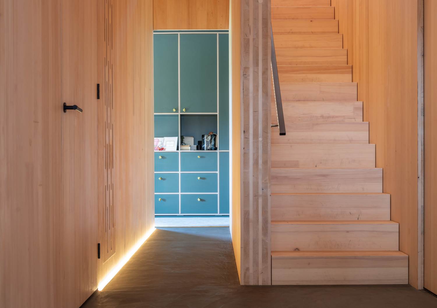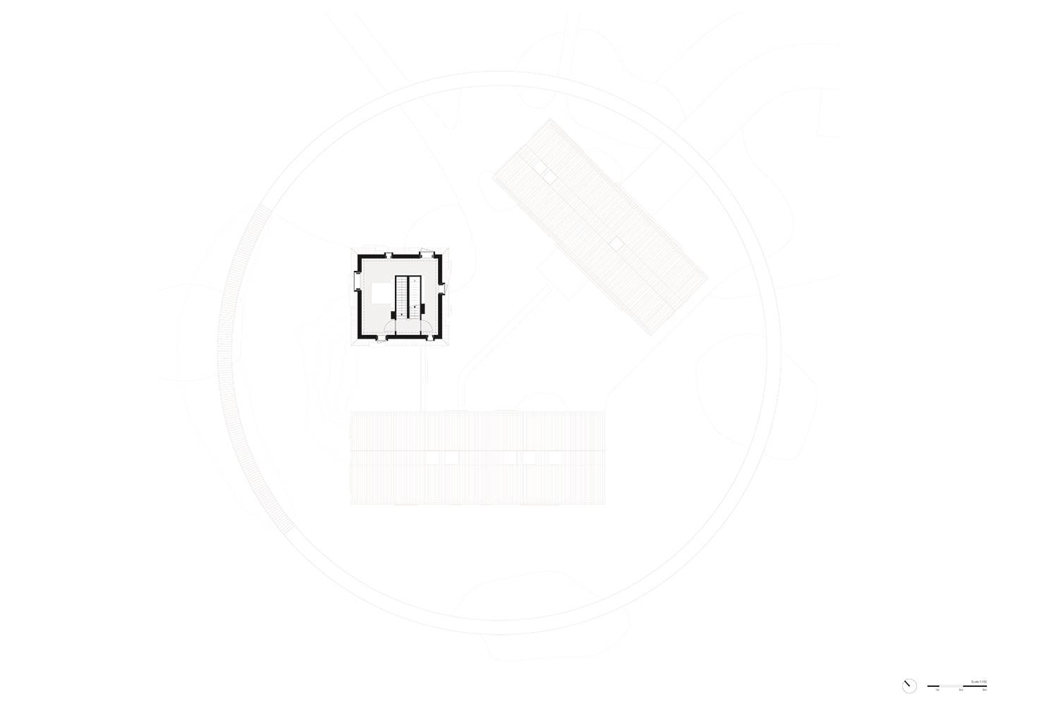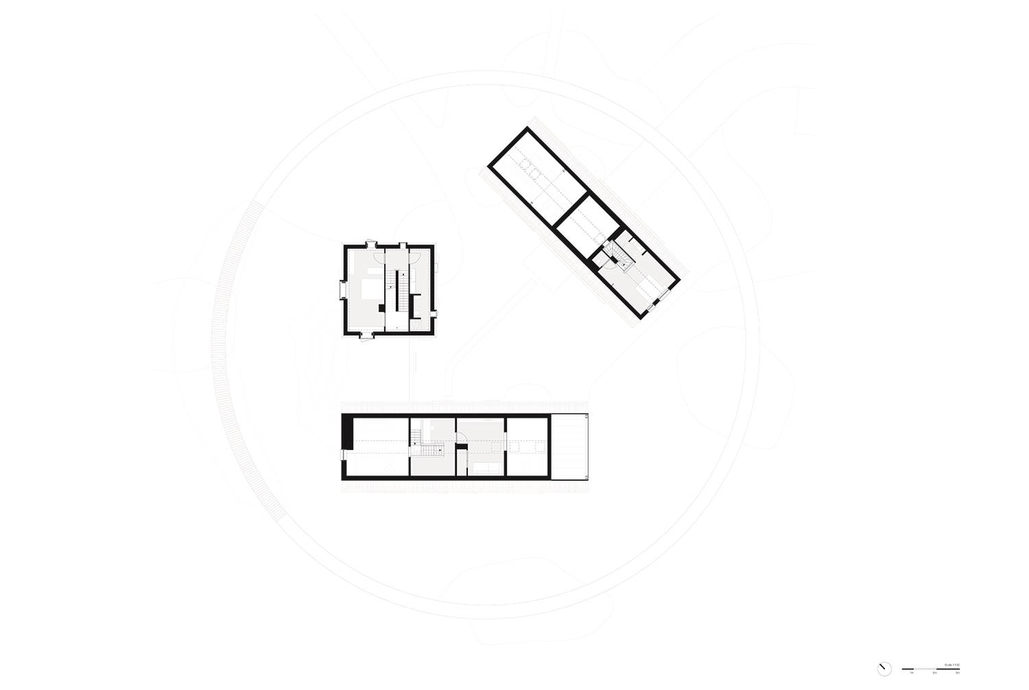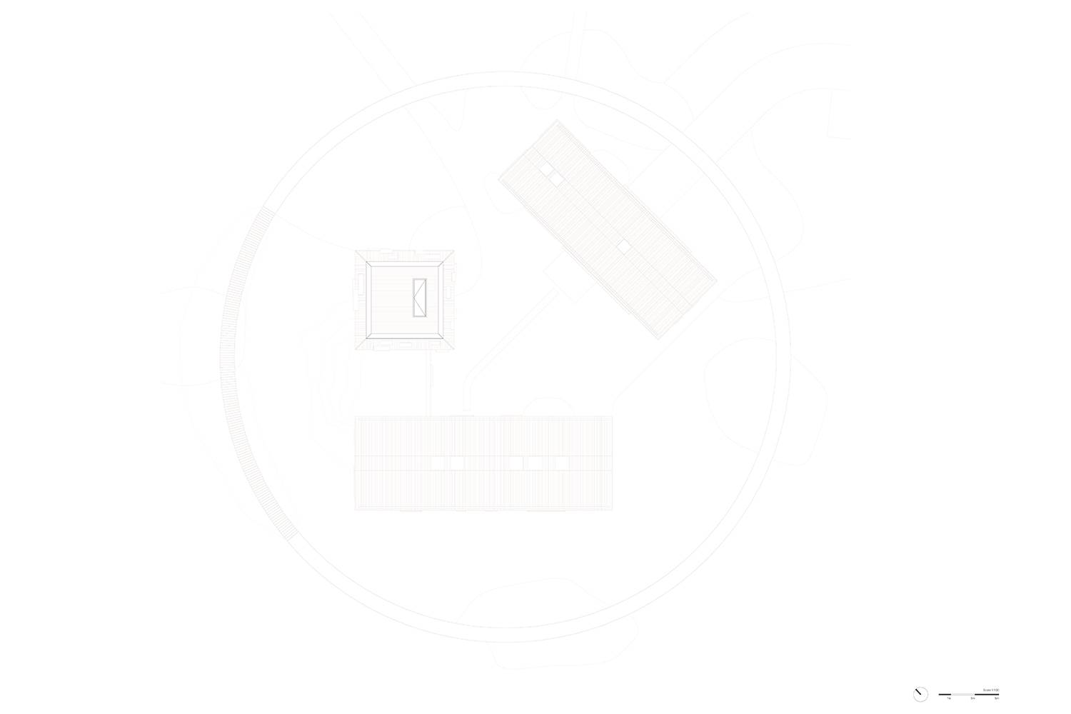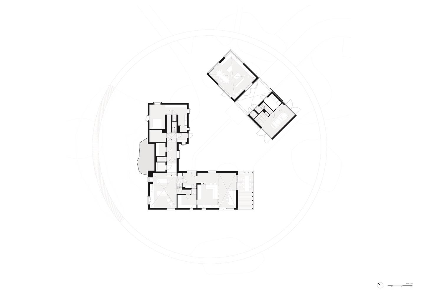 Pierwsza stodoła mieści salon, kuchnię z jadalnią, strefę wypoczynku i dużą werandę od strony południowo-zachodniej. Na piętrze znajduje się miejsce do pracy i zabawy. W drugiej bryle zlokalizowano studio gotowania z możliwością organizowania warsztatów kulinarnych dla nawet 20 osób. Obok znajdują się garaż, pomieszczenia gospodarcze oraz apartament gościnny. Poszczególne funkcje połączono z szacunkiem dla idei wolnostojącej zagrody: na wpół zagłębiony korytarz pod trawiastym nasypem łączy główną bryłę z salonem, nie zakłócając widoków. Studio gotowania pozostaje niezależne – widok z dziedzińca pozostaje otwarty.