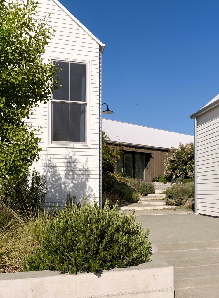 Vineyard Road Residence to projekt, który doskonale integruje nowoczesną architekturę z ukształtowaniem terenu. Budynek został podzielony na dwa skrzydła, co pozwoliło efektywnie wykorzystać pochyłą topografię działki i stworzyć naturalne „poczucie miejsca”. Proste, wyraziste bryły o spadzistych dachach, przypominające stylistykę, jaką reprezentuje nowoczesna stodoła, zostały wykończone ognioodporną okładziną i podkreślone bejcowanym cedrem przy wejściu. Taka forma nie tylko zachwyca prostotą, ale też wpisuje się w krajobraz i odpowiada na lokalne warunki klimatyczne.