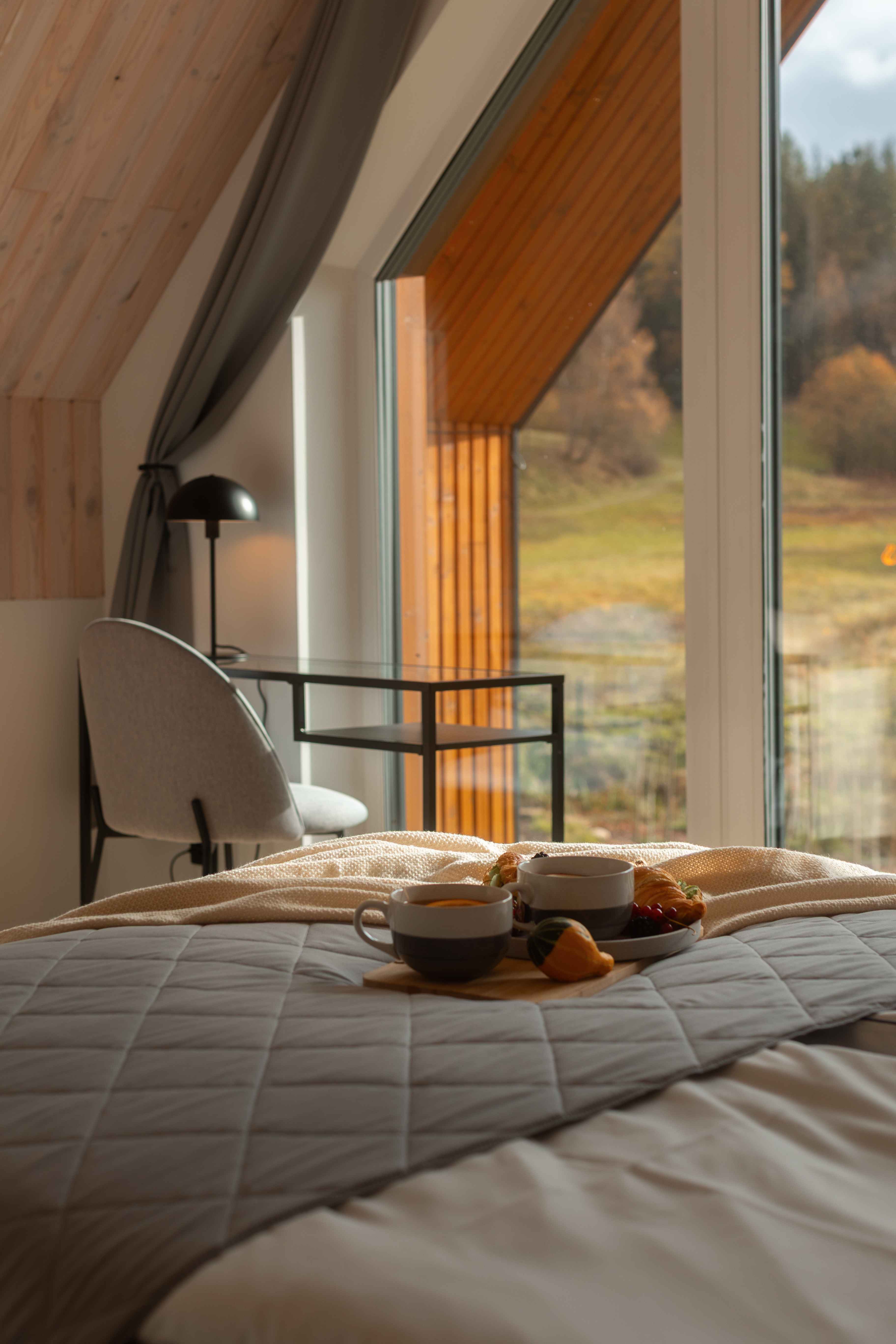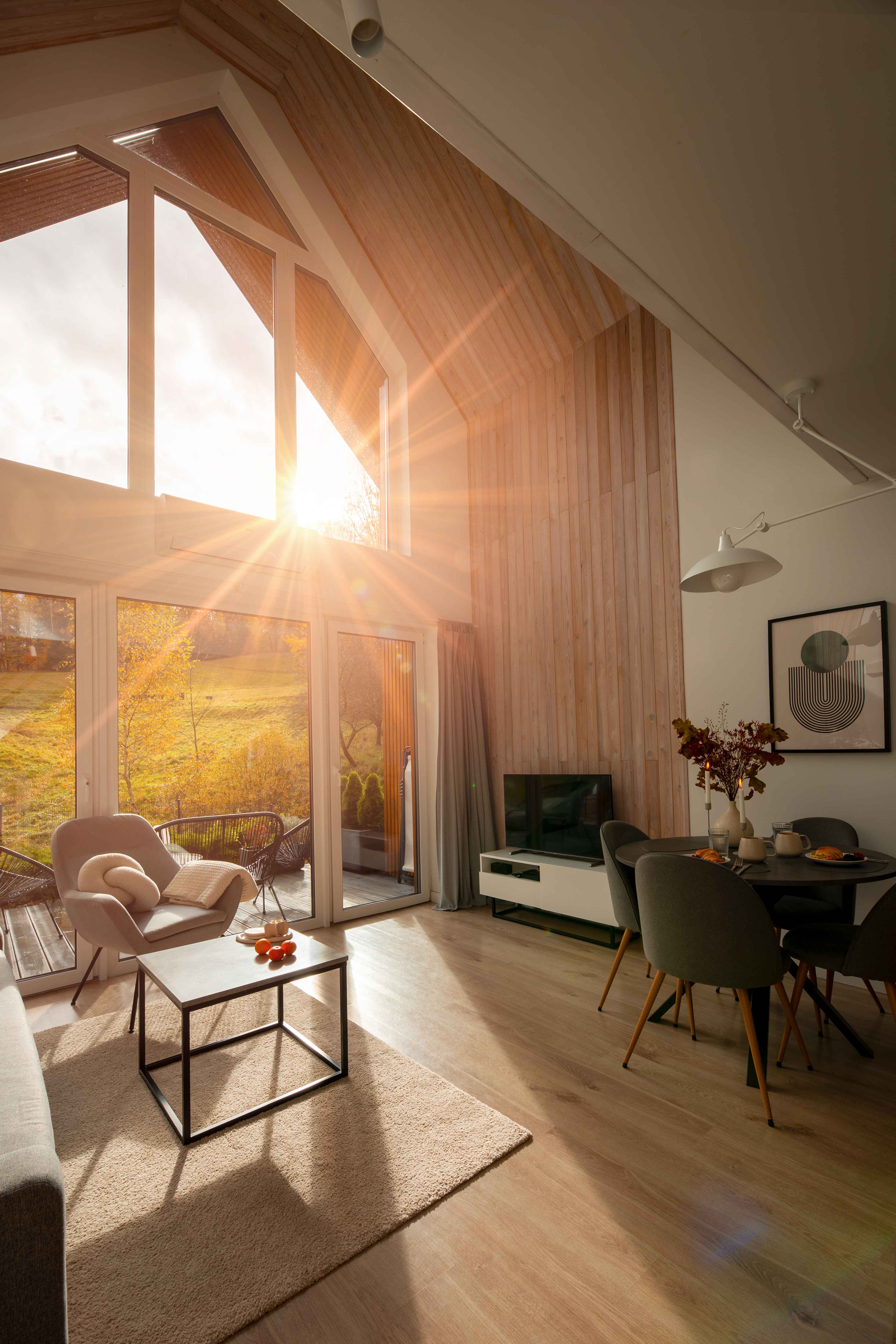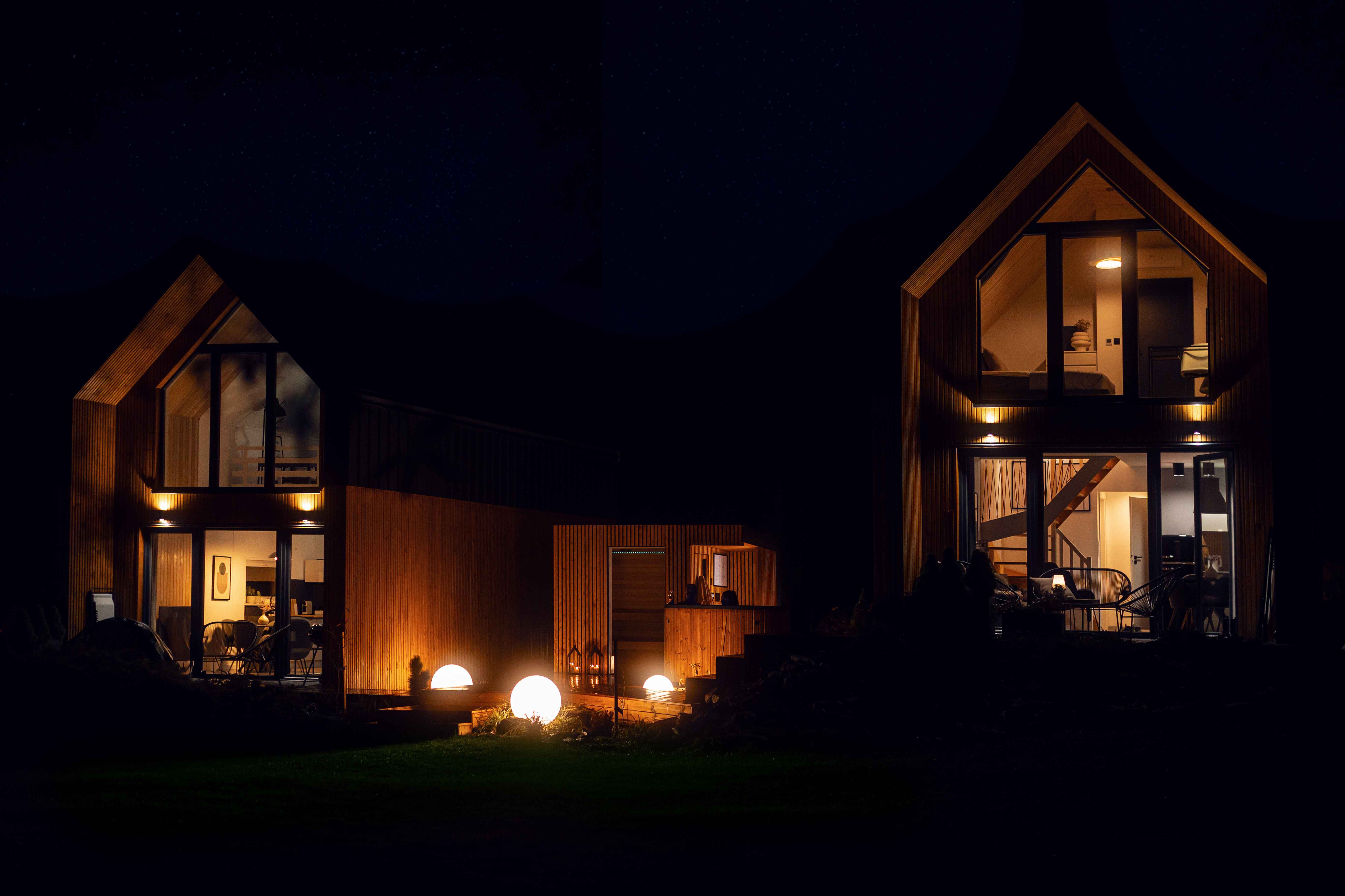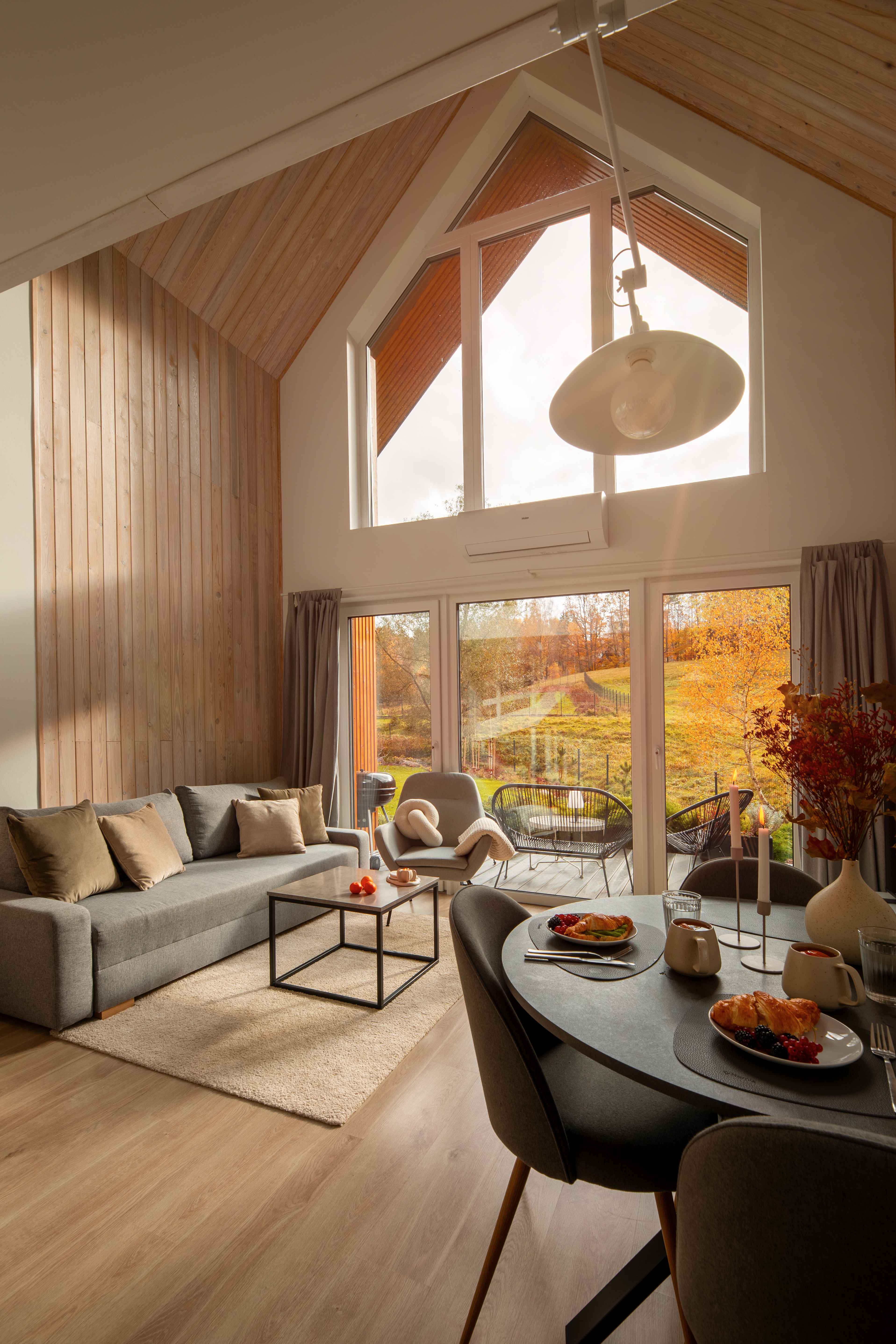 Taras przy każdym z domków to idealne miejsce na jesienny wypoczynek. Wystarczy koc, herbata z miodem i książka — resztę zrobi natura. Ciepło podłogowego ogrzewania i zdalnie sterowany system grzewczy dbają o komfort, gdy za oknem siąpi deszcz lub hula wiatr. Wnętrza są wysokie (aż do 7 metrów w części dziennej), jasne, a dzięki dużym przeszkleniom zawsze pełne światła. Naturalne drewno i miękkie tkaniny tworzą atmosferę, w której można odpocząć i naprawdę odetchnąć.