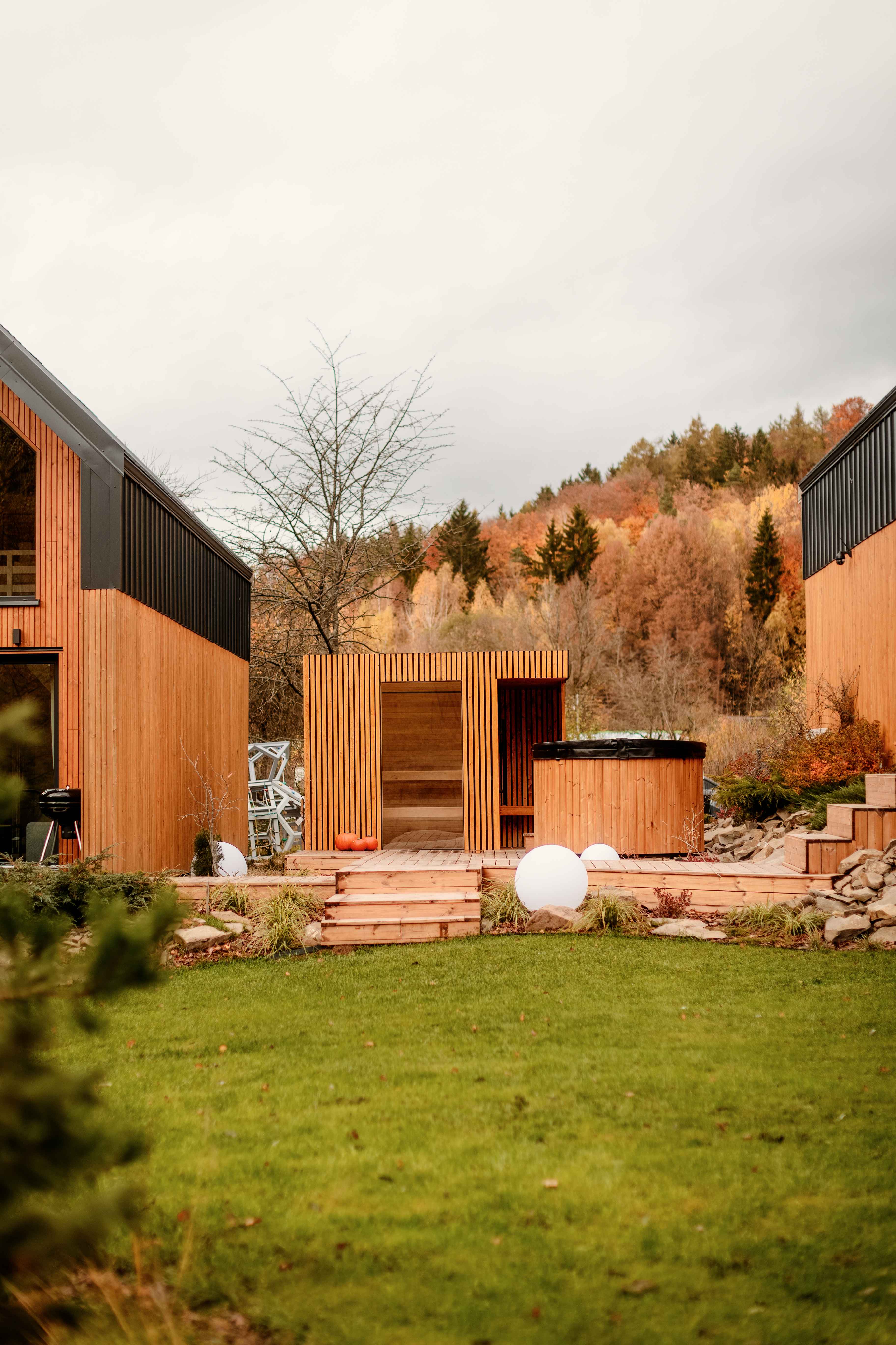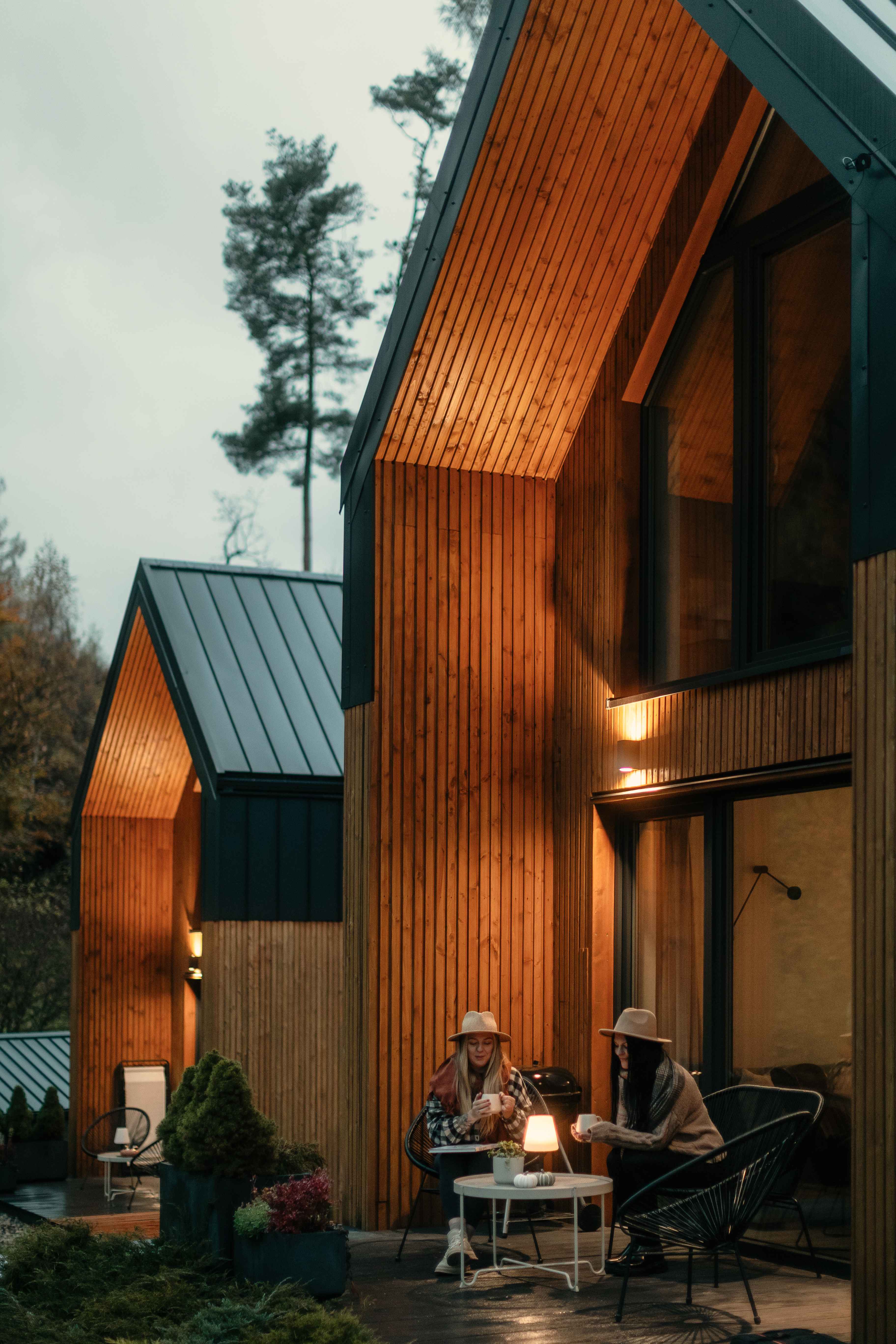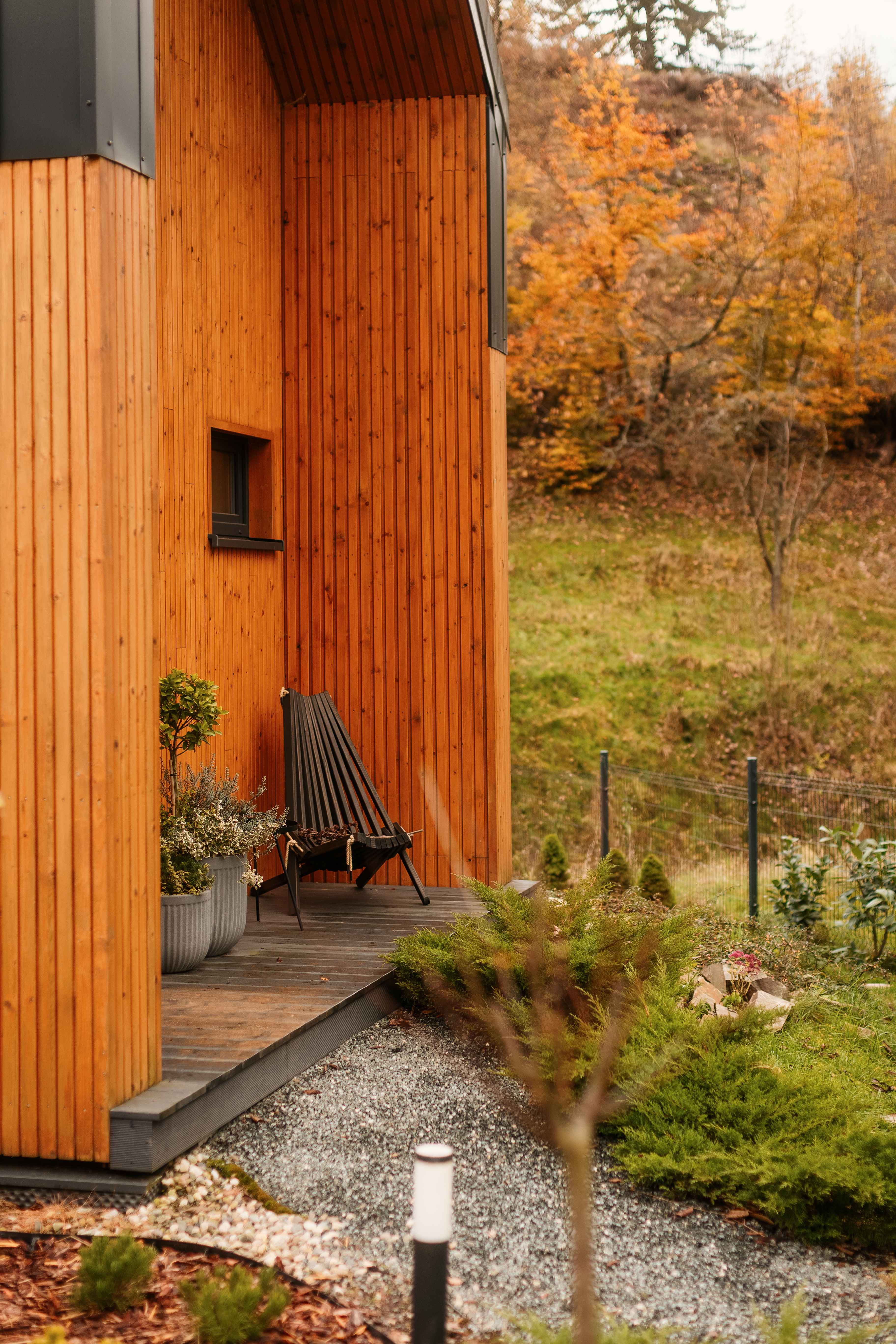 Taras przy każdym z domków to idealne miejsce na jesienny wypoczynek. Wystarczy koc, herbata z miodem i książka — resztę zrobi natura. Ciepło podłogowego ogrzewania i zdalnie sterowany system grzewczy dbają o komfort, gdy za oknem siąpi deszcz lub hula wiatr. Wnętrza są wysokie (aż do 7 metrów w części dziennej), jasne, a dzięki dużym przeszkleniom zawsze pełne światła. Naturalne drewno i miękkie tkaniny tworzą atmosferę, w której można odpocząć i naprawdę odetchnąć.