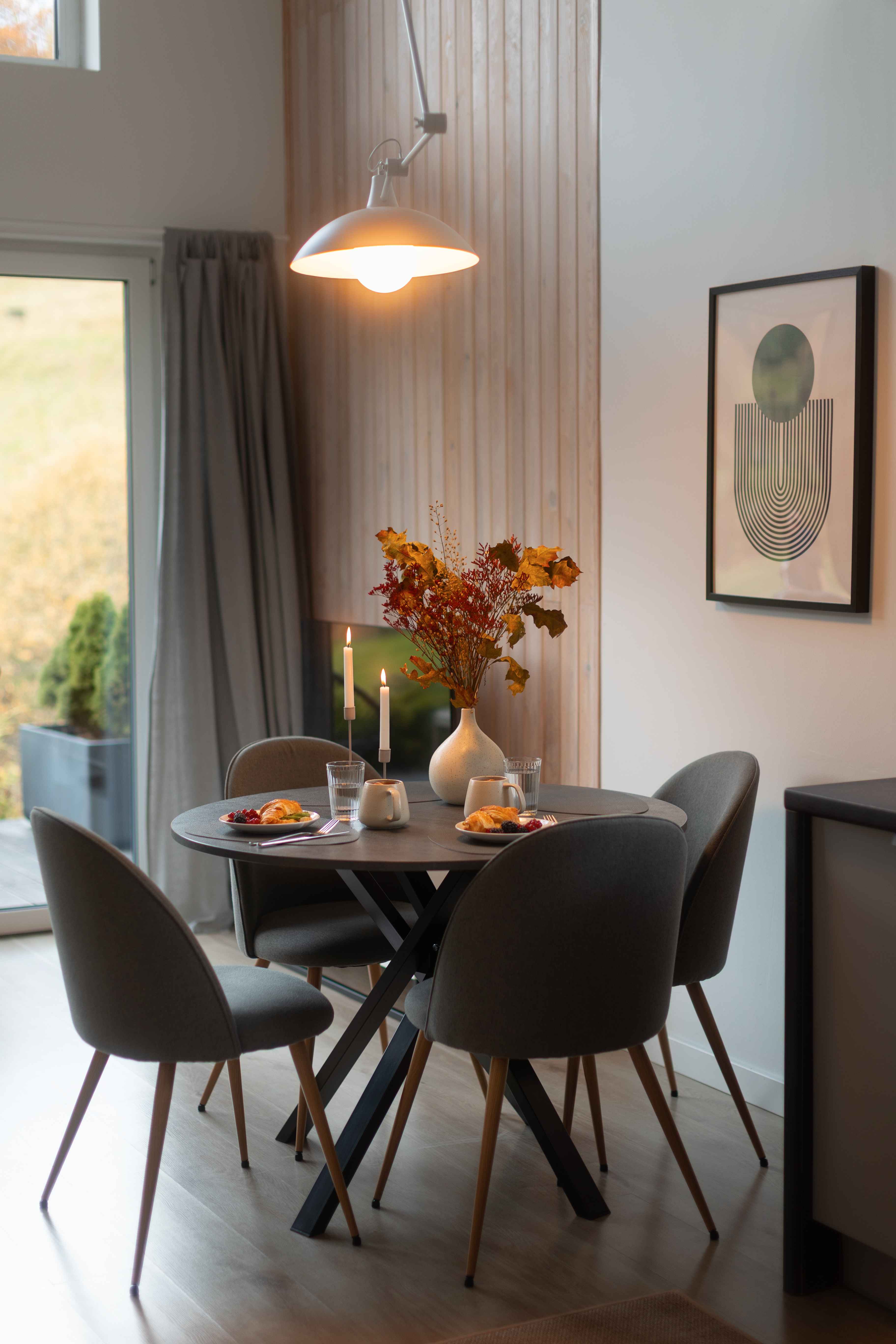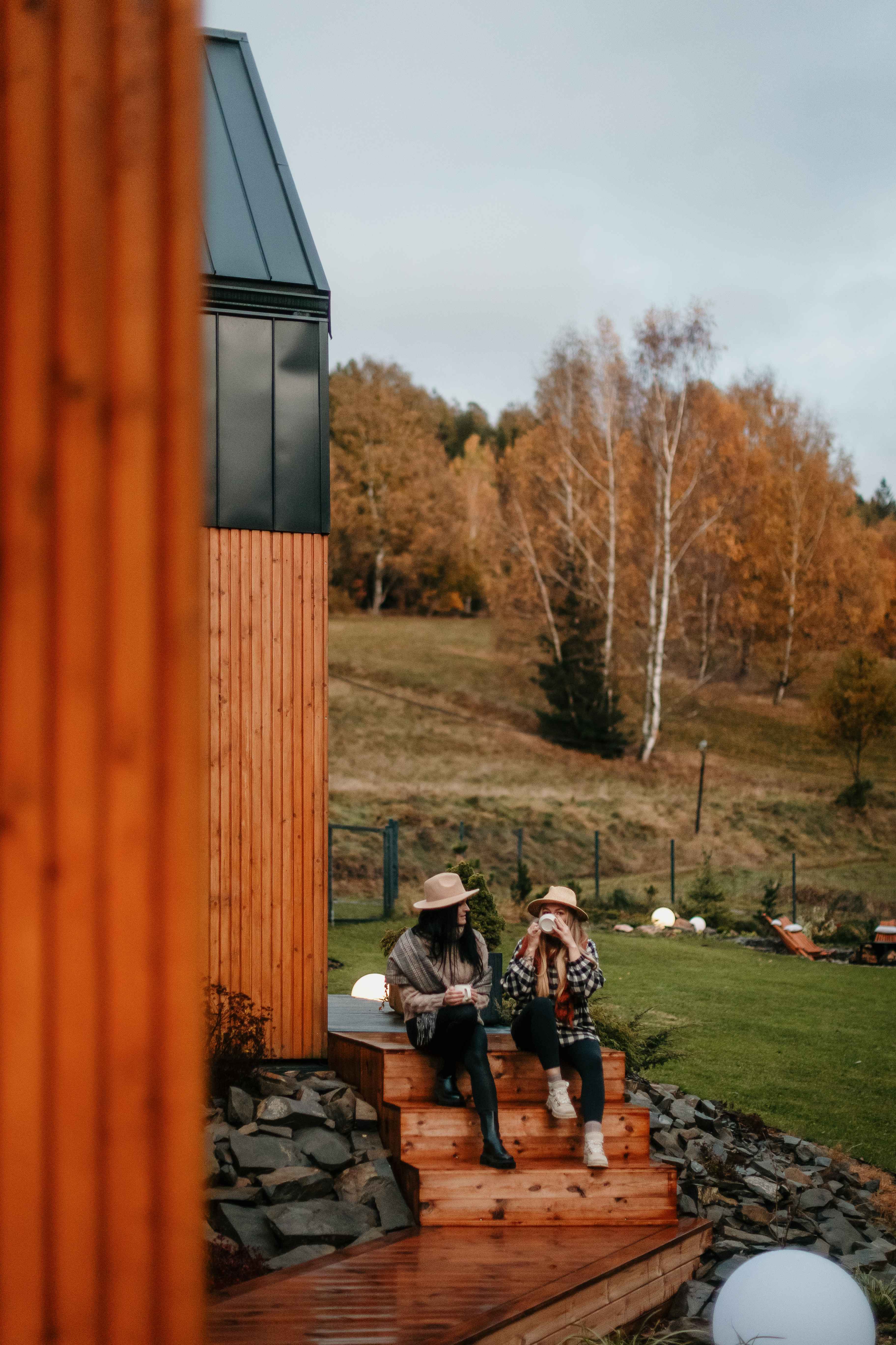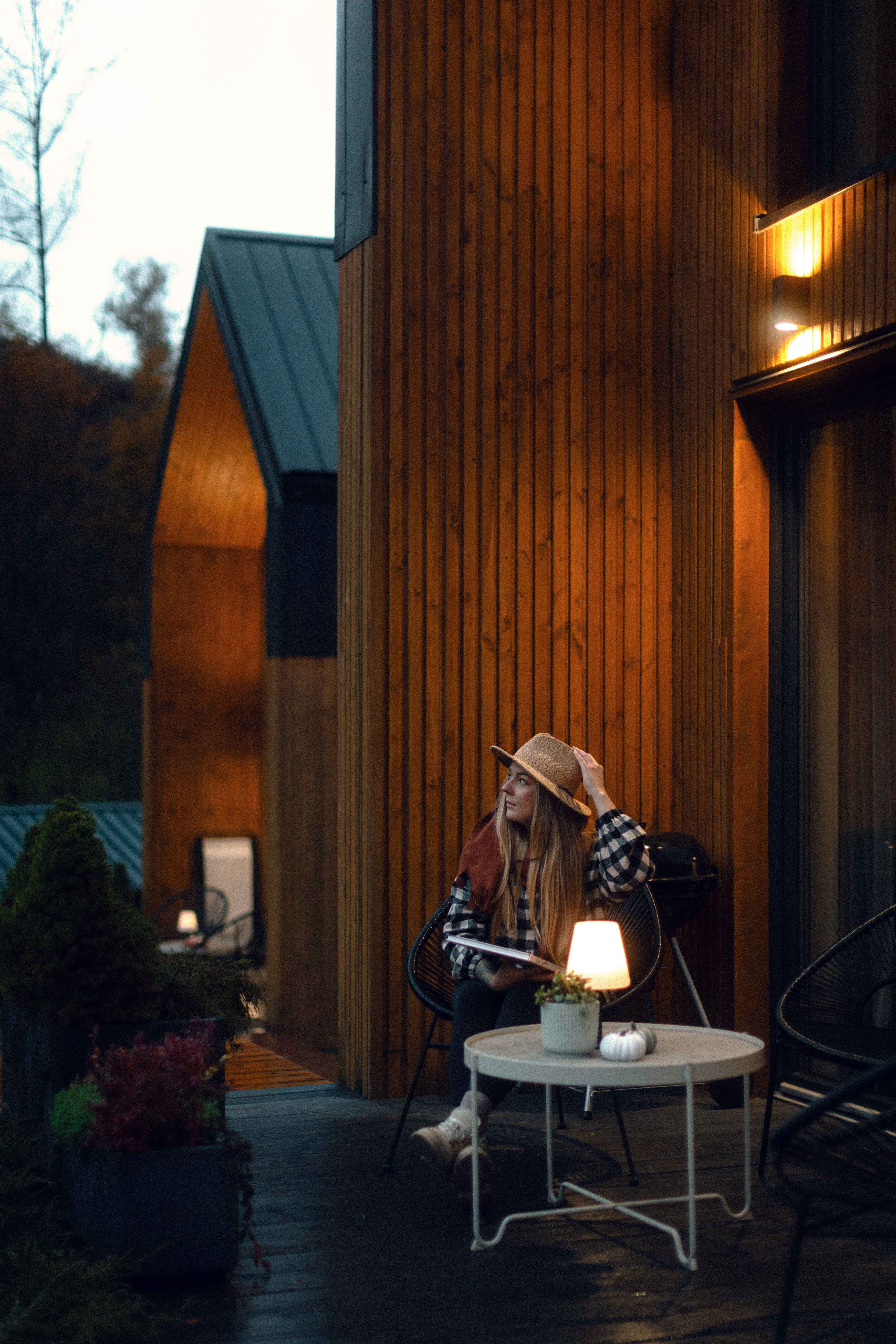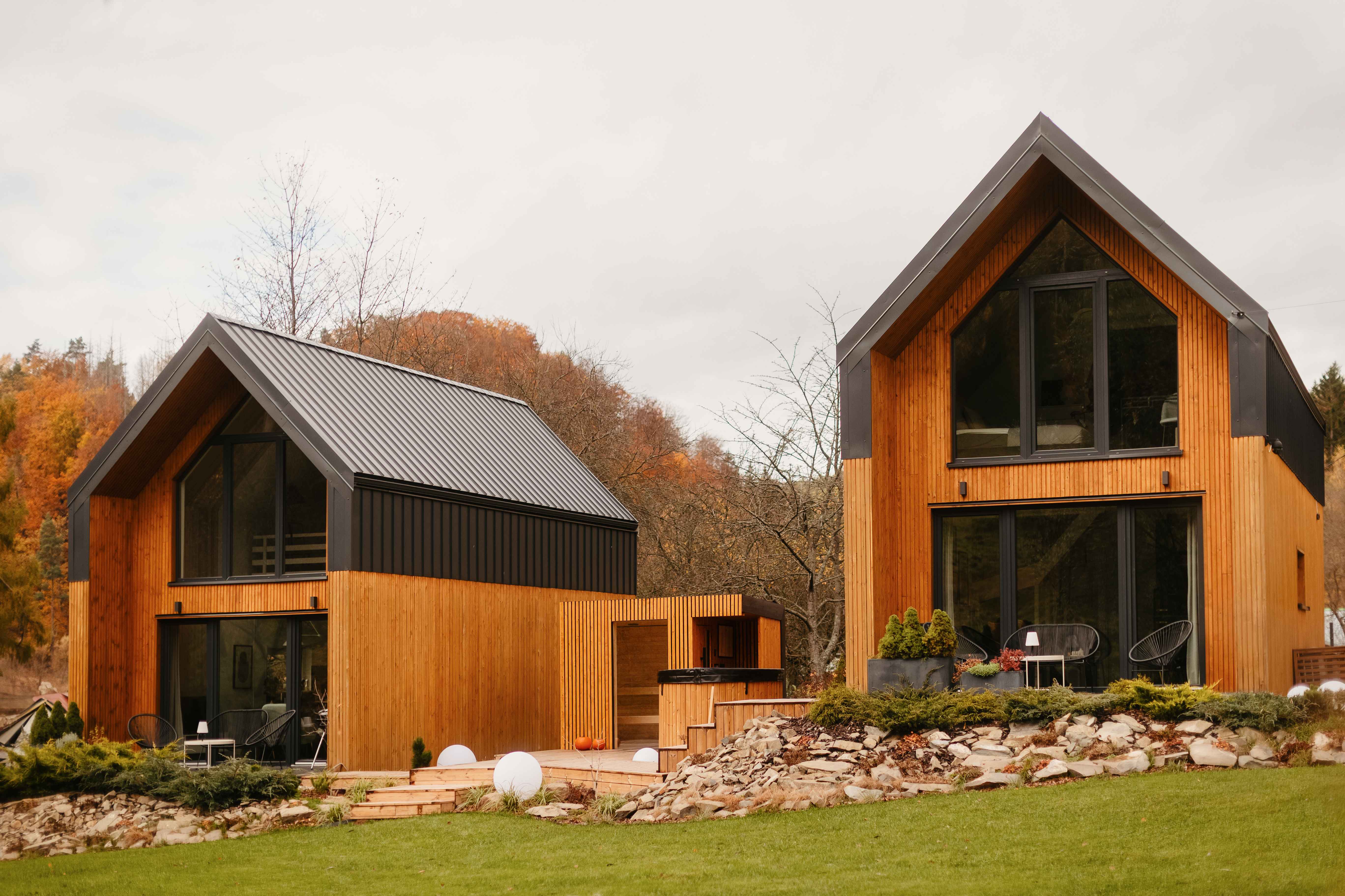 Taras przy każdym z domków to idealne miejsce na jesienny wypoczynek. Wystarczy koc, herbata z miodem i książka — resztę zrobi natura. Ciepło podłogowego ogrzewania i zdalnie sterowany system grzewczy dbają o komfort, gdy za oknem siąpi deszcz lub hula wiatr. Wnętrza są wysokie (aż do 7 metrów w części dziennej), jasne, a dzięki dużym przeszkleniom zawsze pełne światła. Naturalne drewno i miękkie tkaniny tworzą atmosferę, w której można odpocząć i naprawdę odetchnąć.
