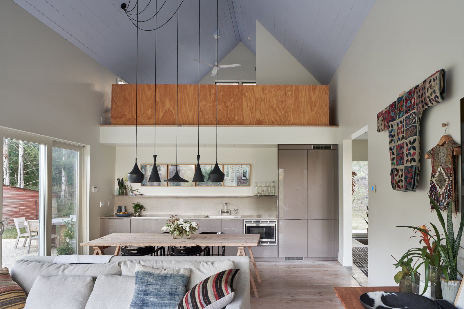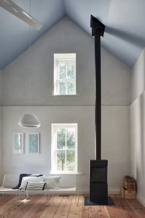 Dom zachowuje wiele oryginalnych elementów, takich jak wygrawerowana data budowy "1893" nad wejściem, jasnoniebieski sufit w sypialni czy klasyczne wykończenia wnętrz. Jednocześnie znajdziemy tu nowoczesne akcenty – czarny kominek marki Wittus, meble Hay czy współczesne rozwiązania funkcjonalne. Ta nowoczesna stodoła to nie tylko przemyślana rewitalizacja historycznego domu, ale także opowieść o miłości do natury, architektury i lokalnej tożsamości.