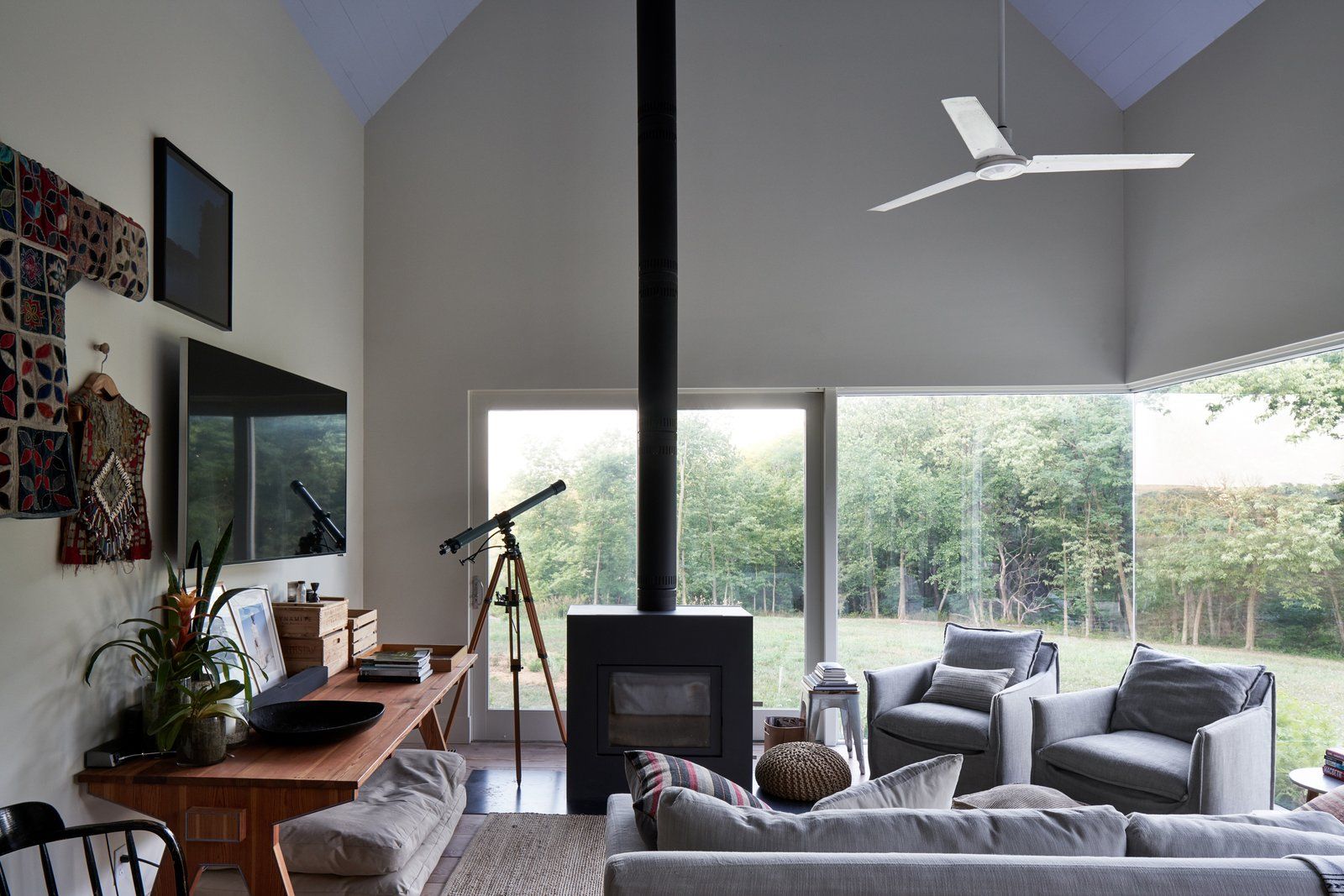 Nowoczesna stodoła powstała na bazie oryginalnej bryły domu, która idealnie wpisuje się w otaczający krajobraz. Dom znajduje się pośród starych drzew, takich jak wiązy, klony i cedry czerwone. Przez wiele weekendów para analizowała nasłonecznienie terenu i kierunki wiatru, aby stworzyć przestrzeń maksymalnie komfortową i energooszczędną. Efektem tej cierpliwej obserwacji jest harmonijny projekt, w którym nic nie jest przypadkowe.