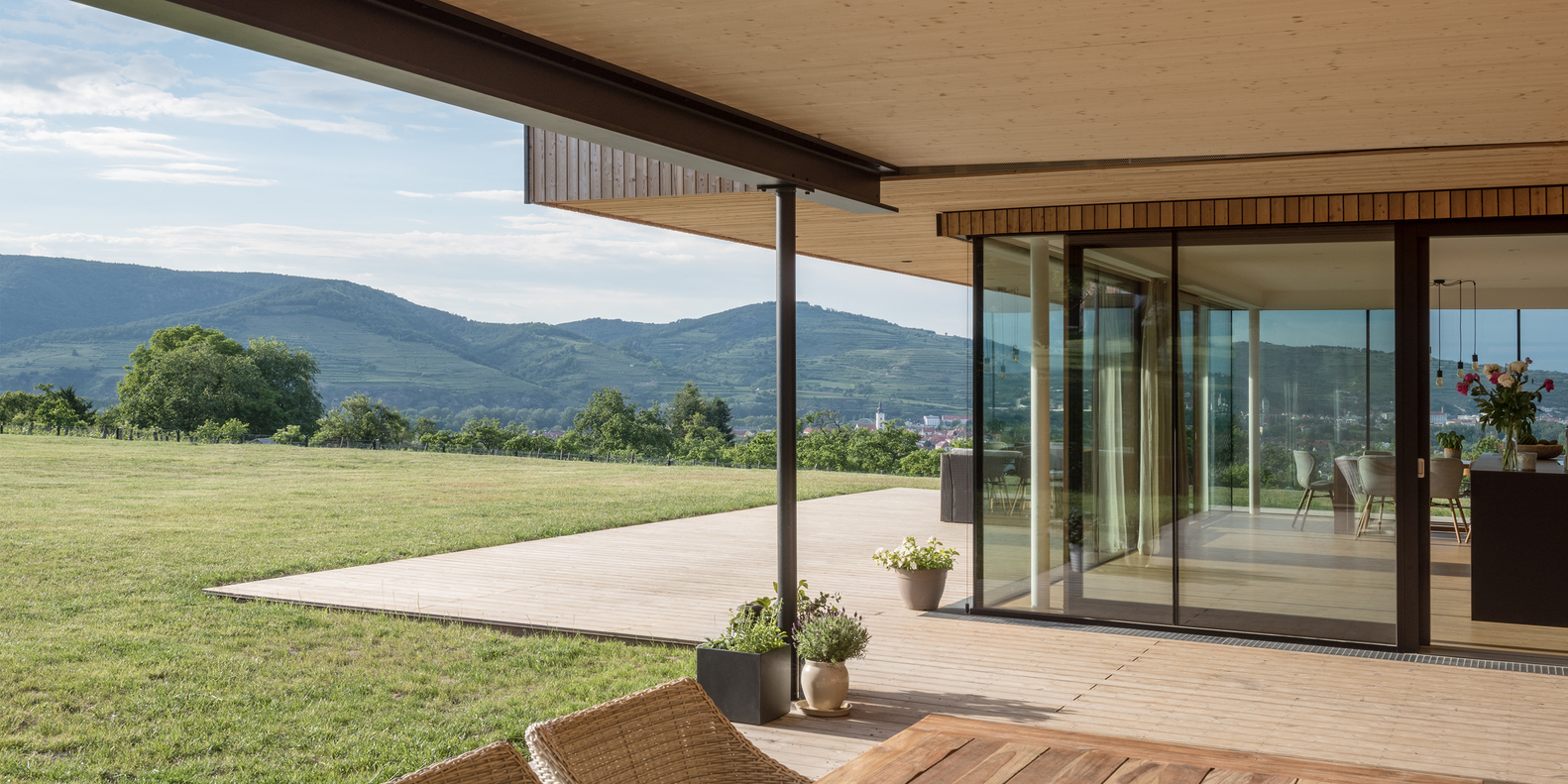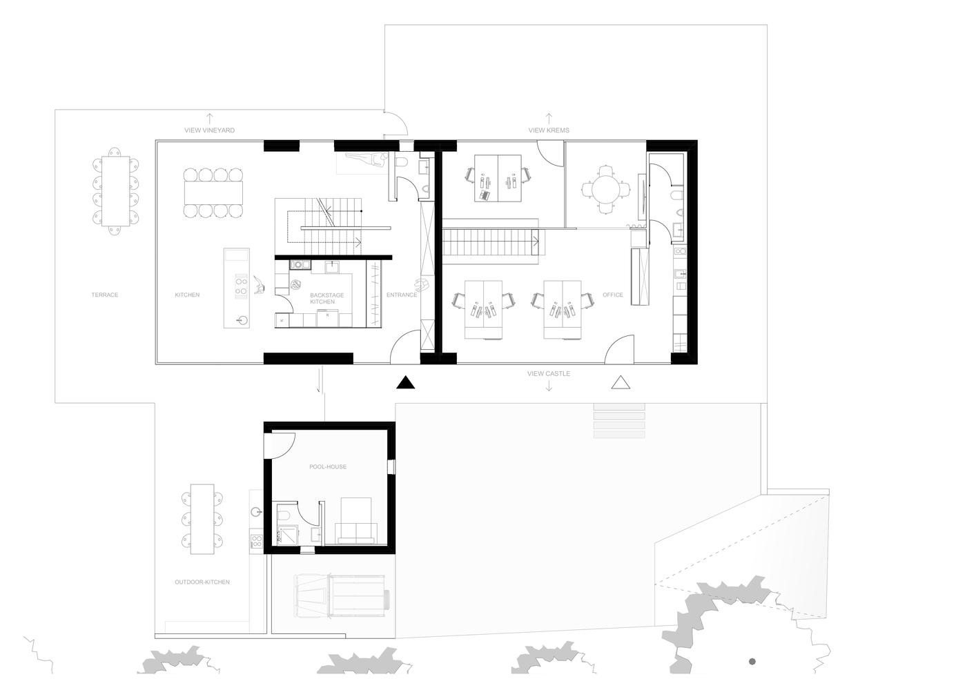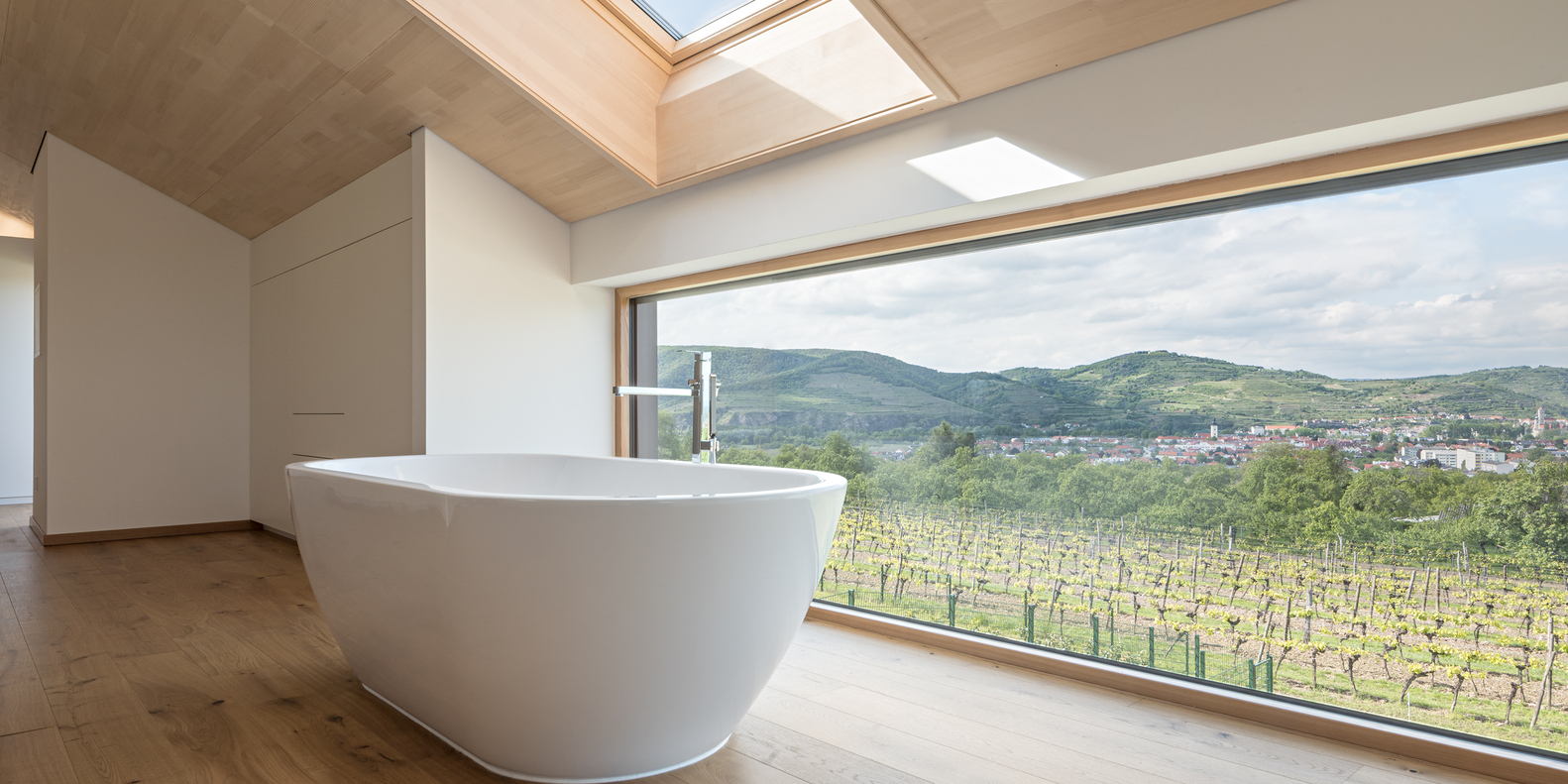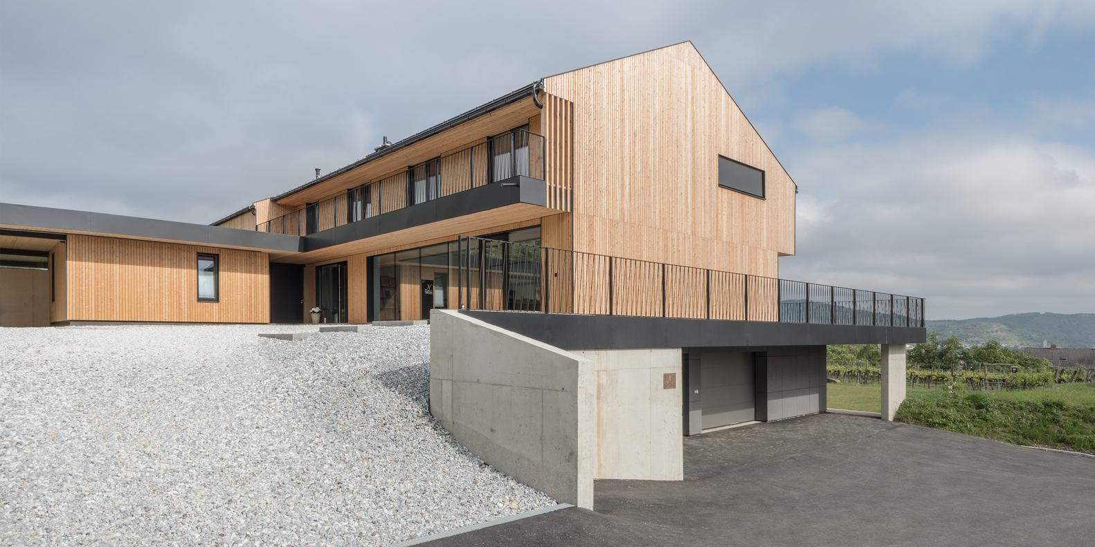 Budynek został doskonale osadzony w topografii nieruchomości, ukazując też wspaniałe dziedzictwo kulturowe miasta, w tym jego piękny zamek Dürnstein oraz opactwo Göttweig. Biura firmy zwrócone są w stronę ulicy i mają osobne wejście oraz dostęp do magazynu. Po przeciwnej stronie domu znajdują się przestrzenie prywatne.Ogromne okna sprawiają, że pomieszczenia zalane są naturalnym światłem i doskonale łączą się z otaczającą dom winnicą. Przeszklenia zostały starannie zaplanowane tak, by otwierały się na krajobrazy, ale jednocześnie zapewniały mieszkańcom odpowiednią prywatność.