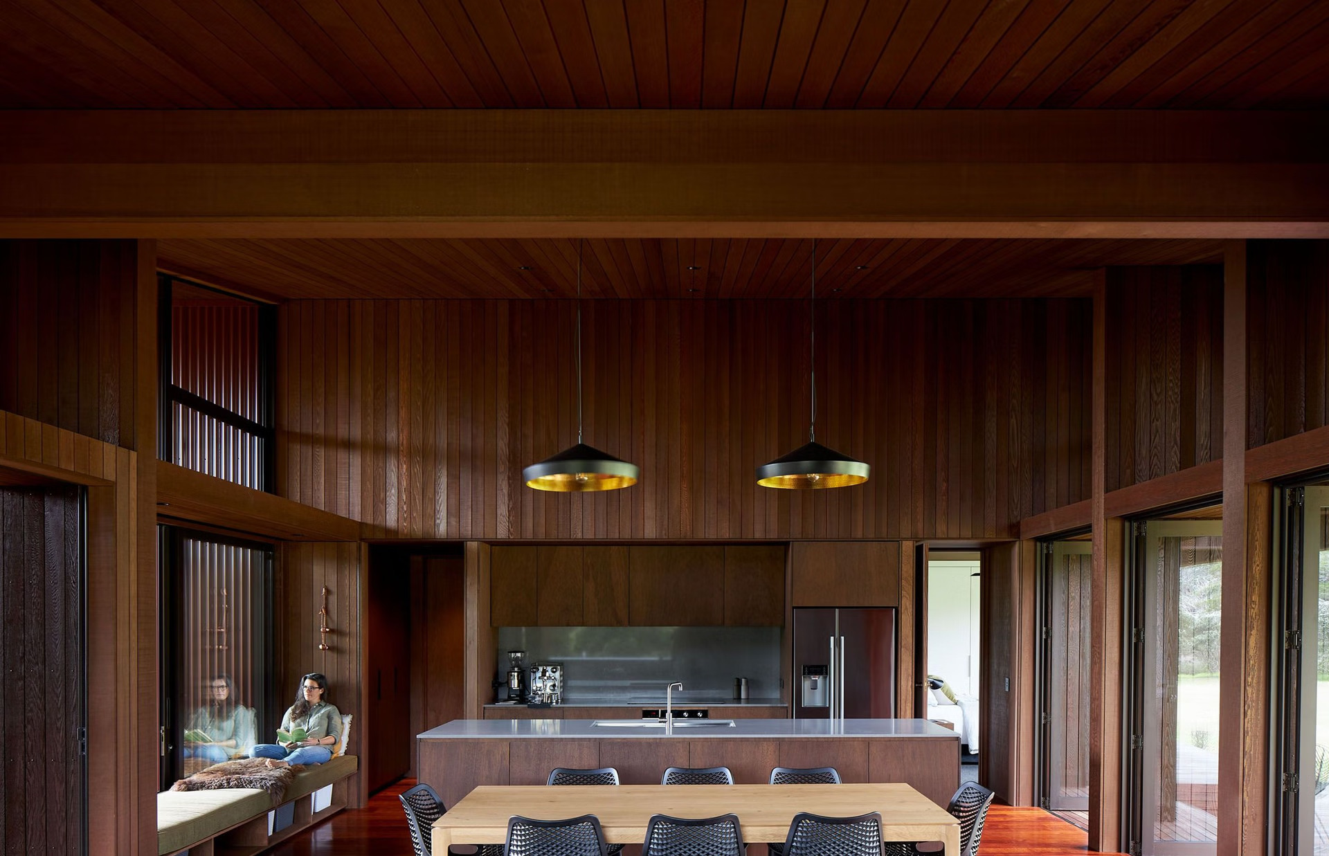 Pod charakterystycznym dwuspadowym dachem harmonijnie łączą się dwie strefy – północna strefa mieszkalna, wykończona eleganckim ciemnym cedrem, oraz południowa strefa sypialna, pokryta bogatą falistą blachą, zapewniającą chłodne wytchnienie w upalne dni. Ciągłość zastosowanych materiałów płynnie zaciera granicę między wnętrzem a zewnętrzem, nadając projektowi unikalnego charakteru nowoczesnej stodoły.