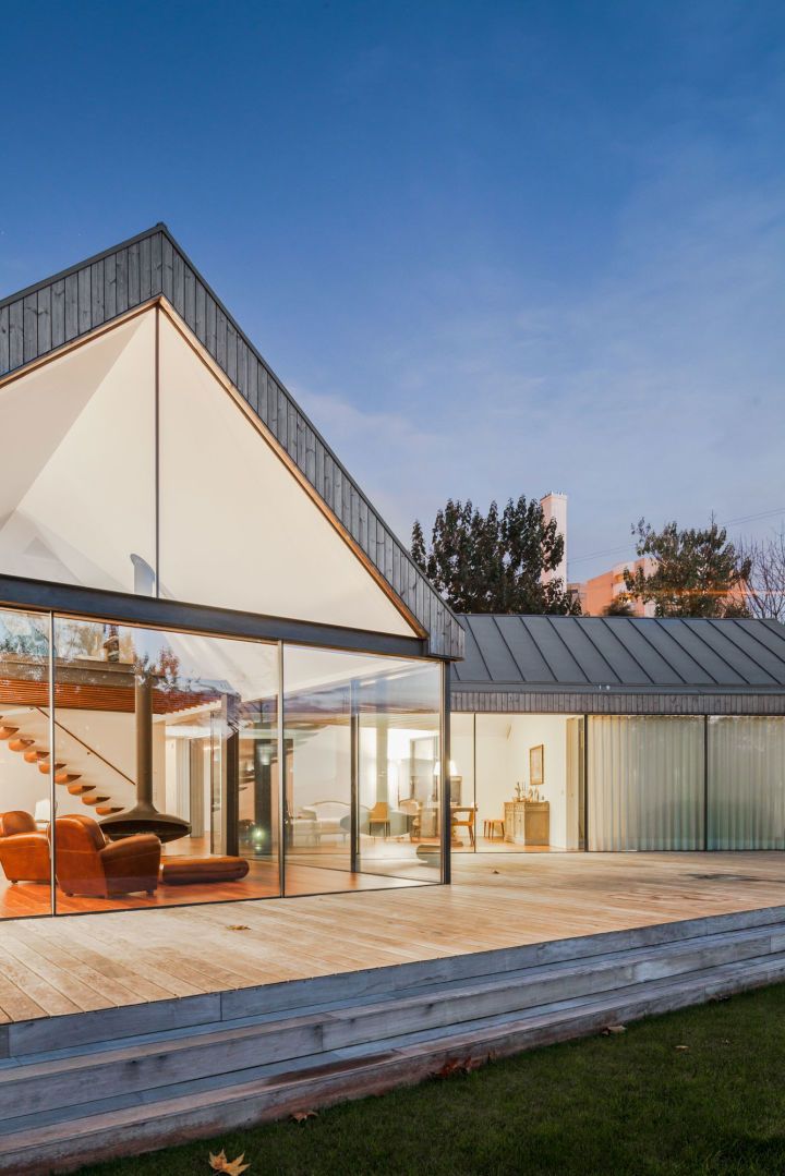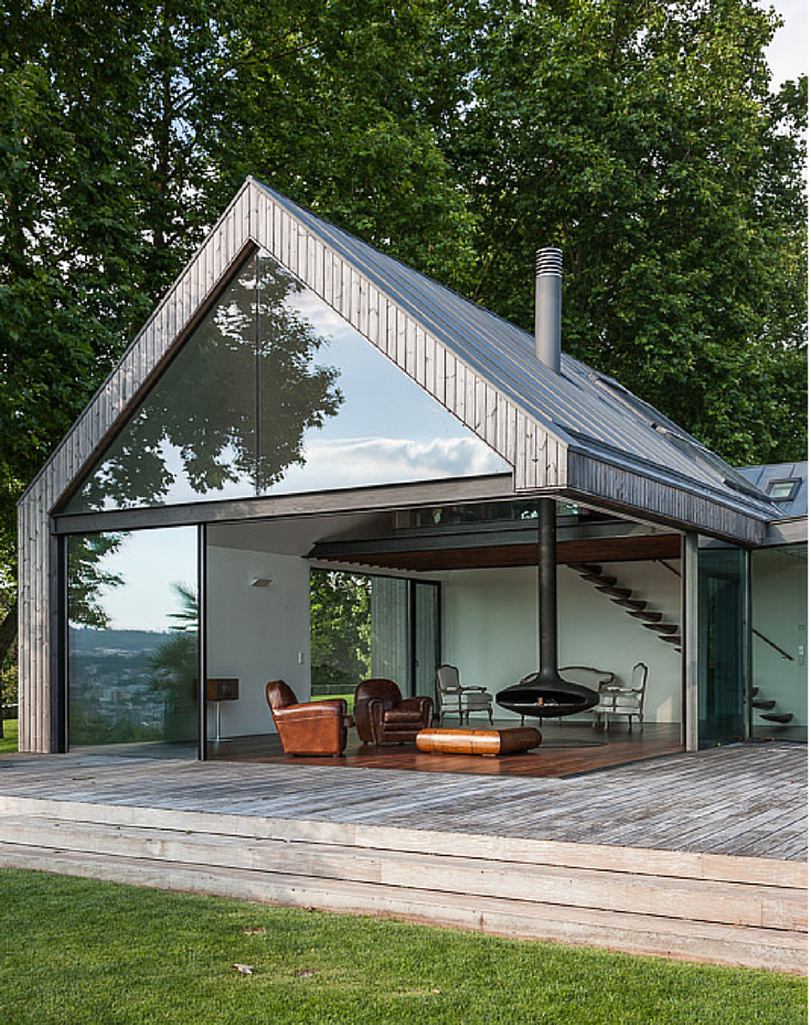 Każdy segment przykryto dachem dwuspadowym, co pozwoliło podkreślić indywidualny charakter poszczególnych brył, a jednocześnie nadać całości harmonijną plastyczność. Choć bryły są od siebie oddzielone, ich bliskie usytuowanie stworzyło centralny dziedziniec z płaskim, transparentnym zadaszeniem i pełnowymiarowymi przeszkleniami. Ta przestrzeń o „hybrydowym” charakterze dematerializuje granice między wnętrzem a zewnętrzem, pozwalając poczuć się jednocześnie w środku i na łonie natury. Dzięki temu spełniono życzenie inwestorów, którzy marzyli o domu silnie powiązanym z otoczeniem.
