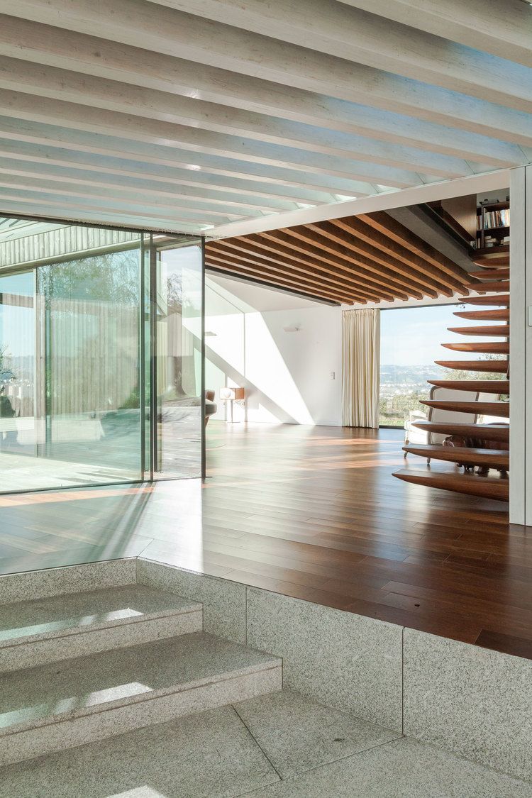 Funkcjonalny układ rozplanowano na trzech kondygnacjach. W piwnicy znalazły się garaż, pomieszczenie na wina oraz pralnia. Główny poziom podzielono na część wschodnią z sypialniami oraz zachodnią, w której ulokowano kuchnię, jadalnię i salon wychodzący na taras z widokiem na całą dolinę. Nad salonem, na antresoli, znalazło się niewielkie, kameralne biuro.