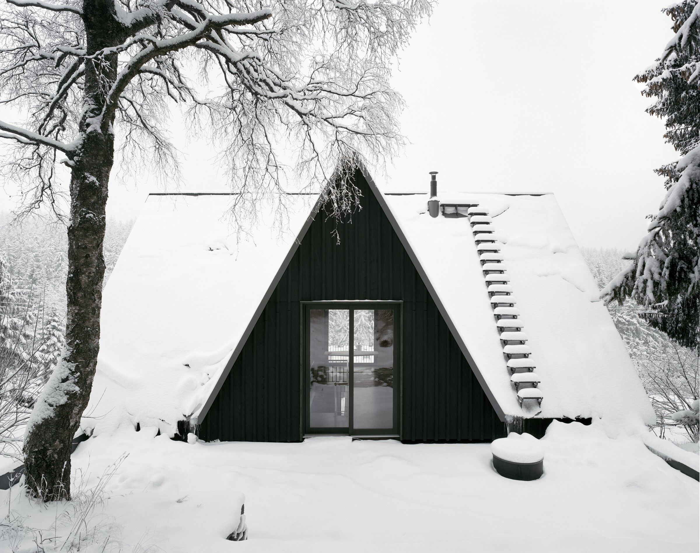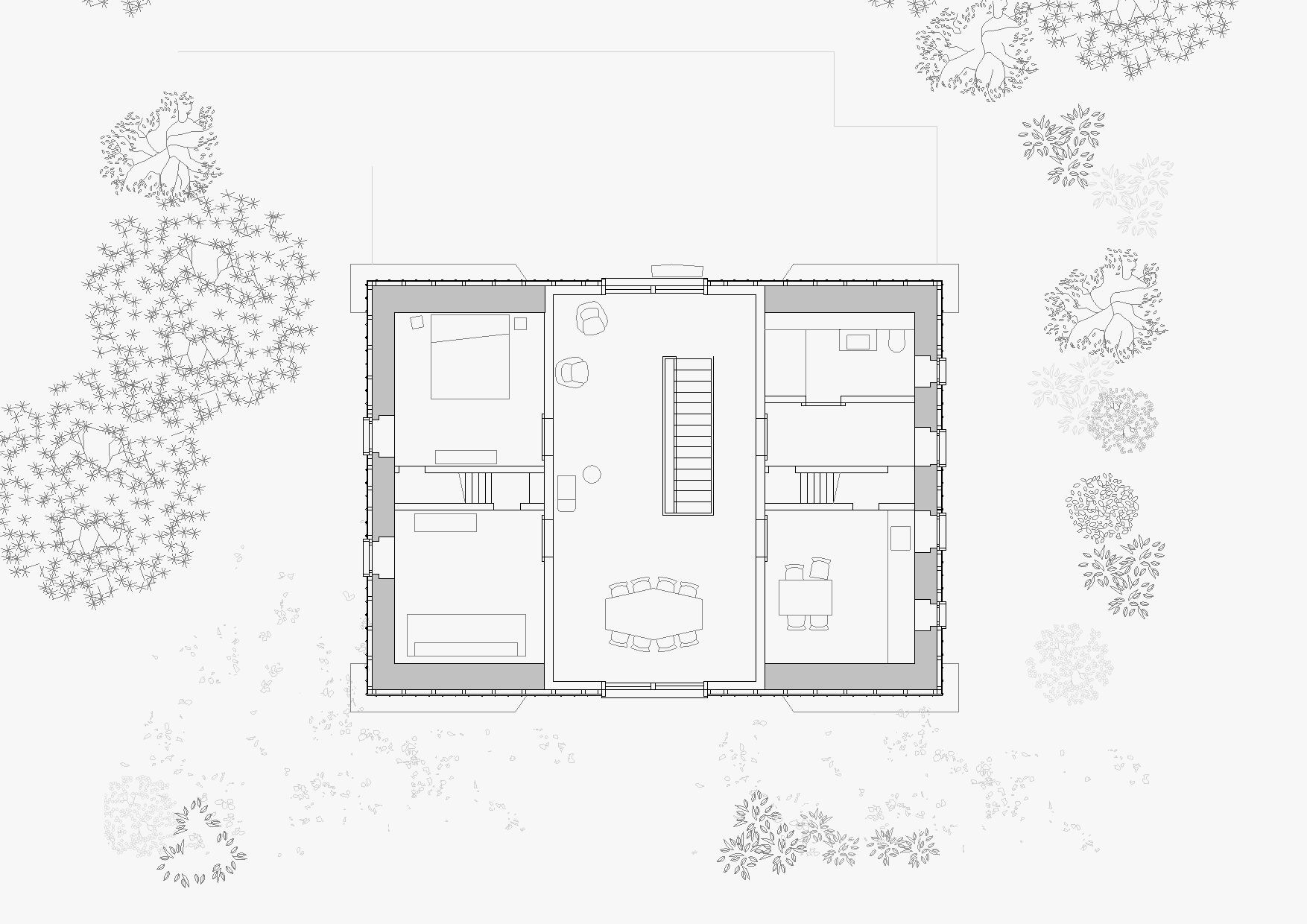 Wejście do domu przywodzi na myśl górską chatę, z surowym, solidnym parterem wykonanym z kamienia łupanego. Wnętrze w całości wykończone jest drewnem iglastym, które w połączeniu z panoramicznym widokiem na las potęguje wrażenie bliskości natury. Wieczorami w przestronnym holu czuć ciepło kominka, wzmacniającego atmosferę zapachem palonego drewna.