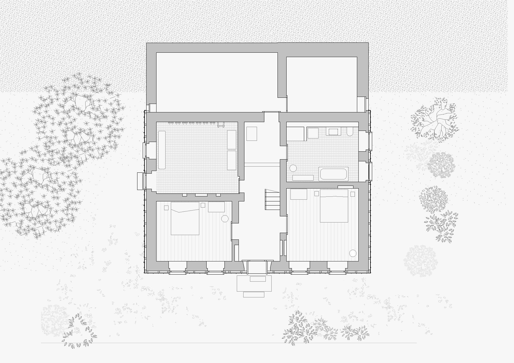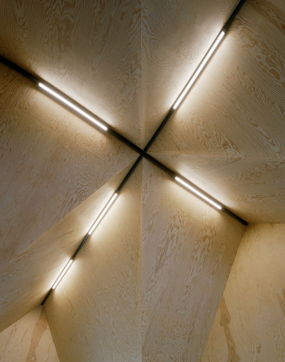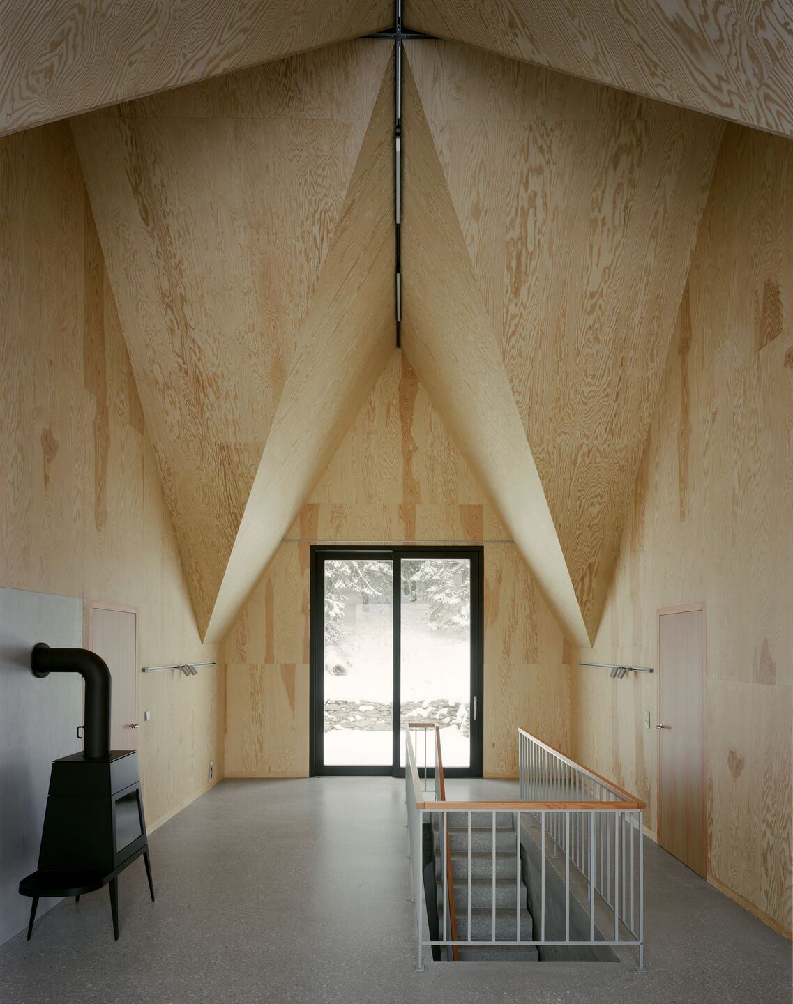 Poddasze w całości wykonane z drewna iglastego skrywa komfortowe przestrzenie mieszkalne, wyłożone sklejką, która subtelnie eksponuje konstrukcję dachu. Widoczna architektura drewniana i detale z betonu architektonicznego podkreślają surowy, ale elegancki styl domu.