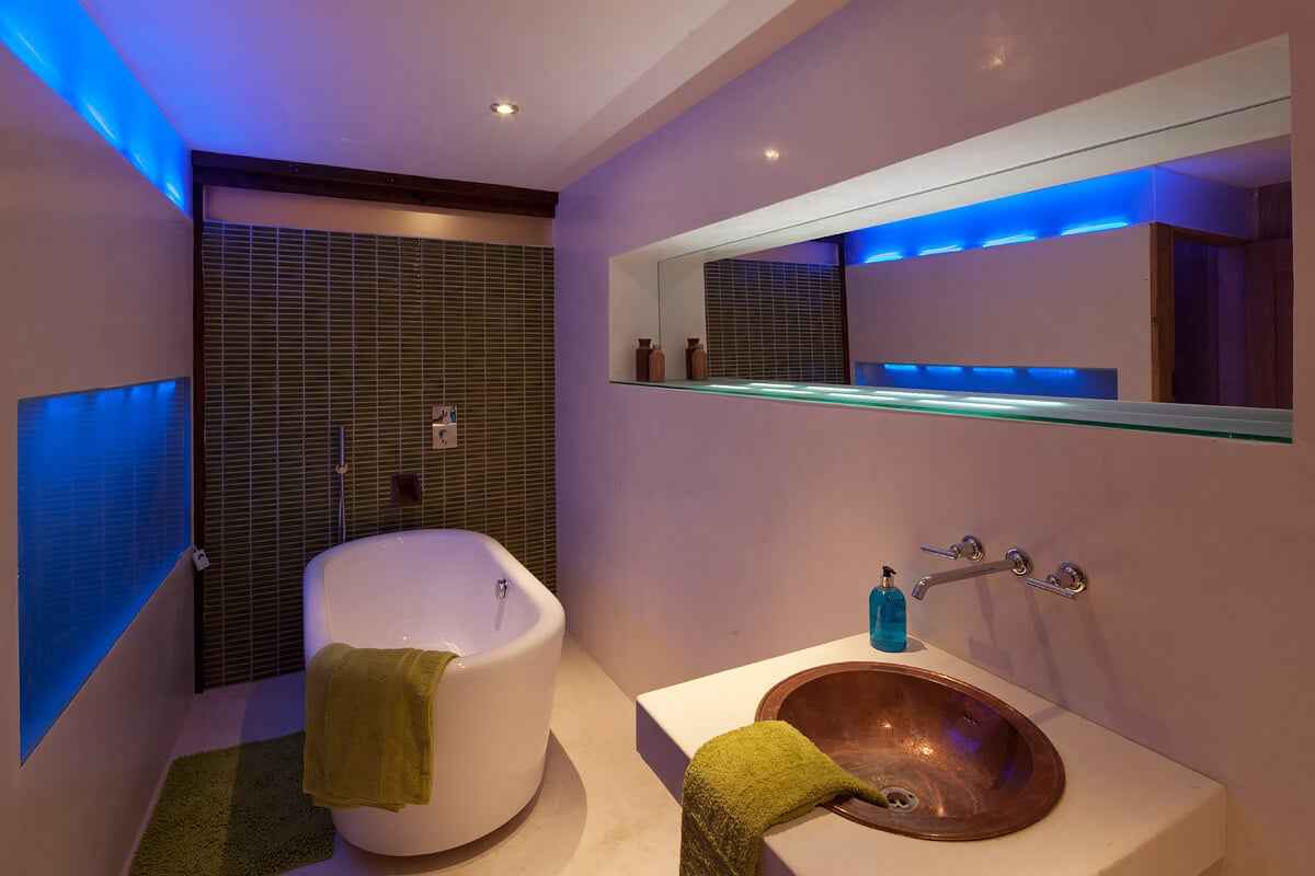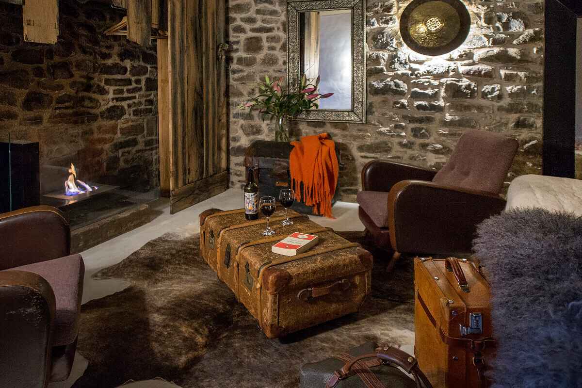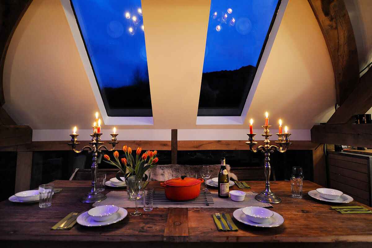 Na dolnym poziomie mieszczą się trzy klimatyczne sypialnie, każda z unikalnym charakterem. Jedna posiada prywatną łazienkę z marokańską wanną w stylu tadelakt i prysznicem, druga ma własny kominek i nowoczesną łazienkę z designerską wanną LED, trzecia oferuje wygodne miejsce do relaksu i oglądania filmów. Na górze czeka otwarta, nowoczesna przestrzeń, w której znajduje się kuchnia z ocynkowaną wyspą, jadalnia z ręcznie robionym stołem z lokalnego drewna, strefa wypoczynkowa z podwójną sofą, stołem bilardowym, projektorem i designerskim paleniskiem. Uzupełnieniem są nietypowe detale – słomiane siedziska i antyczne walijskie ławy.