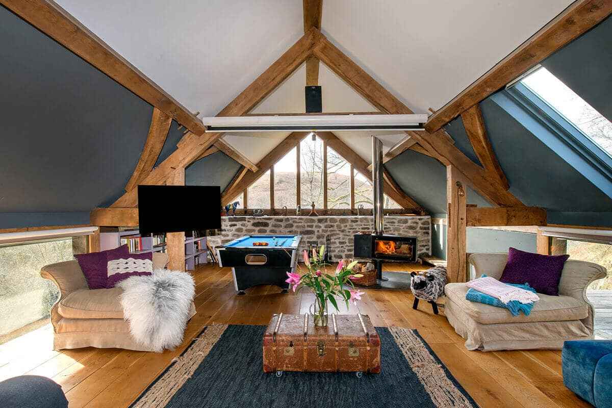 Zanurz się w walijskiej przygodzie w odrestaurowanej wiejskiej stodole, położonej w sercu hrabstwa Powys, otoczonej wrzosowiskami i lasami zarządzanymi przez National Trust. Przestrzeń została przekształcona przez Davida i Anjanę Devoy z XIX-wiecznej kamiennej stodoły rolniczej w wyjątkowe miejsce na wypoczynek dla większych grup, rodzin i przyjaciół. Stodoła stanowi idealną bazę do pieszych wędrówek, wieczornych rozmów przy winie i wspólnego gotowania. Jej układ to odwrócone podejście do życia – na parterze znajdują się sypialnie i łazienki, a jasna, panoramiczna przestrzeń dzienna z kuchnią mieści się na piętrze, skąd rozciągają się malownicze widoki na las i zachody słońca nad wrzosowiskami.