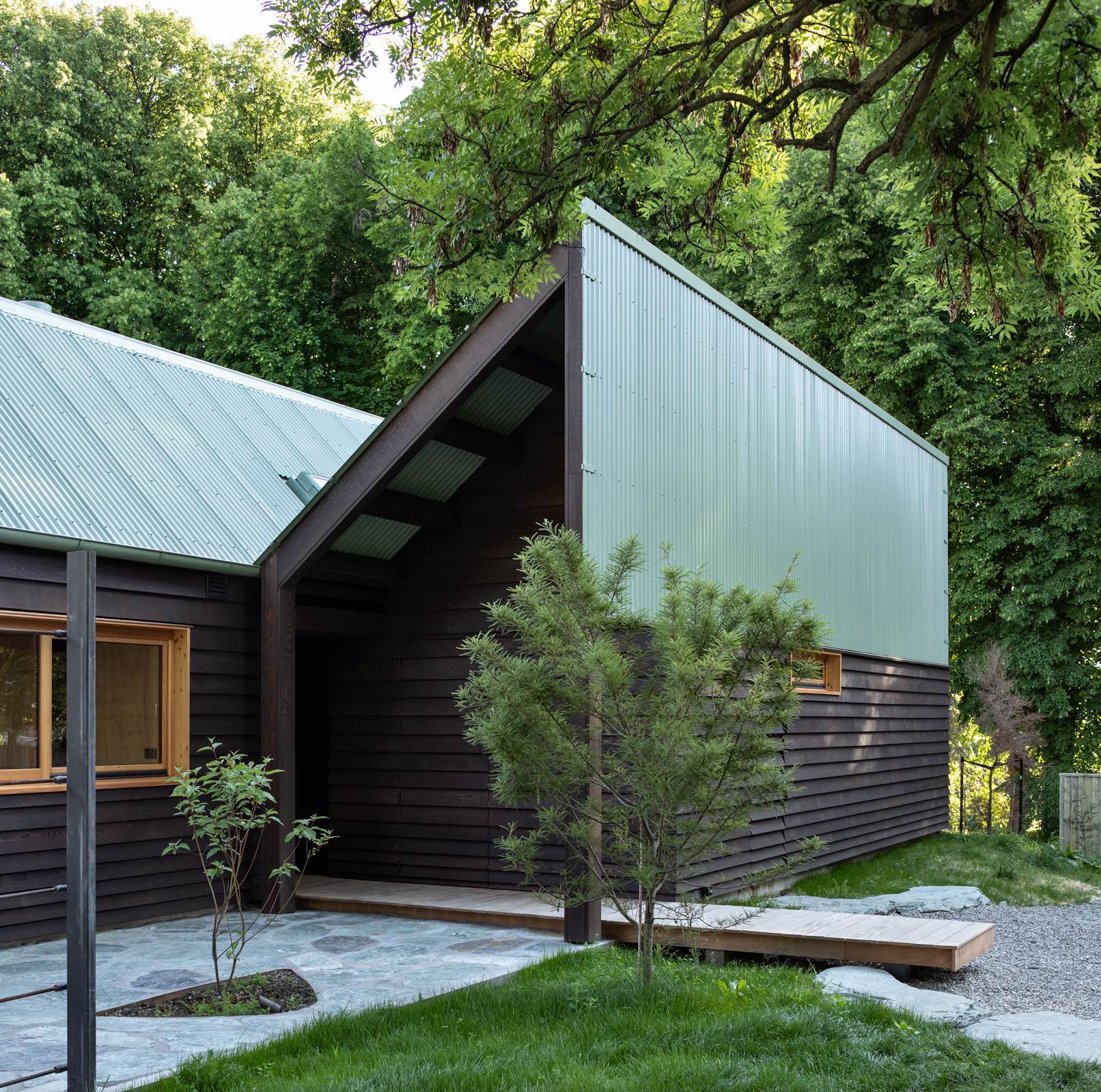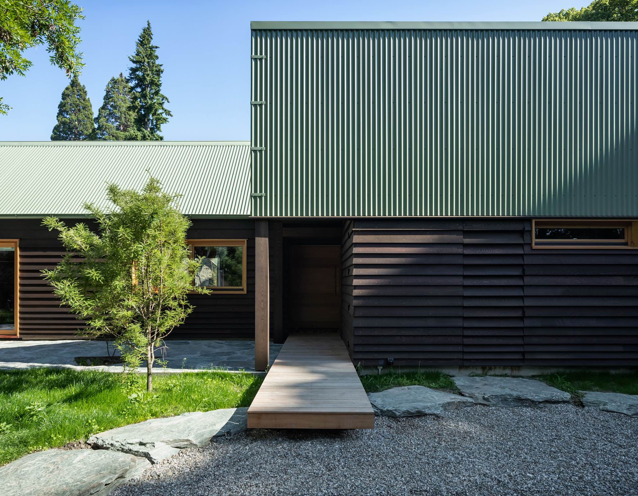 Bryła budynku opiera się na połączeniu trzech geometrycznie odmiennych form – dwóch klasycznych brył z dachem dwuspadowym oraz jednej z dachem o charakterystycznym, ściętym profilu. Ich zestawienie tworzy trzy kameralne dziedzińce, które pełnią rolę zewnętrznych salonów i miejsc spotkań. Drewniana elewacja w ciemnym wybarwieniu harmonizuje z zielonym, karbowanym dachem z blachy, a całość wtapia się w górski pejzaż, nawiązując do architektury tradycyjnych nowozelandzkich osad.