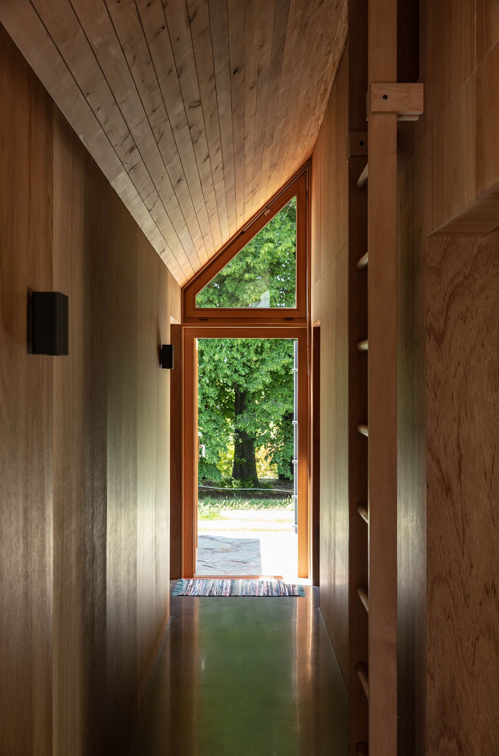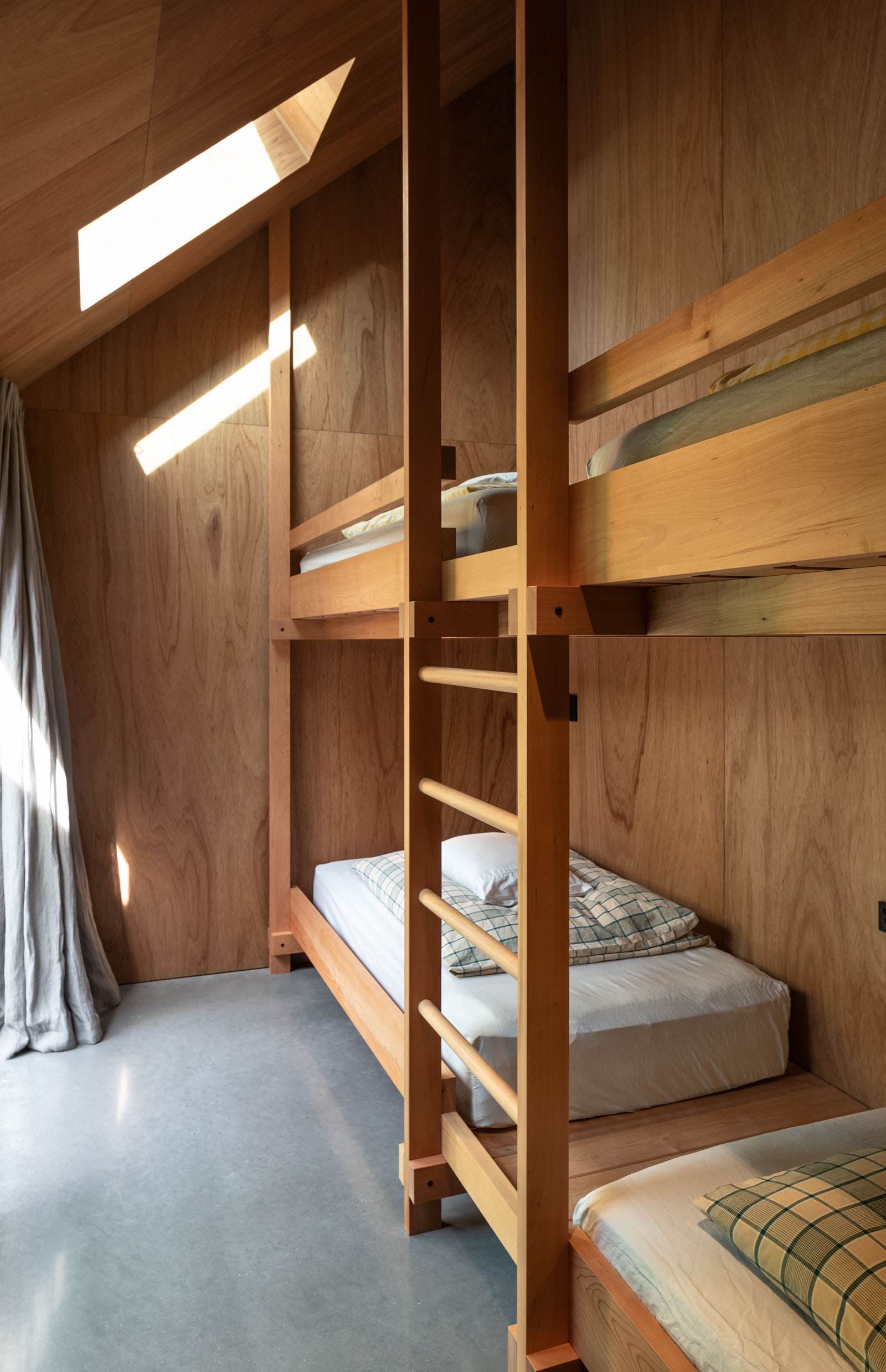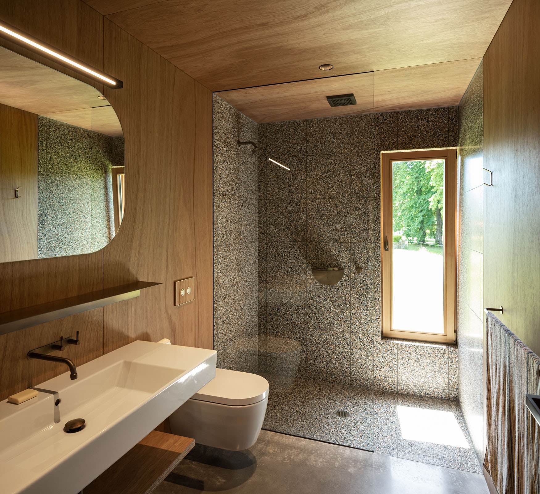Wnętrza wykończono w jasnym drewnie, betonie i terrazzo, co podkreśla ich naturalny, trwały charakter. Drewniane okładziny ścian i sufitów tworzą przytulną, ciepłą atmosferę, a delikatne metalowe detale i dopracowane stolarki nadają całości elegancji.