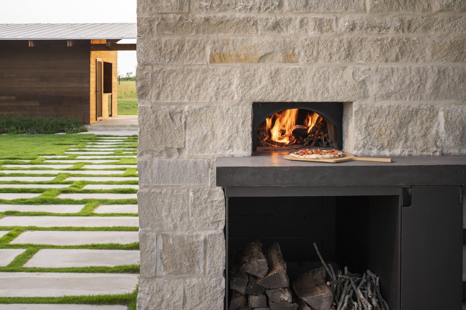 Weranda, będąca przedłużeniem przestrzeni dziennej, oferuje komfortowe miejsce do obserwacji ptaków i relaksu, wyposażone w piec opalany drewnem do pieczenia pizzy i chleba. To rozwiązanie nie tylko podkreśla charakter domu, ale także sprzyja integracji z otoczeniem i domową atmosferą.