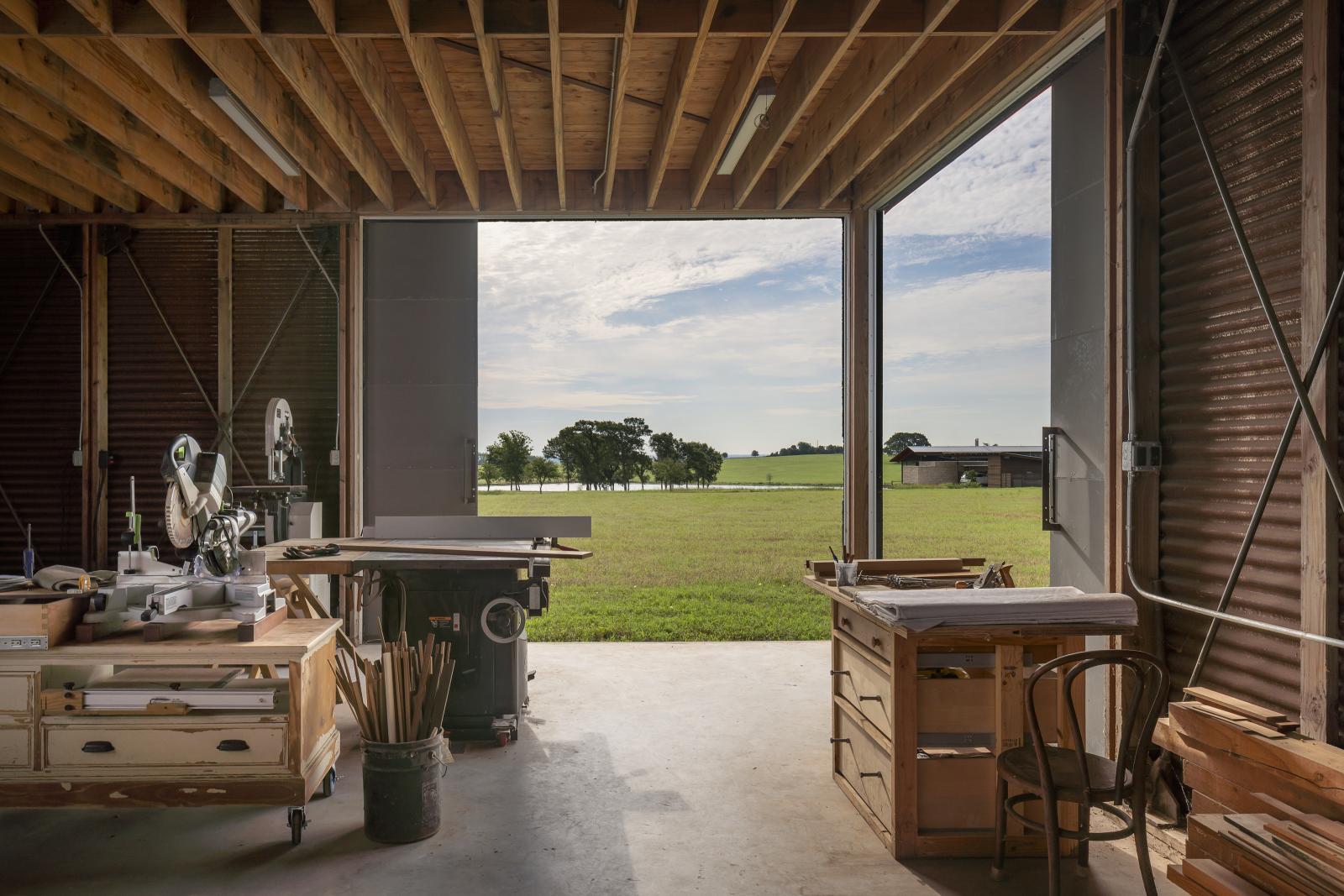 Wyjątkowym elementem tej inwestycji jest nowoczesna stodoła, pełniąca funkcję stolarni i miejsca pracy. Właściciel, pasjonat obróbki drewna, samodzielnie wykonał niestandardowe szafki z drewna daglezji, które znalazły się w całym domu. Dodatkowo, podłogi z orzecha, wykonane z drzewa rosnącego na farmie członka rodziny, nadają wnętrzom ciepła i głęboko osobistego znaczenia, jednocześnie nawiązując do rolniczych tradycji rodziny.