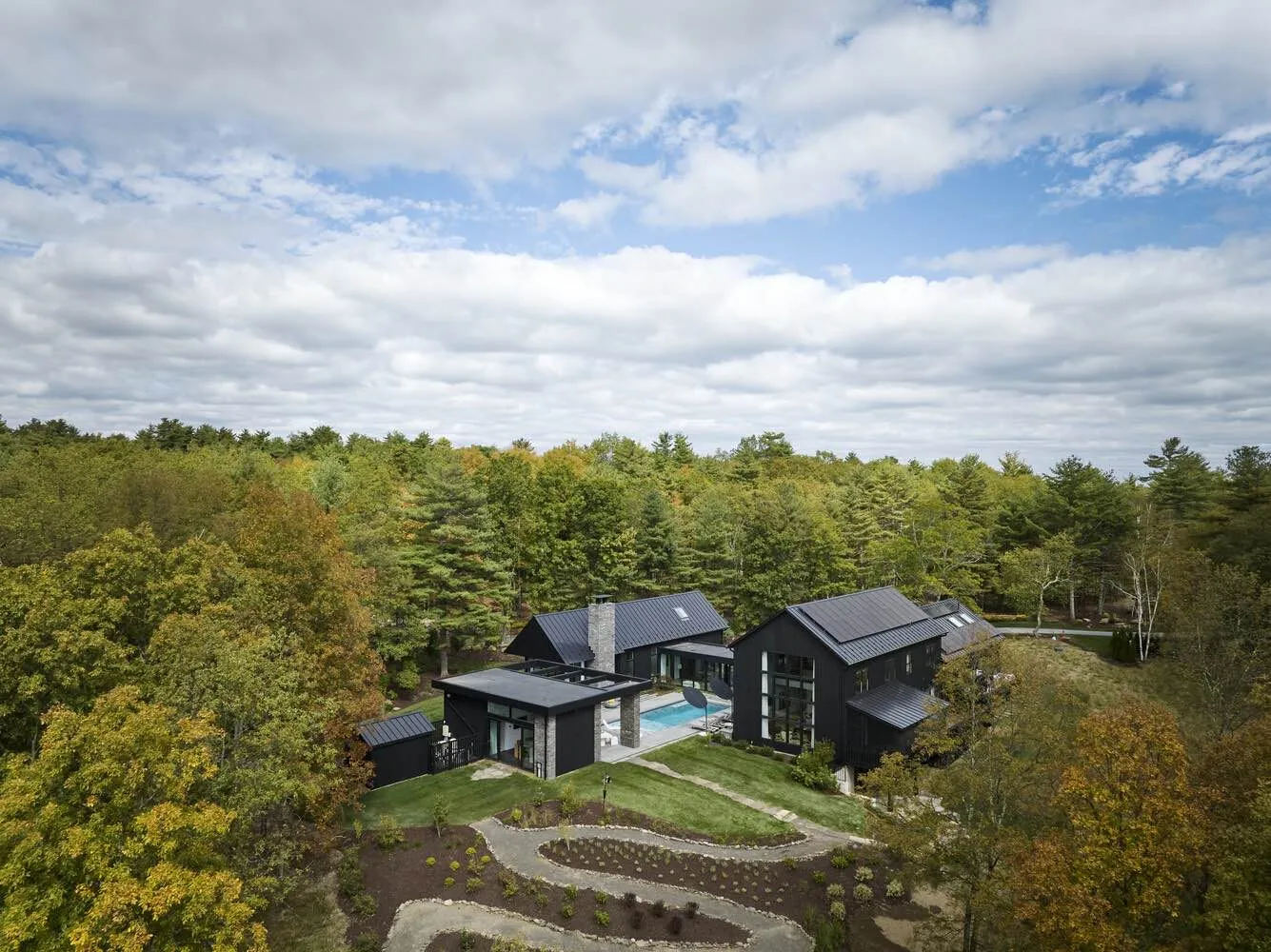 Wass House powstał w miejscowości Accord w stanie Nowy Jork, na pochyłej łące otoczonej gęstym lasem. To krajobraz spokojny i rozległy, w którym architektura ma szansę funkcjonować w bliskiej relacji z naturą. Projekt autorstwa Studio MM Architect jest kompleksową modernizacją istniejącego domu z dachem dwuspadowym, przekształconego w wielobryłową rezydencję skupioną wokół dziedzińca i basenu.