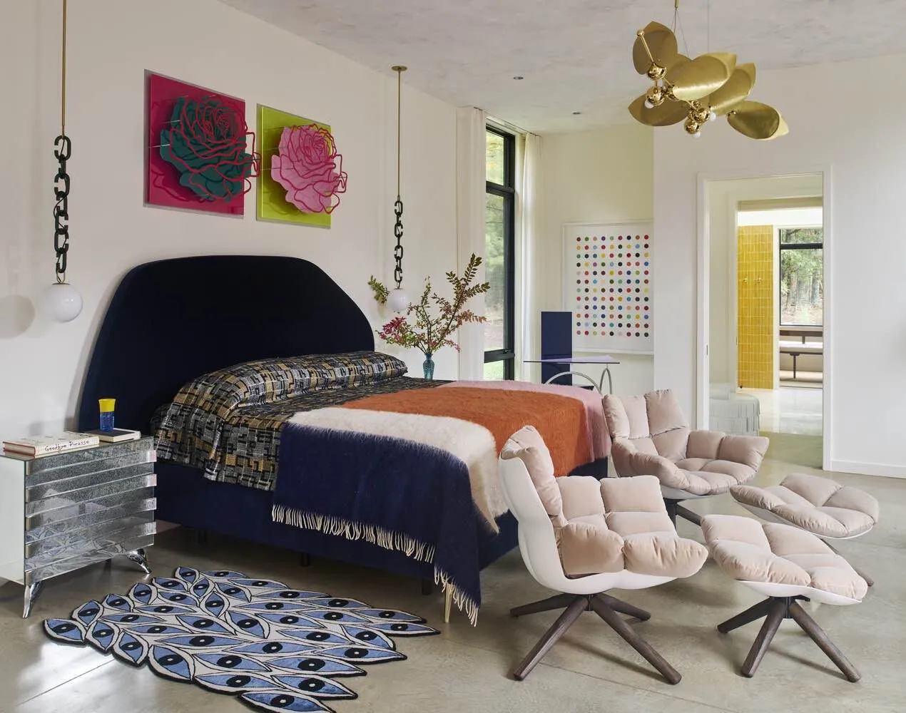 Po przeciwnej stronie szklanego wejścia zaprojektowano nową główną sypialnię właścicieli. Wejście do niej akcentuje kolorowa, przesuwna ściana, która rzuca barwne refleksy na betonową posadzkę. Wnętrze łączy otwartość i intymność, a starannie zaprojektowane meble stolarskie, wyraziste płytki w łazience oraz projektor ukryty w suficie podkreślają indywidualny charakter przestrzeni.