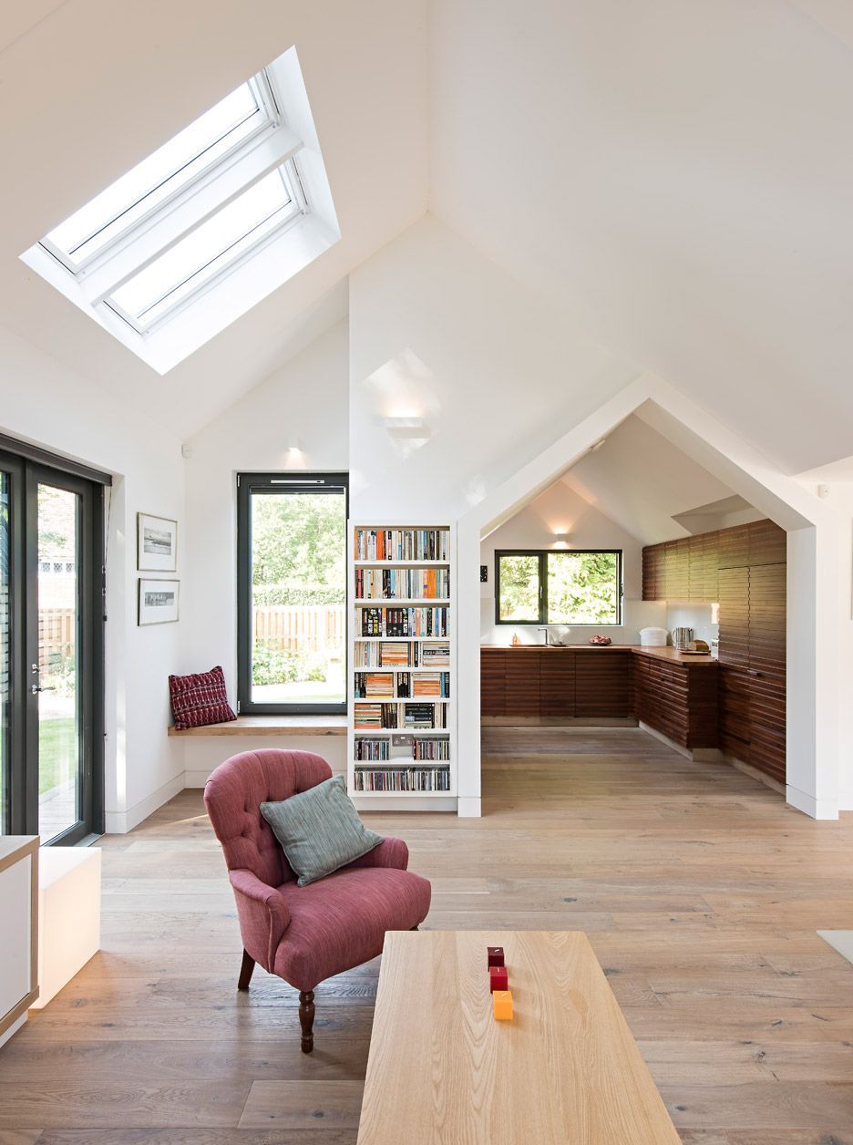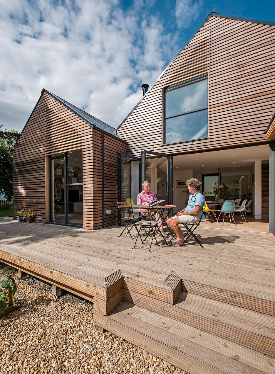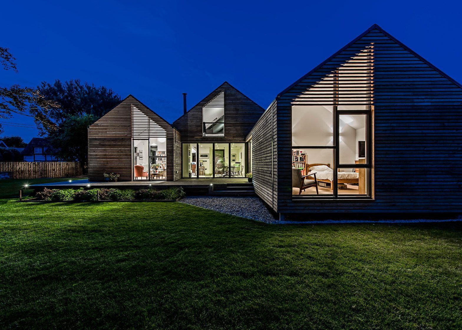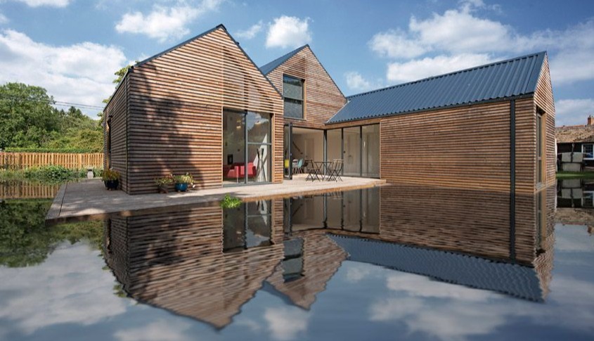 Ta obita modrzewiem nowoczesna stodoła „Water Lane” to projekt londyńskiej firmy Baca Architects, specjalizującej się w pływającej architekturze. Dom został zbudowany w Oxfordshire w terenie narażonym na podtopienia, dlatego stoi na drewnianych klockach, a jego uniesiony nad ziemią taras pozwala wodzie przepływać pod budynkiem bez ryzyka zalania. Budynek składa się z czterech połączonych części z dwuspadowym dachem, w których rozmieszczono salon, jadalnię, kuchnię oraz część sypialną. Zróżnicowane wysokości sufitów i wbudowany kominek tworzą wyraźny podział przestrzeni, a duże przeszklenia otwierają dom na taras i ogród, zapewniając kontakt z naturą i optymalne doświetlenie wnętrz.