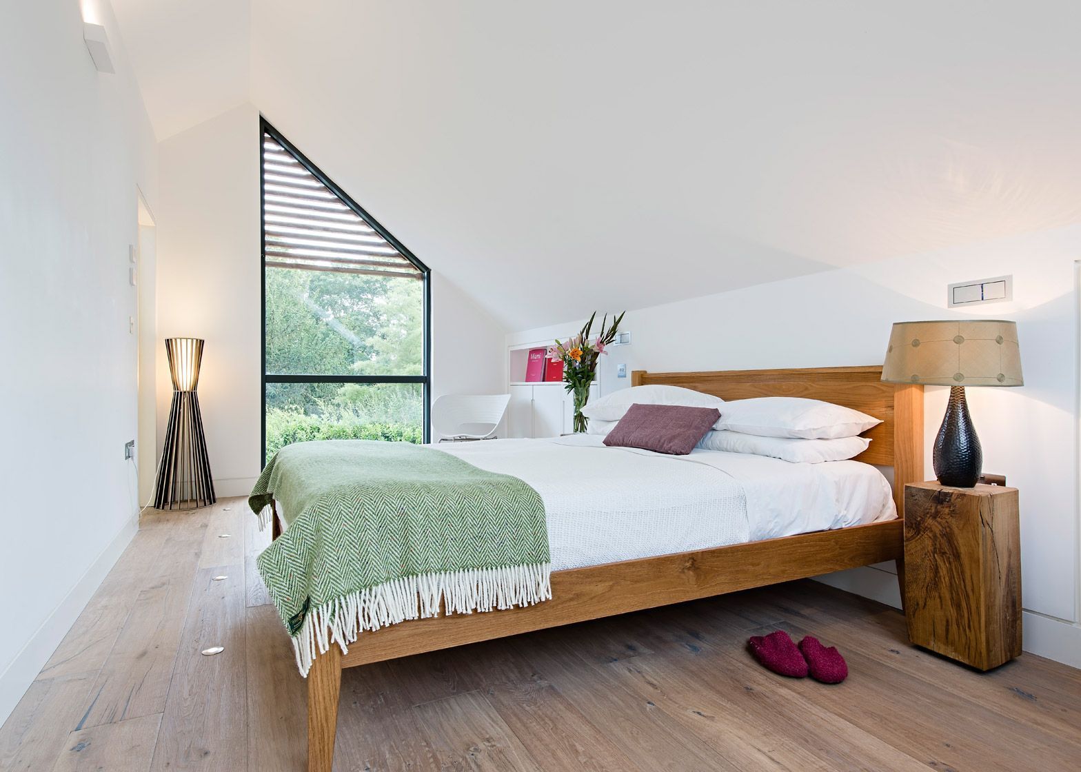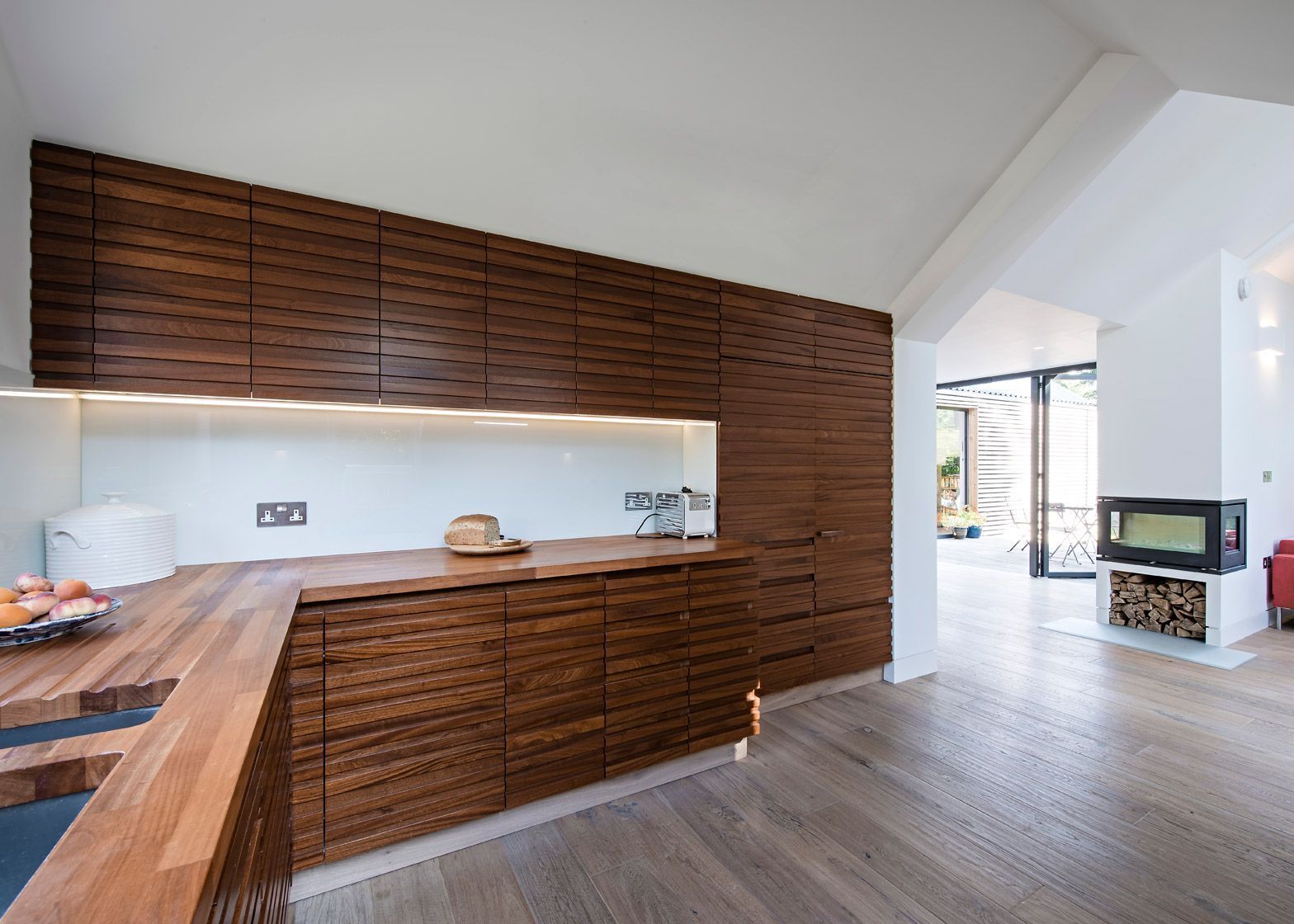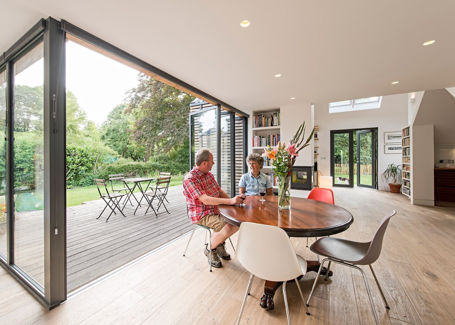Ta obita modrzewiem nowoczesna stodoła „Water Lane” to projekt londyńskiej firmy Baca Architects, specjalizującej się w pływającej architekturze. Dom został zbudowany w Oxfordshire w terenie narażonym na podtopienia, dlatego stoi na drewnianych klockach, a jego uniesiony nad ziemią taras pozwala wodzie przepływać pod budynkiem bez ryzyka zalania. Budynek składa się z czterech połączonych części z dwuspadowym dachem, w których rozmieszczono salon, jadalnię, kuchnię oraz część sypialną. Zróżnicowane wysokości sufitów i wbudowany kominek tworzą wyraźny podział przestrzeni, a duże przeszklenia otwierają dom na taras i ogród, zapewniając kontakt z naturą i optymalne doświetlenie wnętrz.
