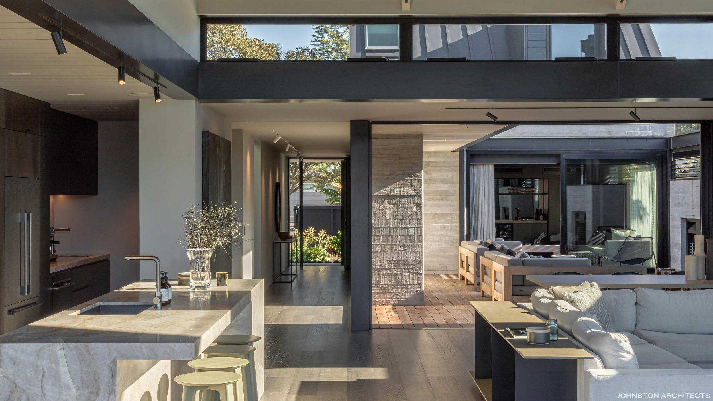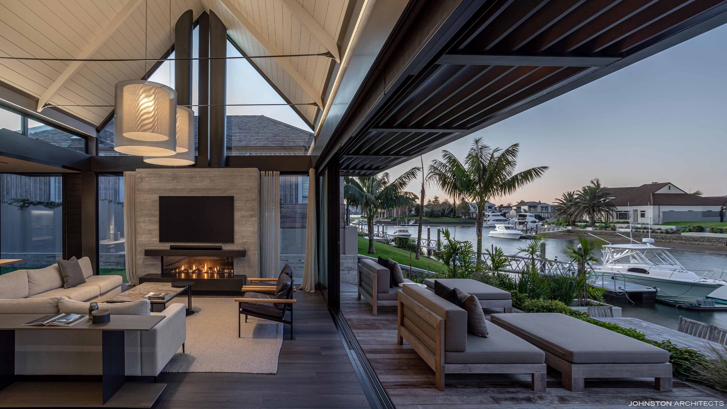 Wzdłuż północnej granicy posesji biegnie zielony trawnik, pełniący rolę ścieżki dla pieszych i pojazdów, prowadzącej od rampy do wodowania łodzi aż po zewnętrzny prysznic i suszarnię sprzętu. Centralnym punktem domu jest loggia na dziedzińcu, otoczona przestrzeniami o różnym przeznaczeniu. W tylnej części posesji znajduje się gabinet z mediami i barem, a od frontu przestronna strefa dzienna z kuchnią i jadalnią. Duże przesuwne drzwi pozwalają na niemal całkowite otwarcie domu, łącząc dziedziniec z wodami kanału.
