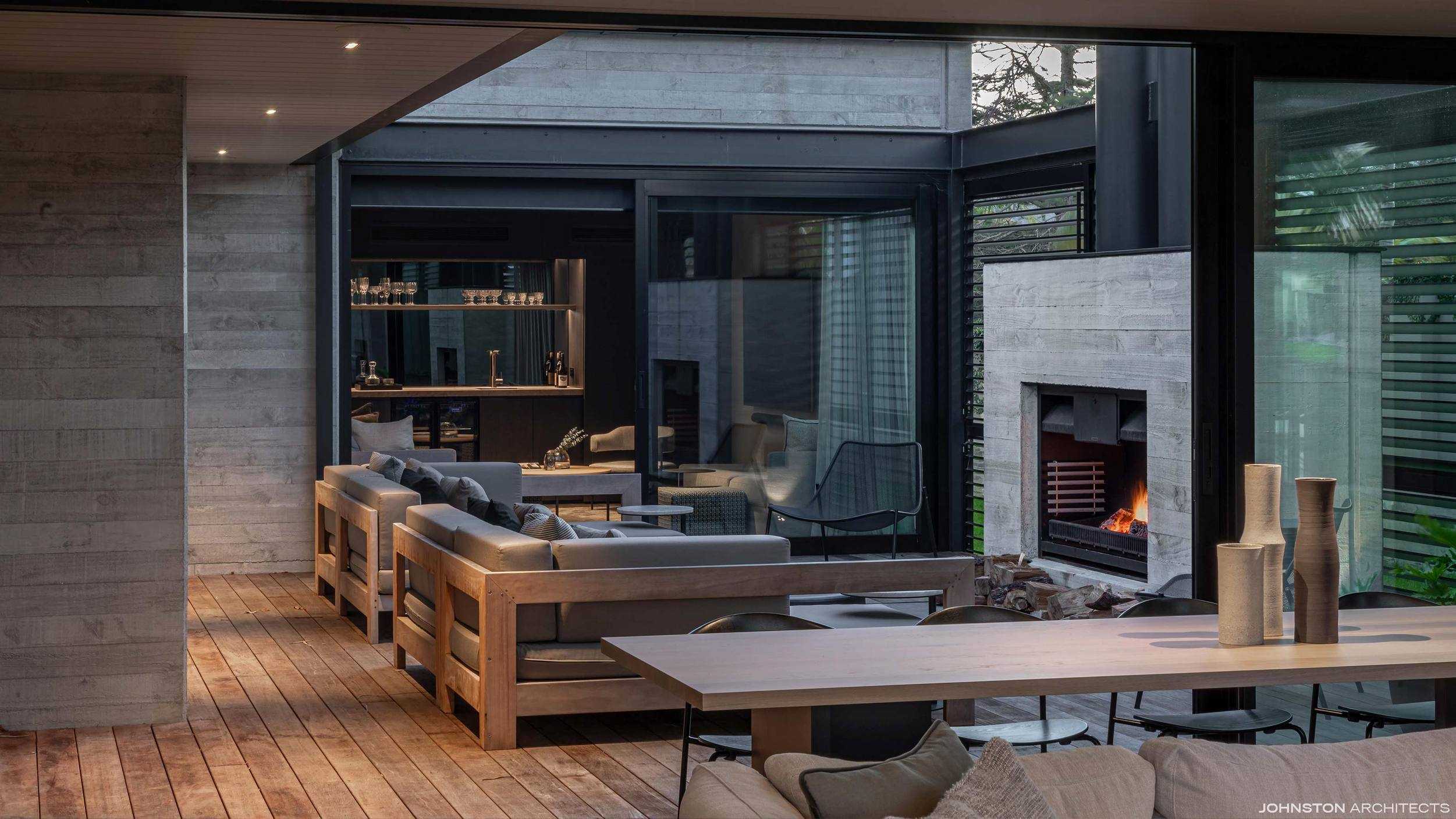 Loggia wyposażona w zewnętrzny kominek i grill sprzyja rozrywce przez cały rok. Regulowane przesuwne żaluzje zapewniają ochronę przed letnim słońcem i nadmorskim wiatrem. Wykorzystano trwałe i łatwe w utrzymaniu materiały: stalowe detale konstrukcji zestawione z solidnymi betonowymi ścianami o fakturze desek, a także duże przeszklenia, które wprowadzają światło do wnętrz.