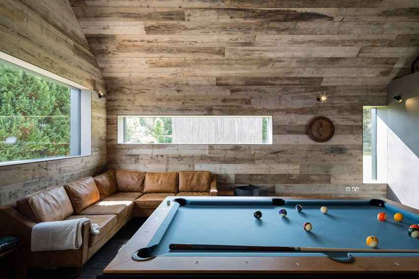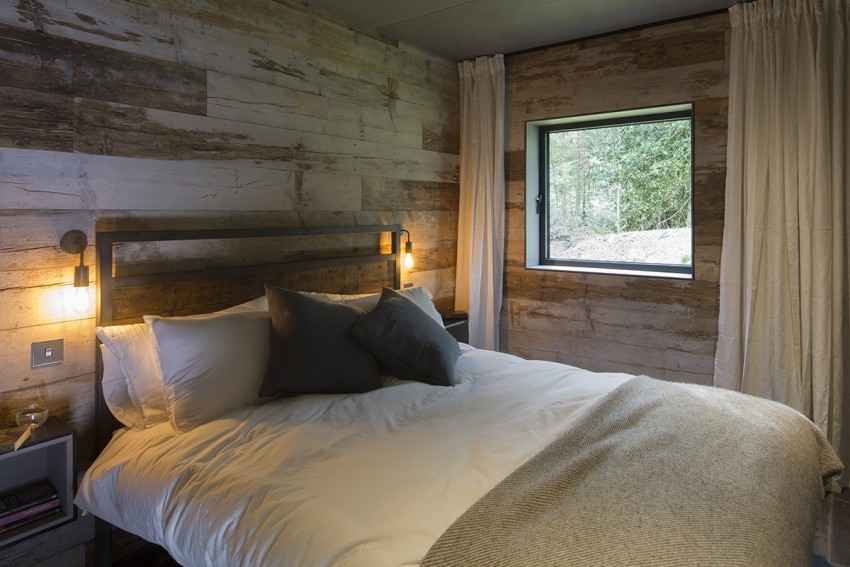 W środku znalazły się dwie kameralne sypialnie, łazienka, otwarty salon z barem oraz strefą zabawy, a także antresola dostępna po stalowej drabinie. Meble wykonano na zamówienie, łącząc Valchromat z czarną stalą, a bar wyposażono w LED-owe podświetlenia, lodówkę i zmywarkę. Na zewnątrz do dyspozycji gości przygotowano drewniany taras z jacuzzi, leżakami, piecem do pizzy i schowkiem na drewno. Wieczorami całość rozświetlają starannie rozmieszczone lampki LED, tworząc atmosferę idealną zarówno na relaks, jak i kameralne spotkania.